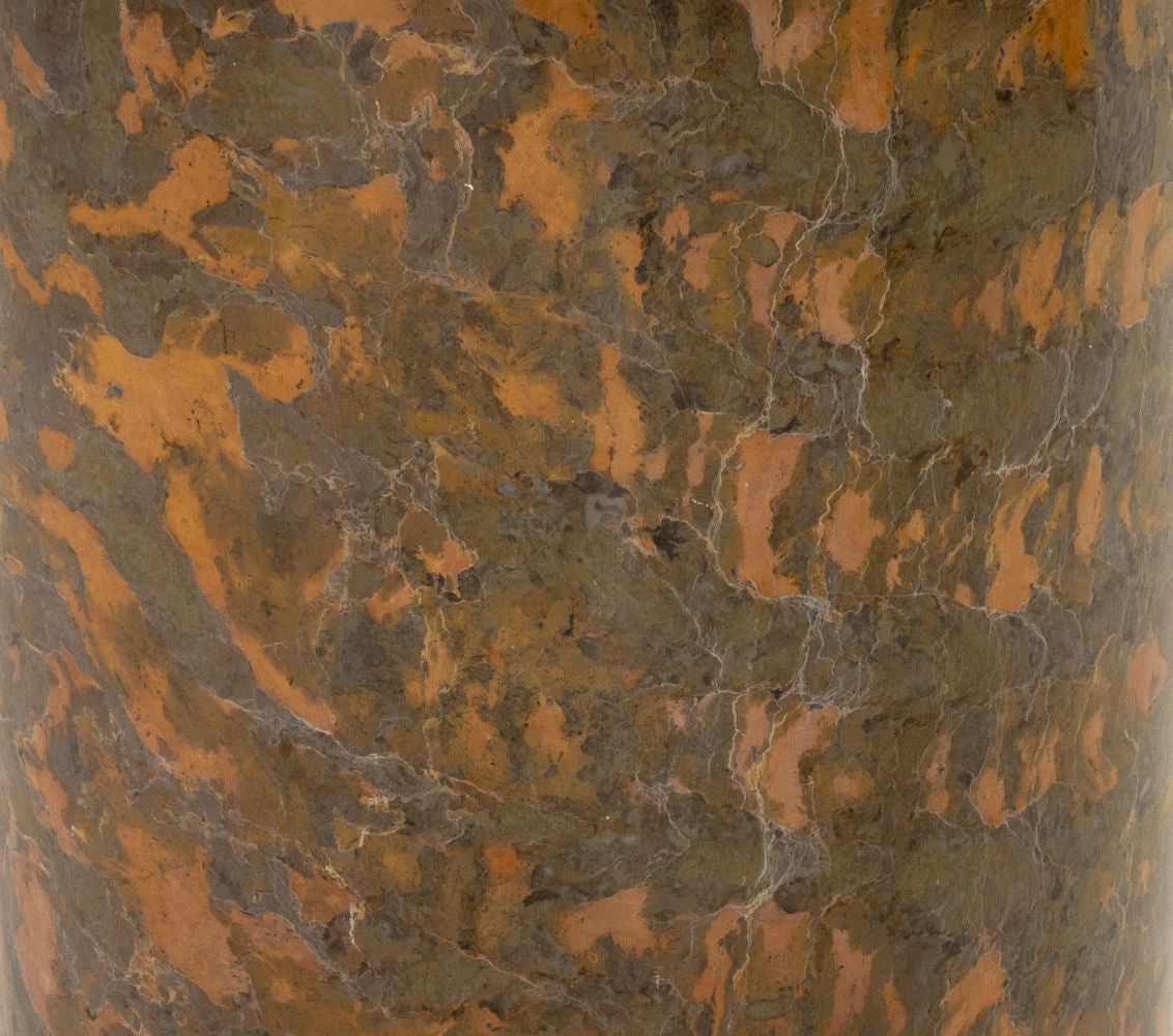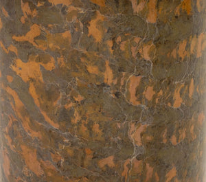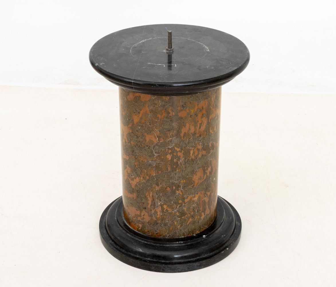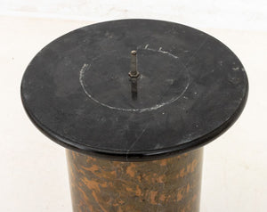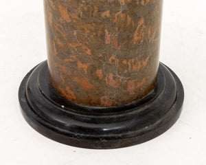 French Marble Pedestal, 20th century, the circular black marble top above a pink and grey mottled marble column, on a conforming base. 24" H x 16" Diameter. Keywords: Furniture, Antique, Display stand, Plant stand, Sculpture gallery, Column, Plinth, Carved Stone, Specimen Marble, Interior Design, Decorative Arts