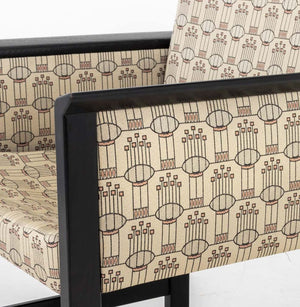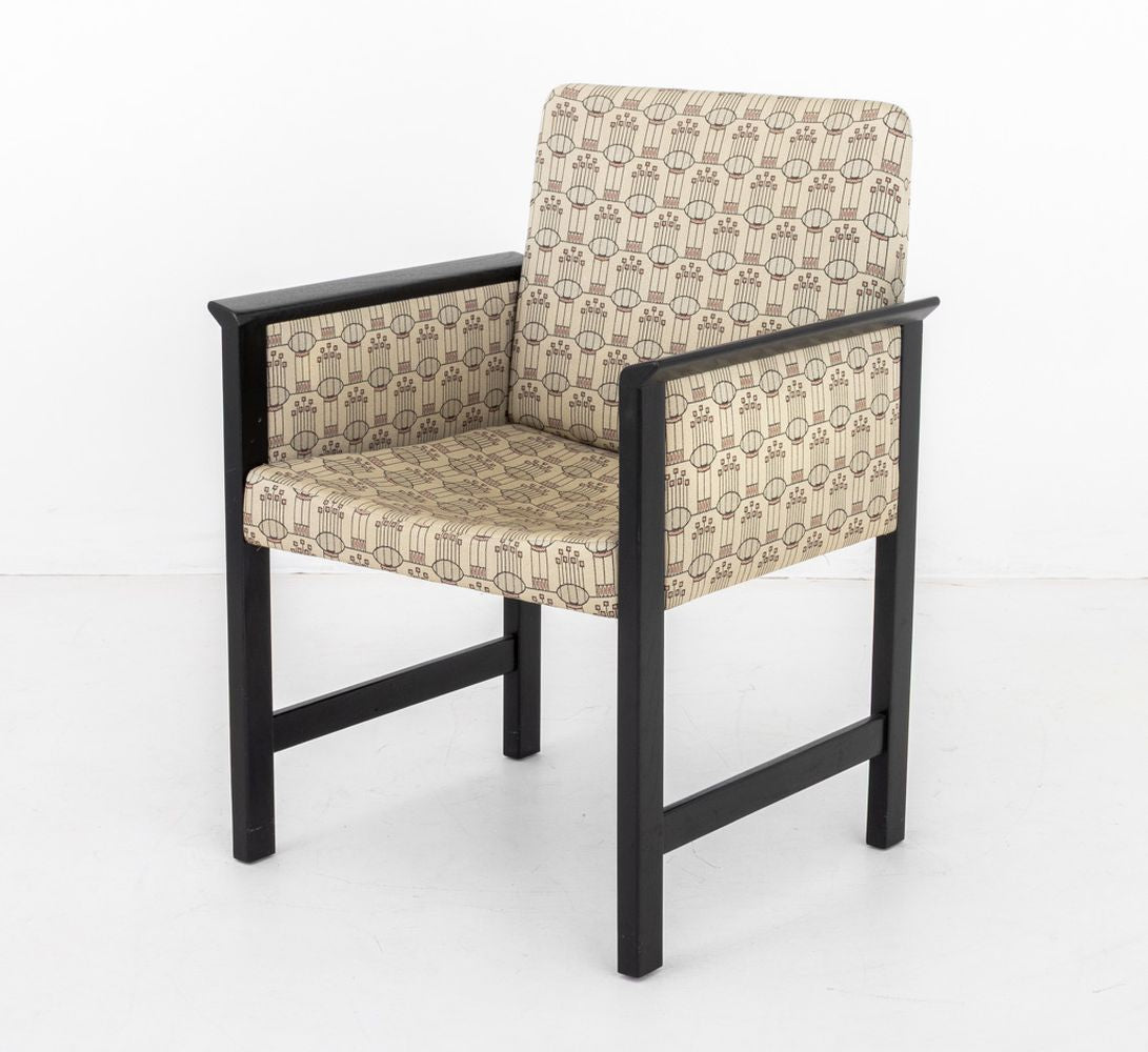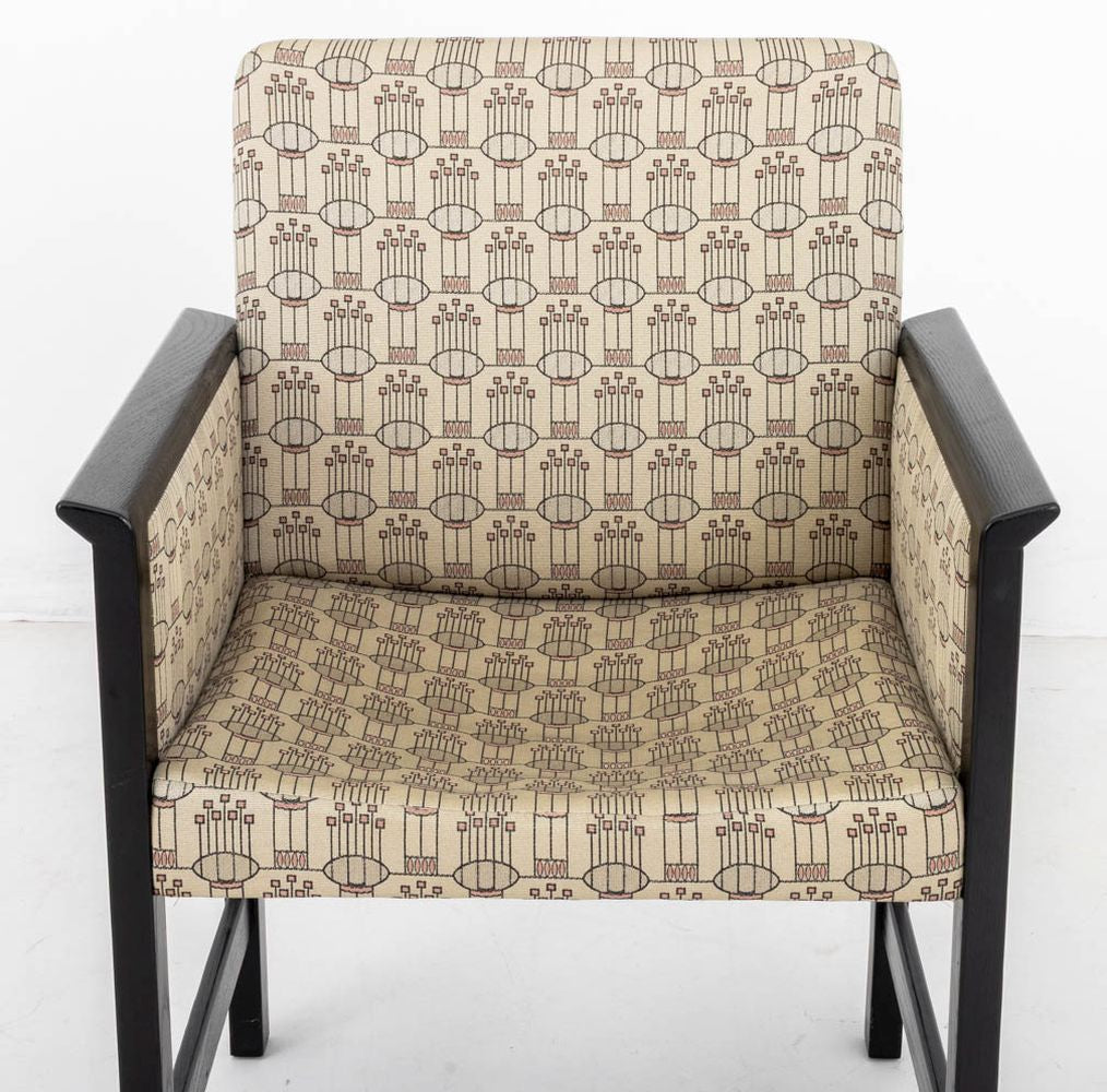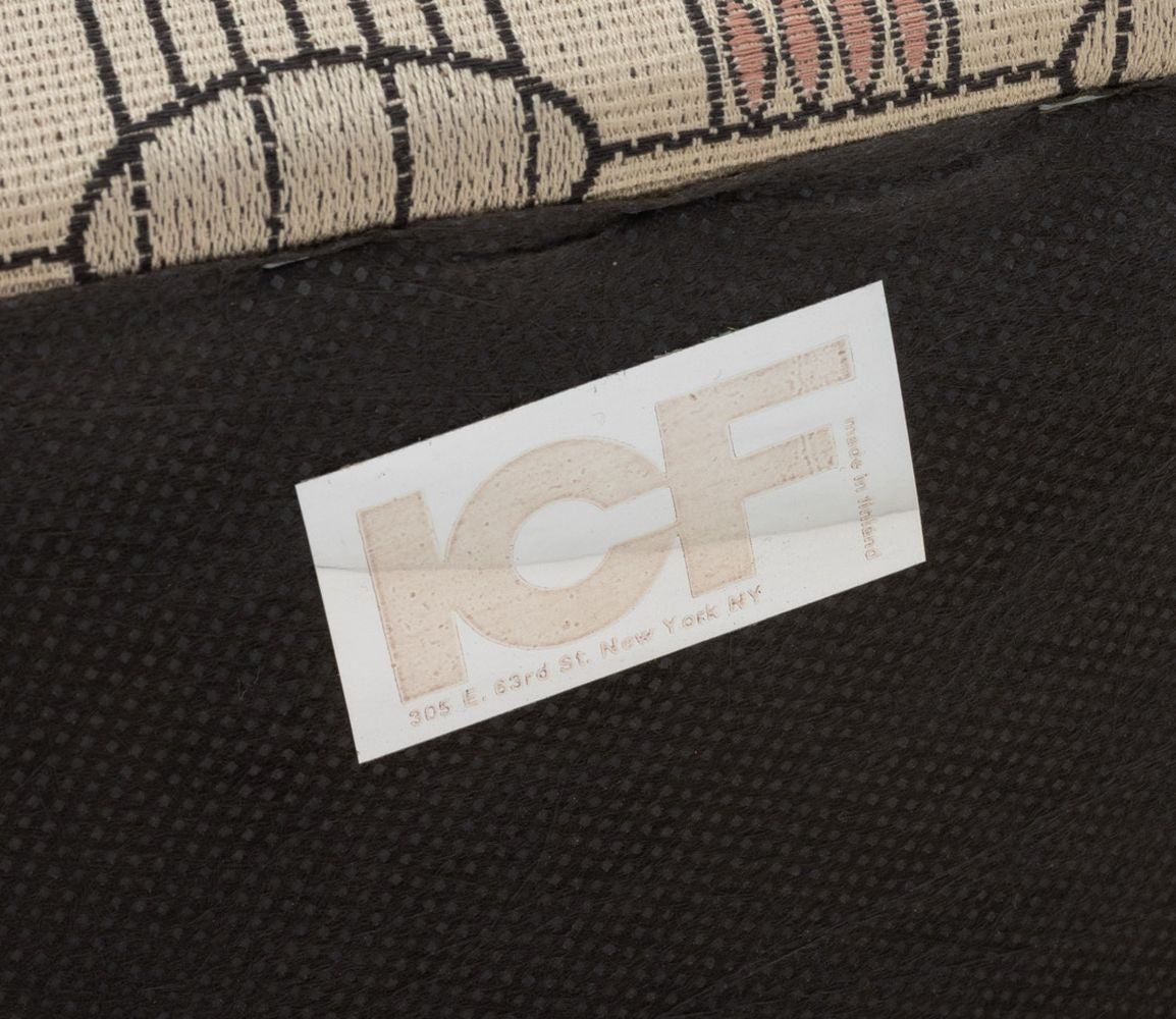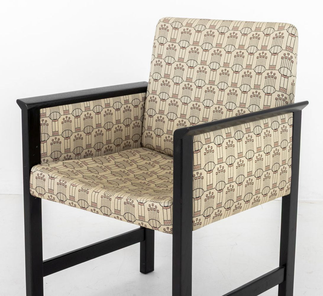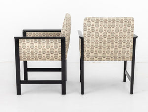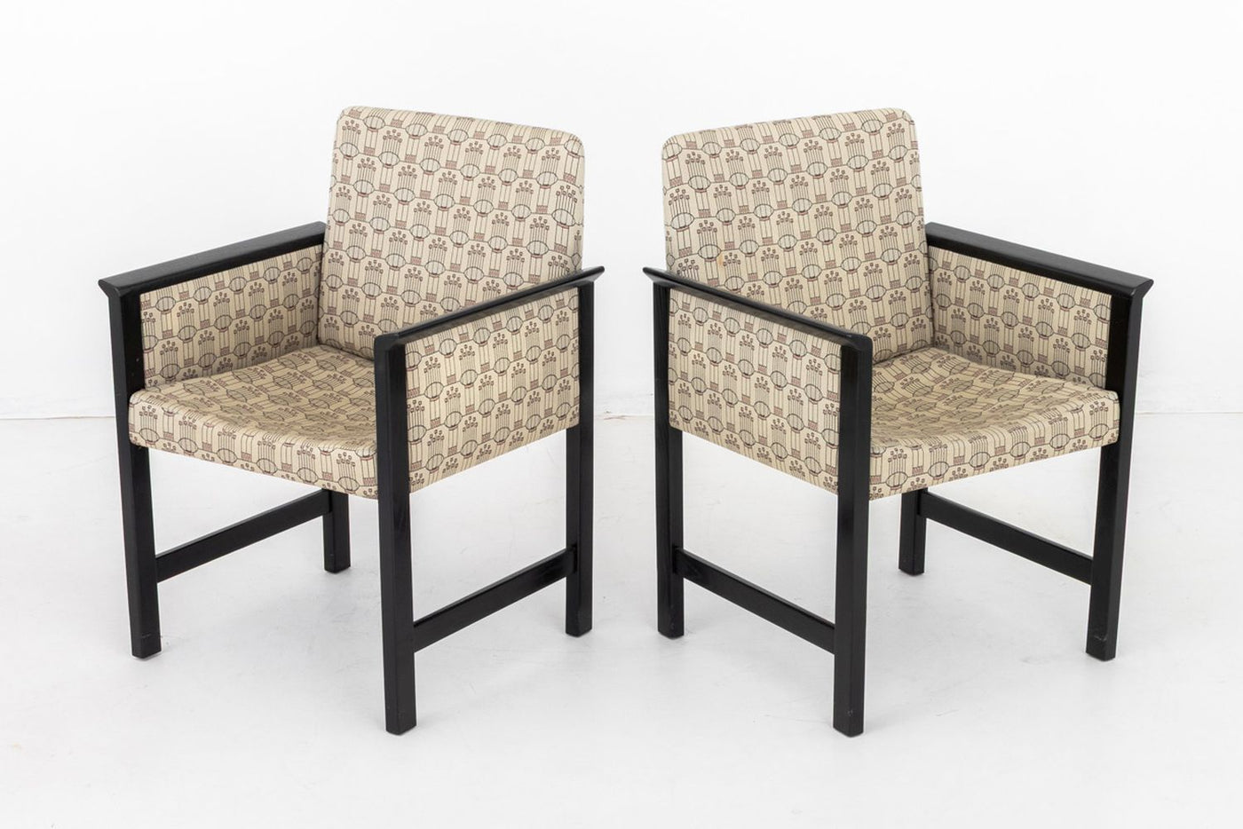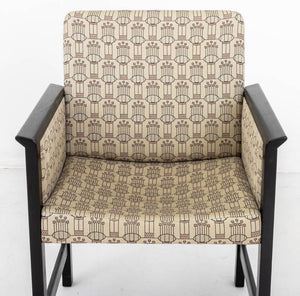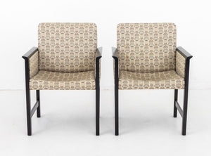 Pair of Finnish ICF Ebonized Armchairs, with geometric cotton-blend upholstery in beige, with "ICF / Made in Finland" label to the underside. 32.5" H x 23.75" W x 20.5" D; seat: 17" H. Provenance: The Estate of a Prominent East Coast University President. Keywords: Furniture, Seating, Lounge chair, Scandinavian, Upholstered, MCM, Interior desgin, Decorative Arts