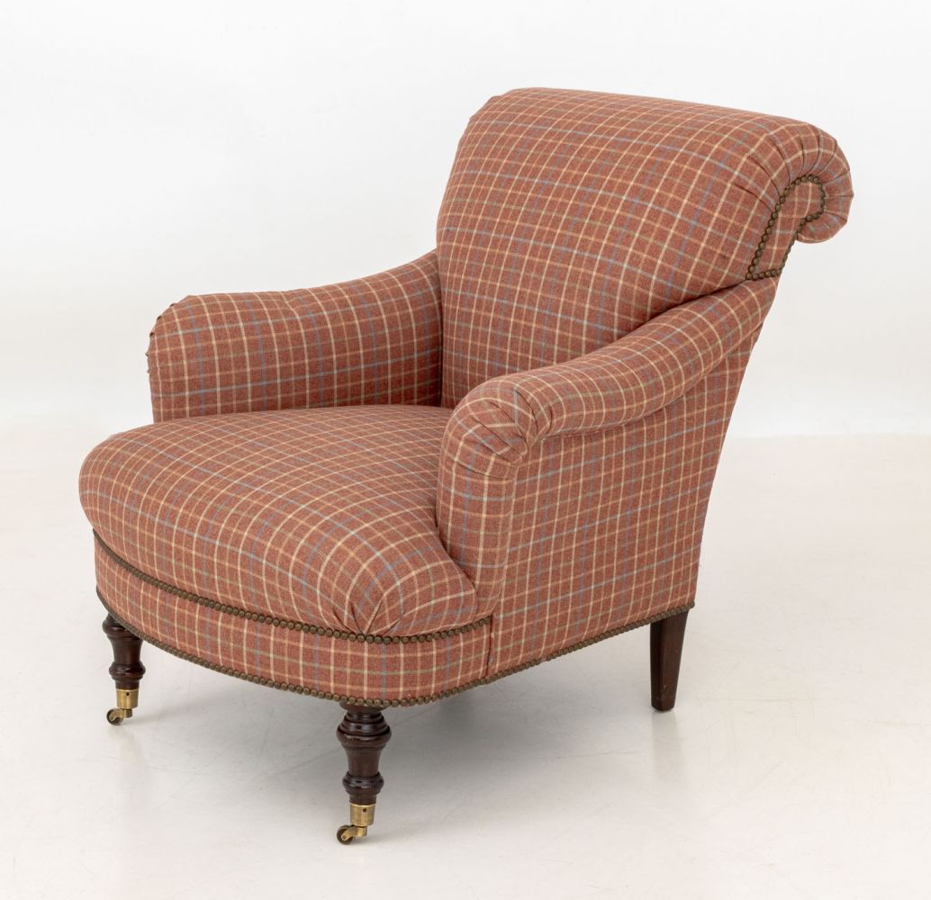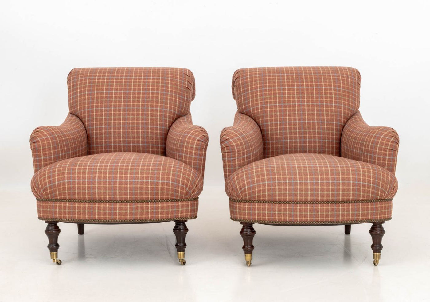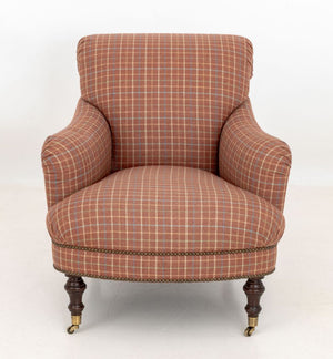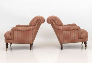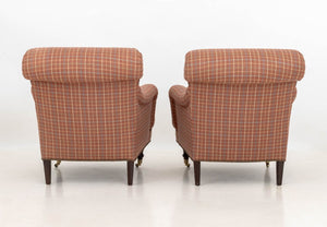 Red Plaid Upholstered Easy Chairs, Pair