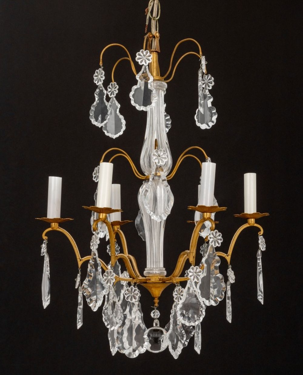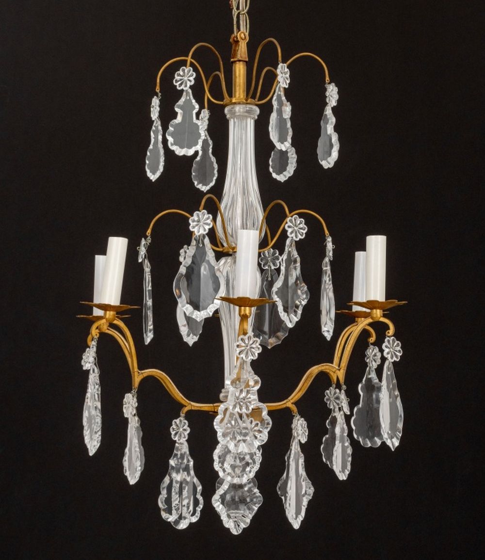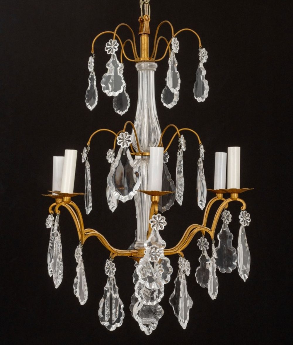 Italian Three Tier Gilt Metal Cut Glass Six-Light Chandelier, some of the drop crystals with Baccarat acid-etched mark. 24" H  x 17" Diameter. Provenance: From a Chappaqua, New York Collection. Keywords: Lighting, Ceiling light, Hanging light, Drop crystals, Interior design, Decorative Arts, Vintage