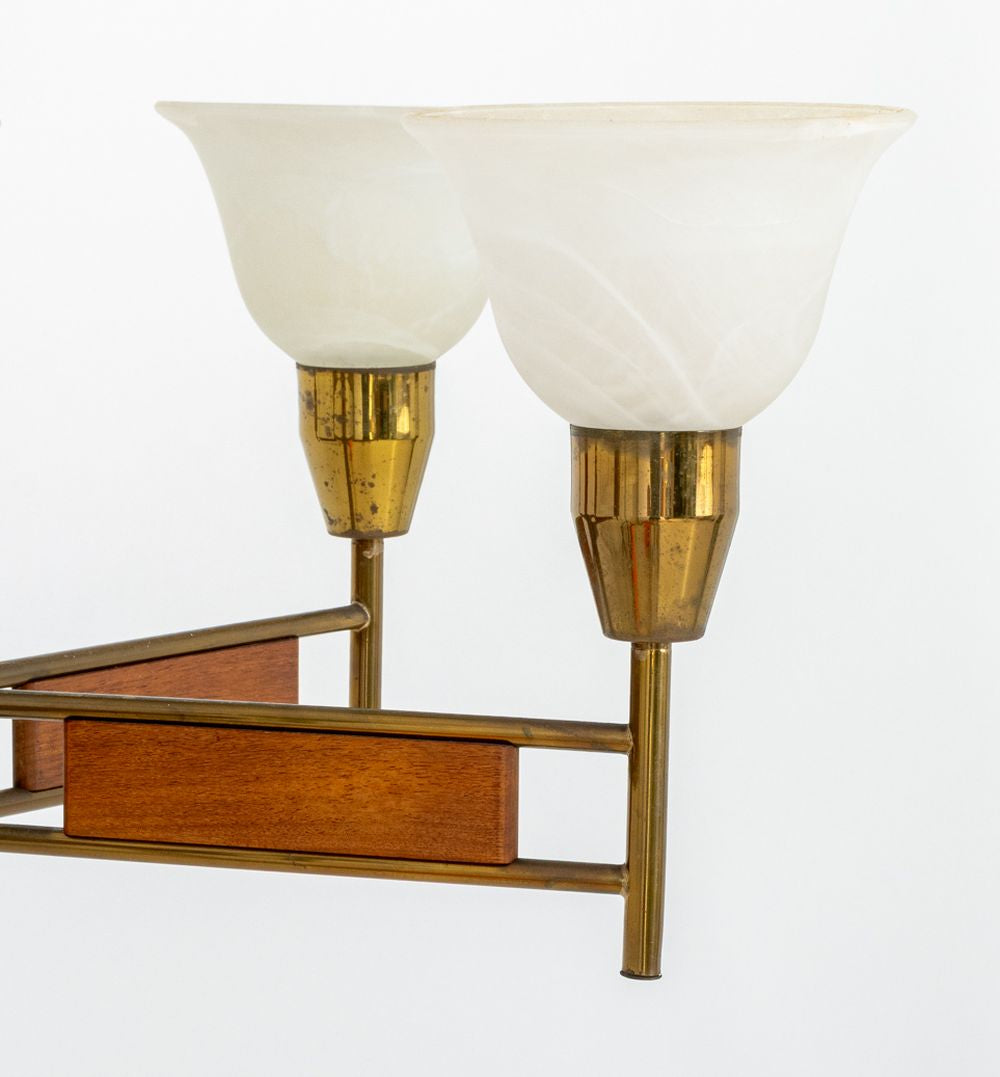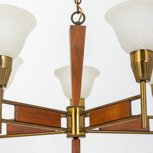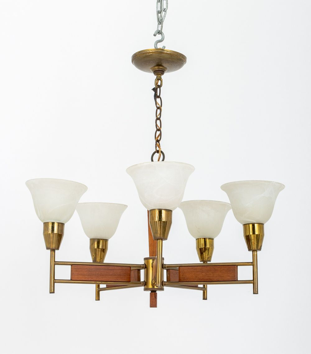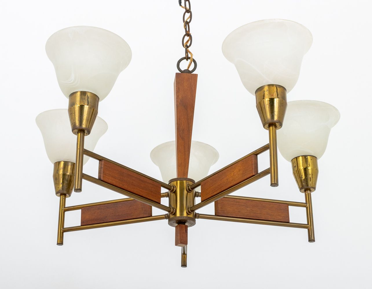 Mid-Century Modern Walnut Brass 5-Arm Chandelier