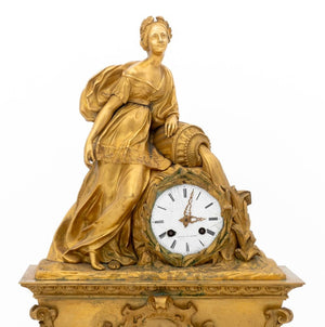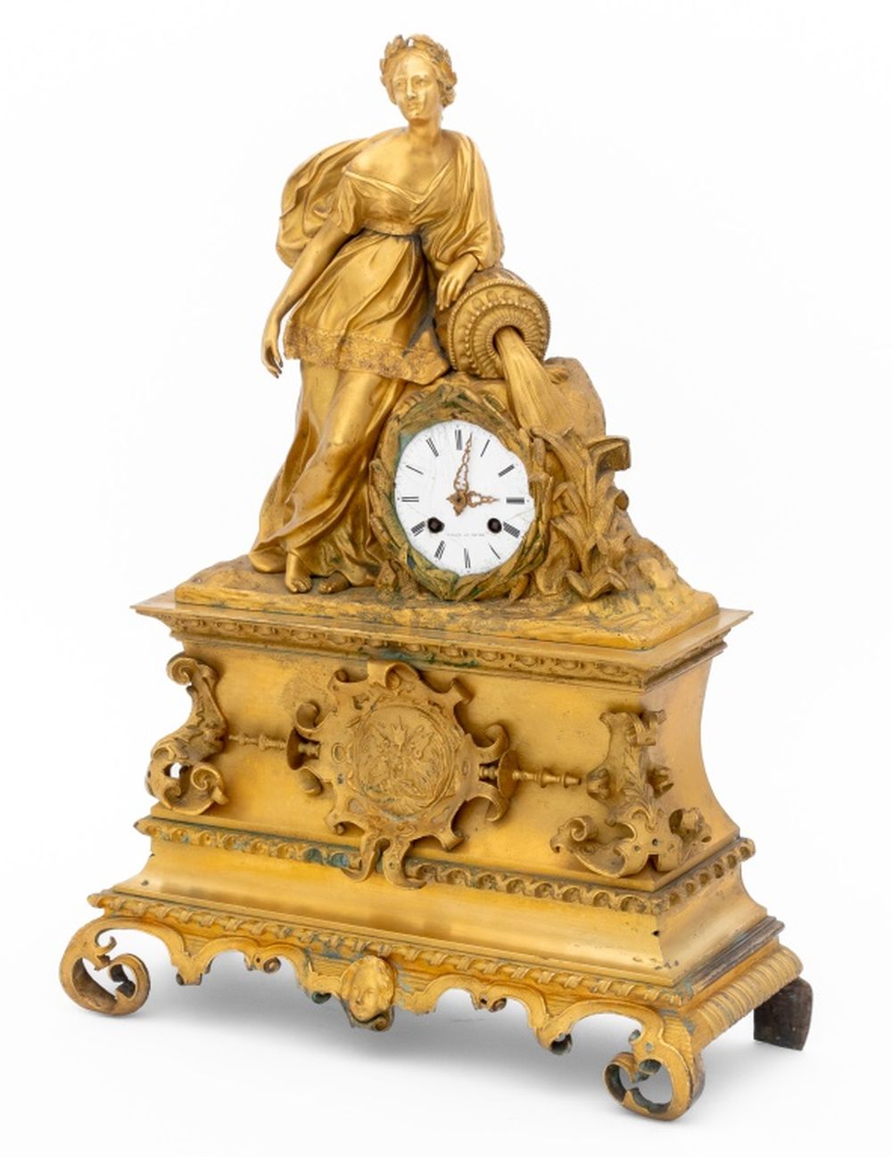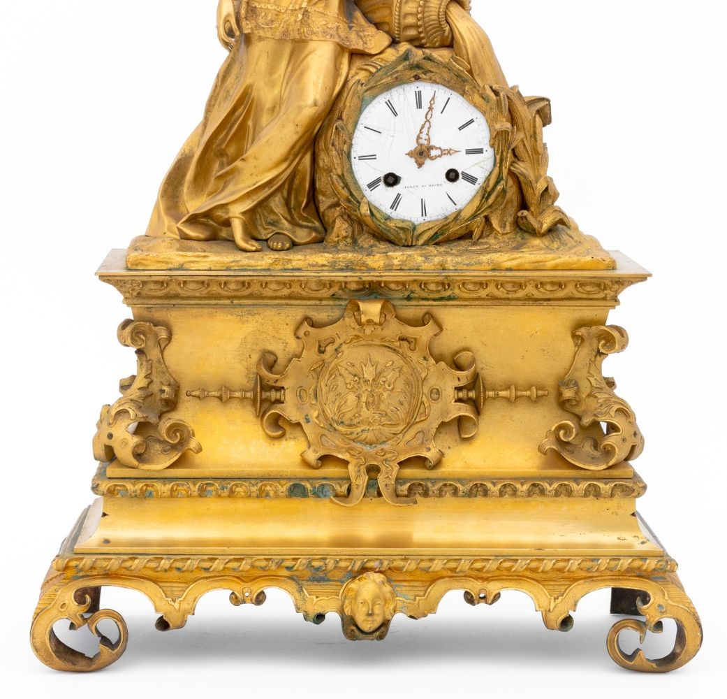 French Empire Gilt Bronze Figural Clock, circa 1830, the white enamel dial and movement strik on bell surmounted by a standing classical figure resting on an amphora pouring water, dial signed "Allix Au Havre" on a Gothic strapwork mounted base. 21" H x 15" W x 6" D. Keywords: Mantel Clock, Horologe, Horology, Timepiece, Time keeping, Ormolu, Roman, Greek Mythology, Hebe, Interior Decor, Decorative Arts