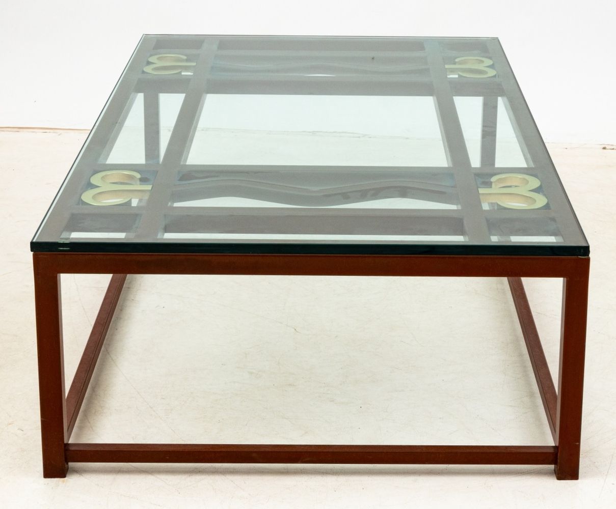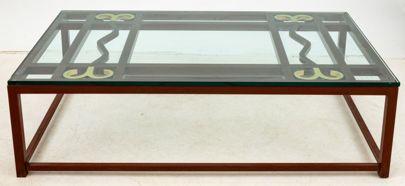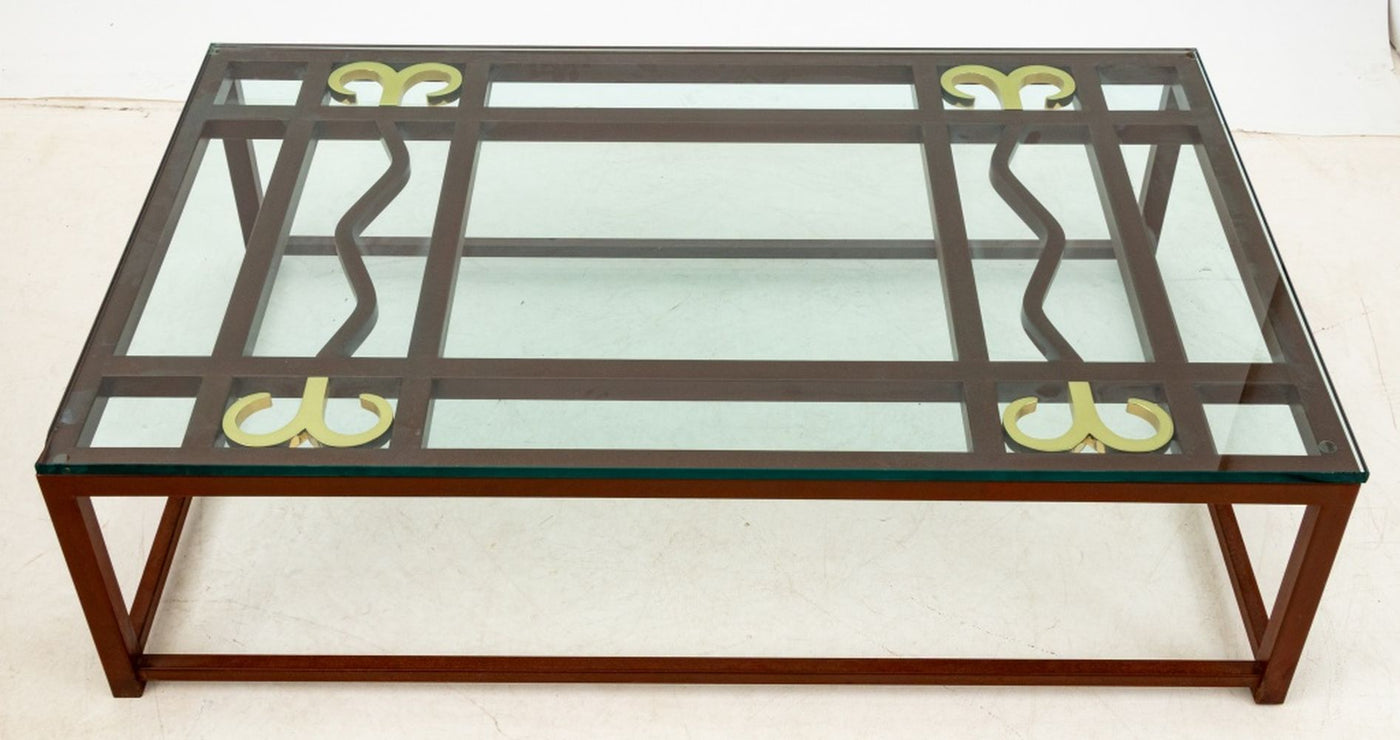 Contemporary Patinated Iron and Brass Glass Top Coffee Table, with open fretwork to the top. 17" H x 60" W x 36" D. Provenance: From a Park Avenue Estate. Keywords: Modern Furniture, Mixed Metals, Low table, Cocktail table, Interior design, Decorative Arts