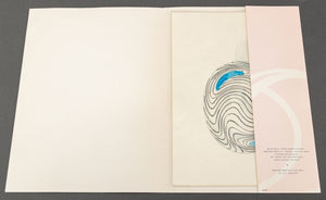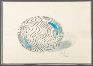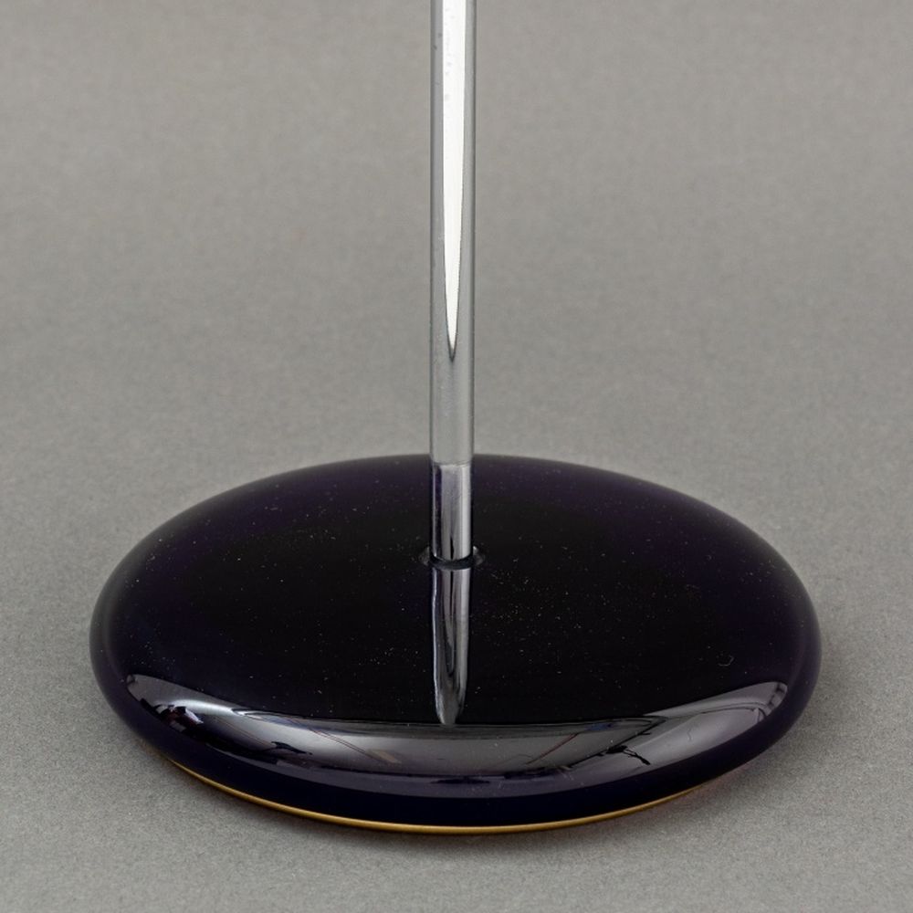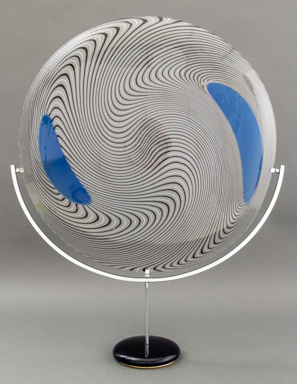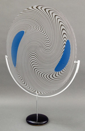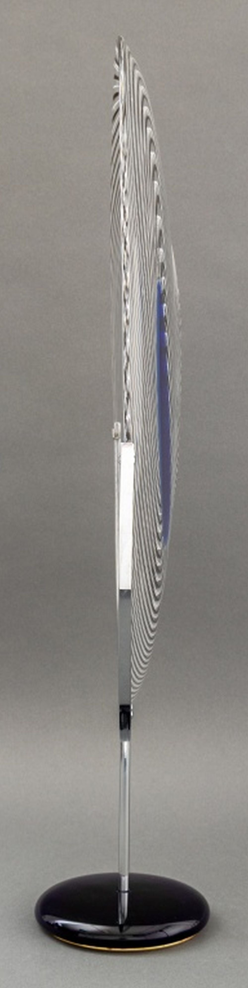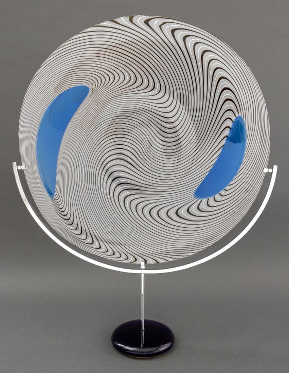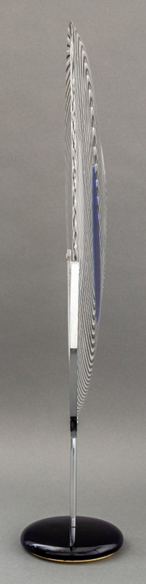 Giampaolo Seguso (Italian, b. 1942) Murano Art Glass Plate, 1993, with black and blue abstract design, artist's proof, signed, dated, and inscribed "Murano / Provo d'artiste" to underside, with chrome and blue glass stand, accompanied by Giampaolo Seguso watercolor sketch of design, signed lower right. 25.75" H x 19.25" Diameter. Provenance: From an Upper East Side Estate. Keywords: Studio Glass, Glassworks, Hand blown glass, Venetian glass, Charger, Statue, Sculpture, Black ribbon, Clear glass, Designer, Glass artist, Transparent, Decorative Arts