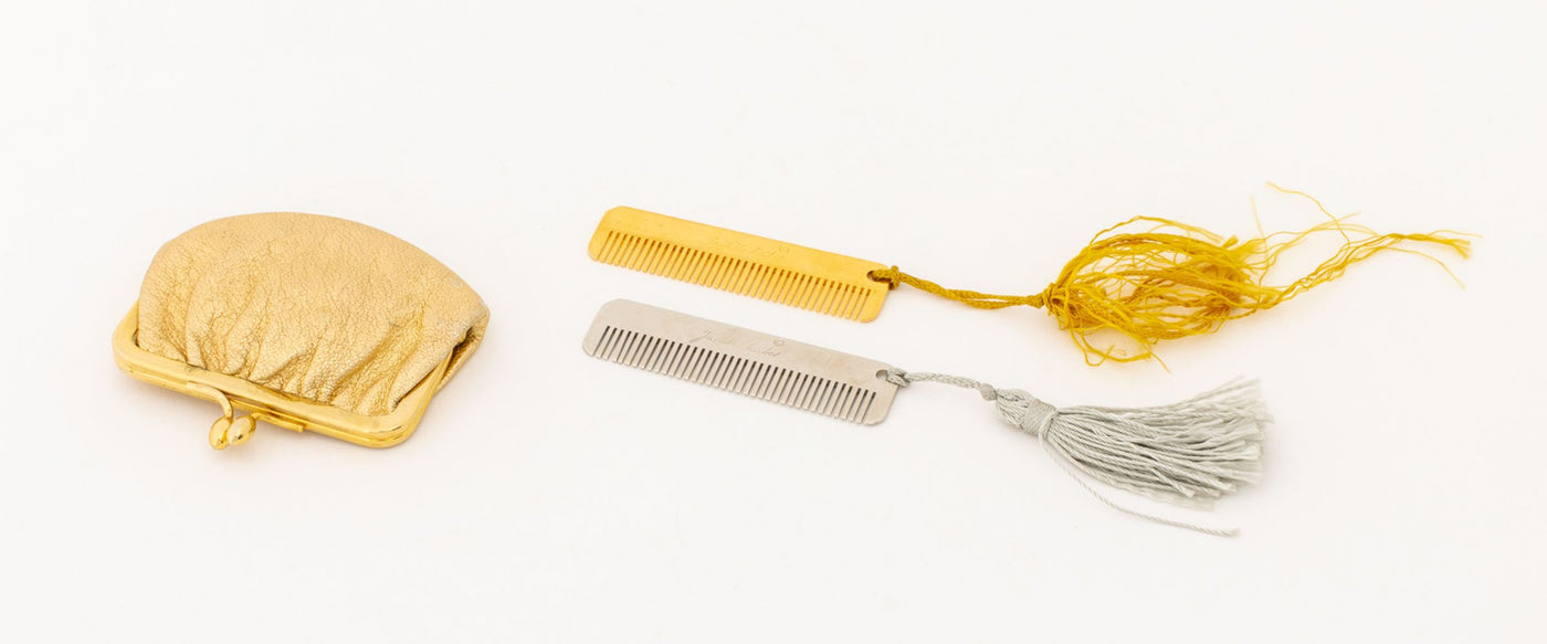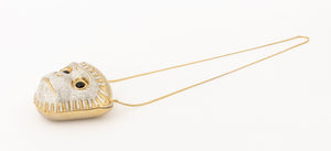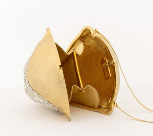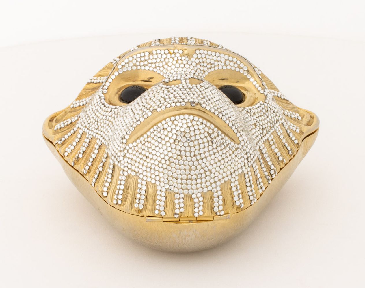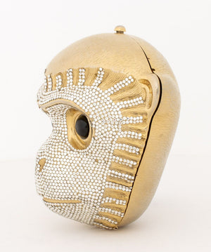 Judith Leiber Swarovski Crystal Mounted Gold-Tone Metal Monkey Clutch Bag, with black cabochon eyes and optional shoulder strap, divided interior with two miniature combs, coin purse, and two compact mirrors, marked "Judith Leiber" to the interior. 5" H x 6" W x 3.25" D. Provenance: From a New York City Collection. Keyword: Handbag, Fashion, Accessories, Gem-set, Rhinestones, Pocketbook, Purse, Evening bag, Animalier, Minaudiere, Designer, Animalier, Women designers, Couture