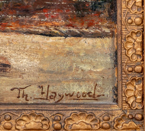 American School, River Landscape Scene, Oil on Canvas, signed "Th. Haywood" lower right, giltwood frame. Image: 8.75" H x 15.5" W; frame: 12.5" H x 19.5" W. Keywords: Painting, Works on Canvas, Canoe, Log cabin, Trees, Hills, Mountains, 19th Century Art, Antique