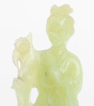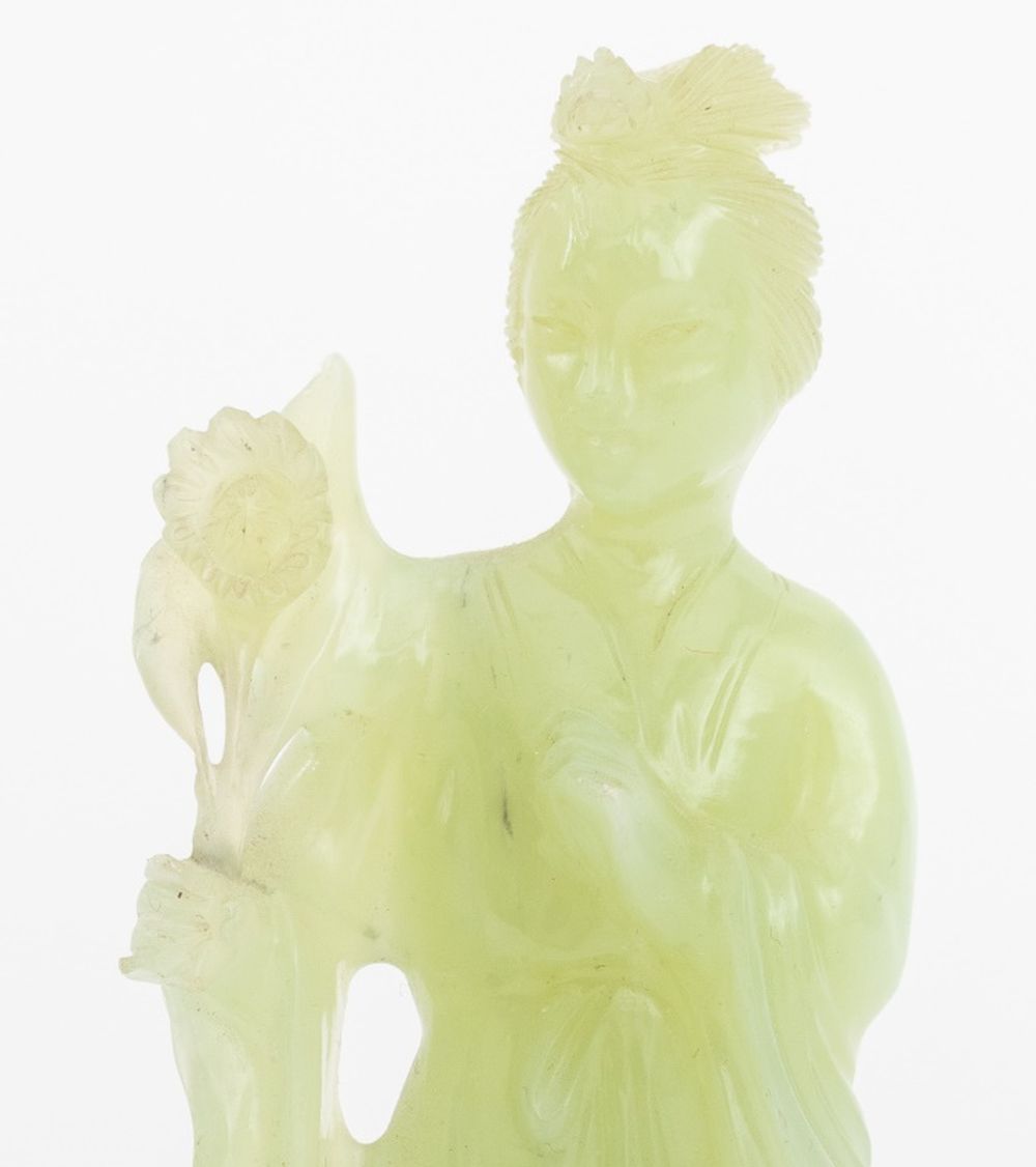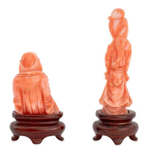 Group of Four Chinese Carved Jade and Coral Sculptures, comprising: two pink coral sculptures of Buddha and a female figure, celadon jade sculpture of a woman upholding flower, and marbled jade sculpture of foo dog and puppy, each on fitted carved wood base.