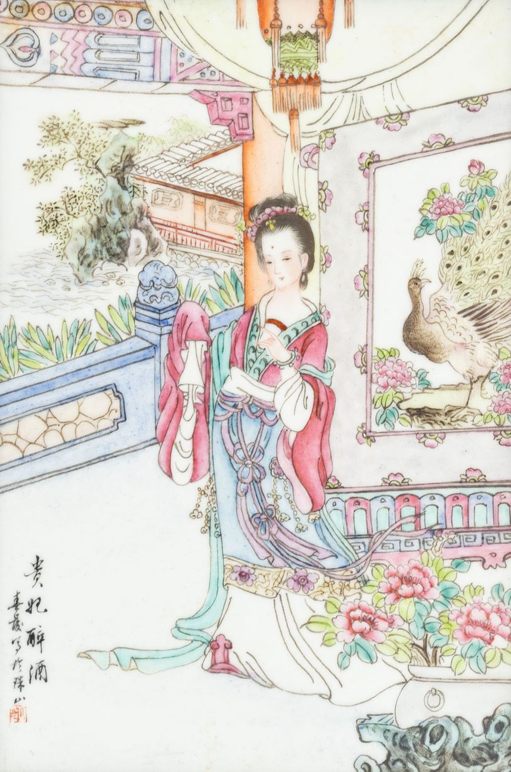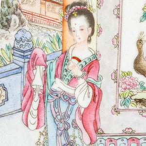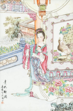 Keywords: Asian Art, China, Ceramics, Painting, Hand-enameled, Landscape scene, Figural, Figurative, Female figure, Woman, Peacock, Decorative Arts