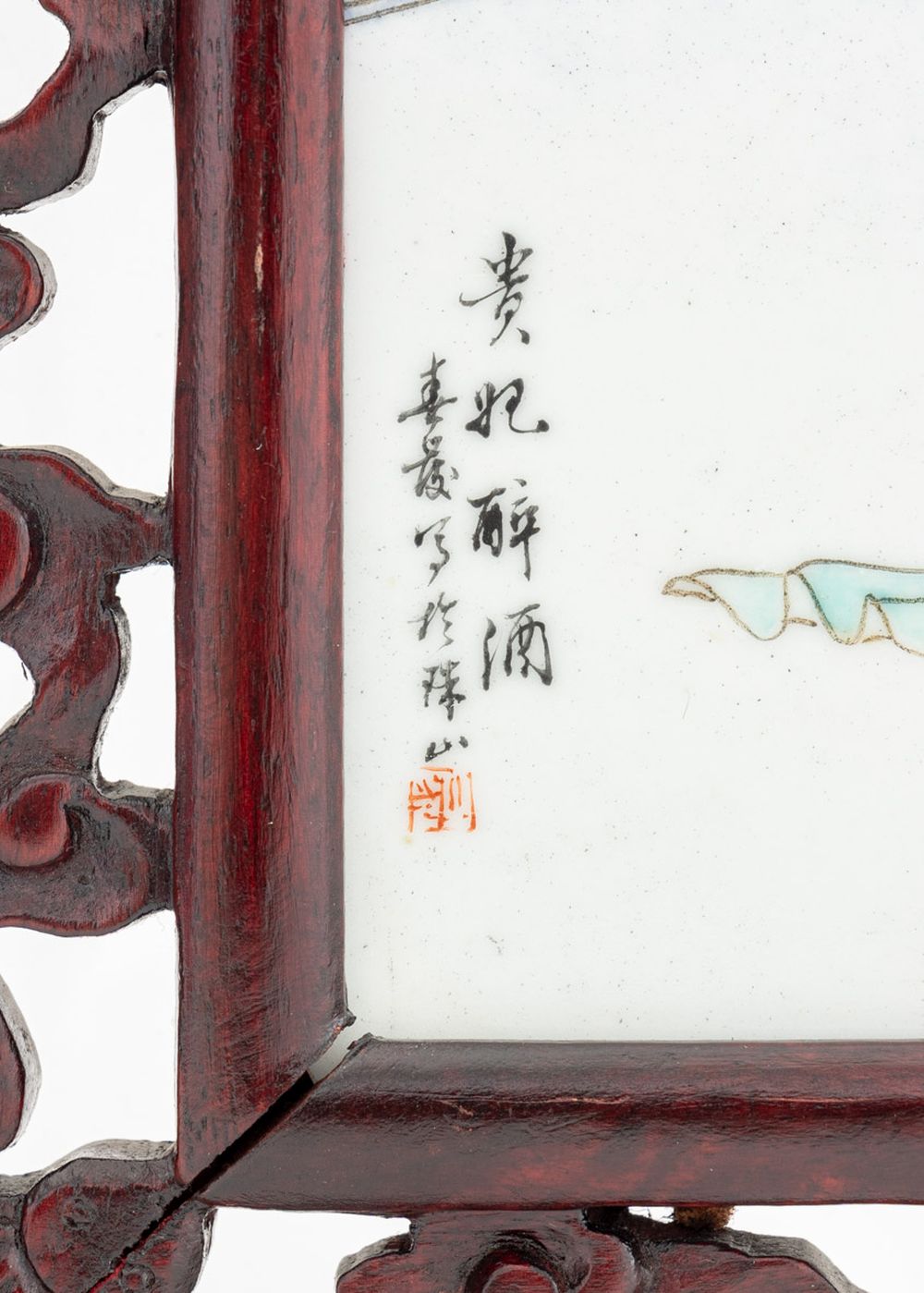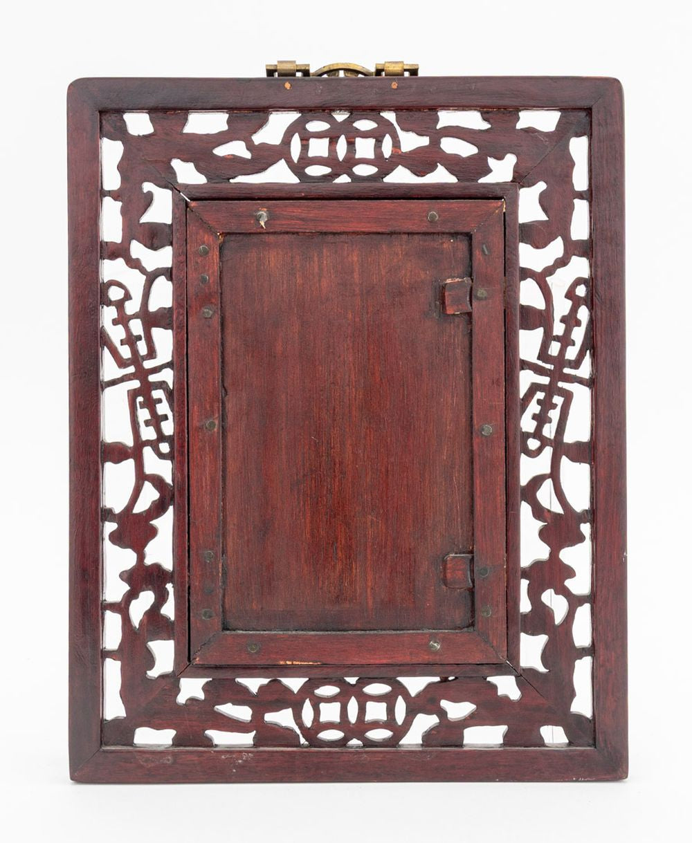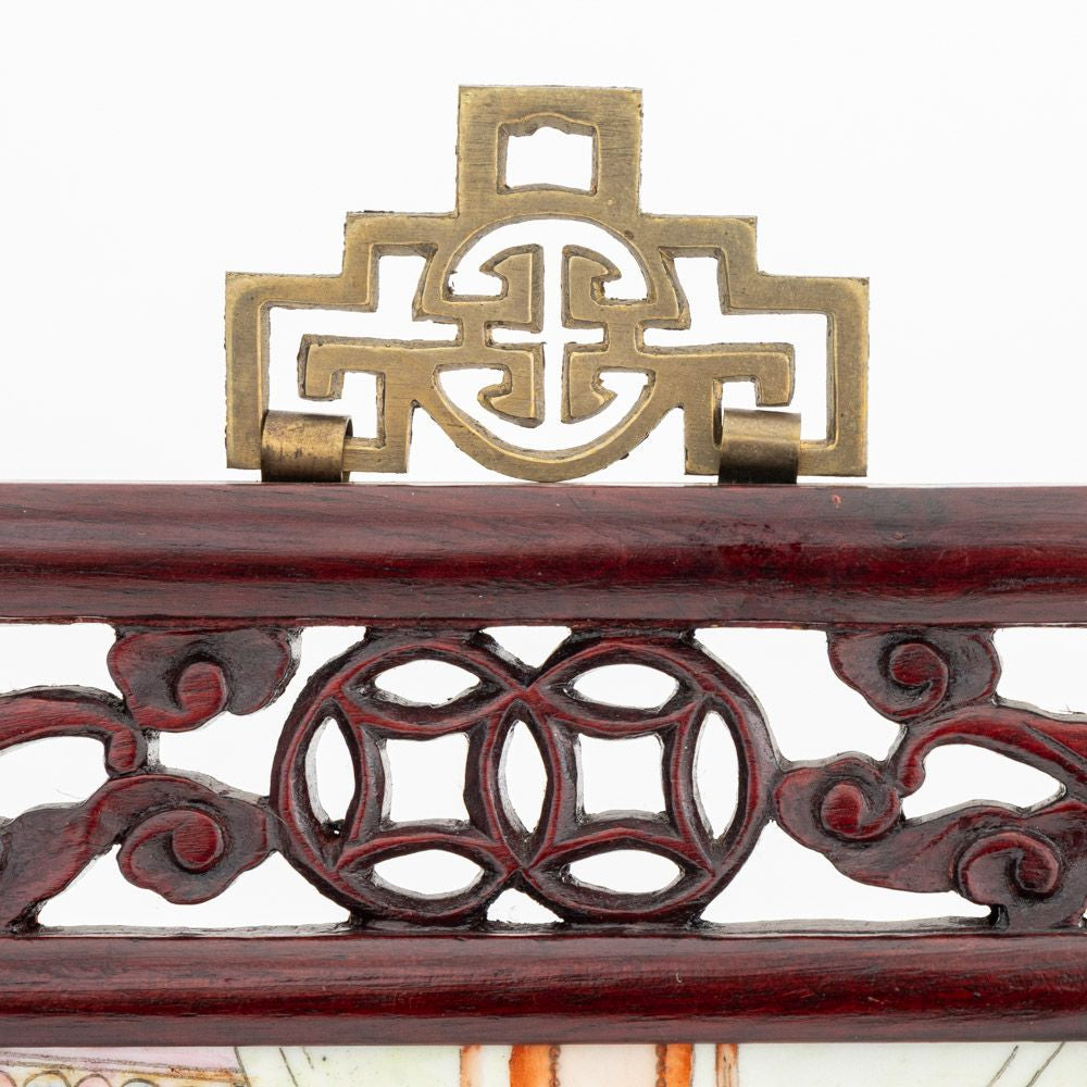 Chinese Famille Rose Porcelain Plaque, hand-painted with a beauty amongst an interior scene, marked lower left, carved pierced wood frame with si bat motif.