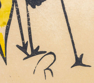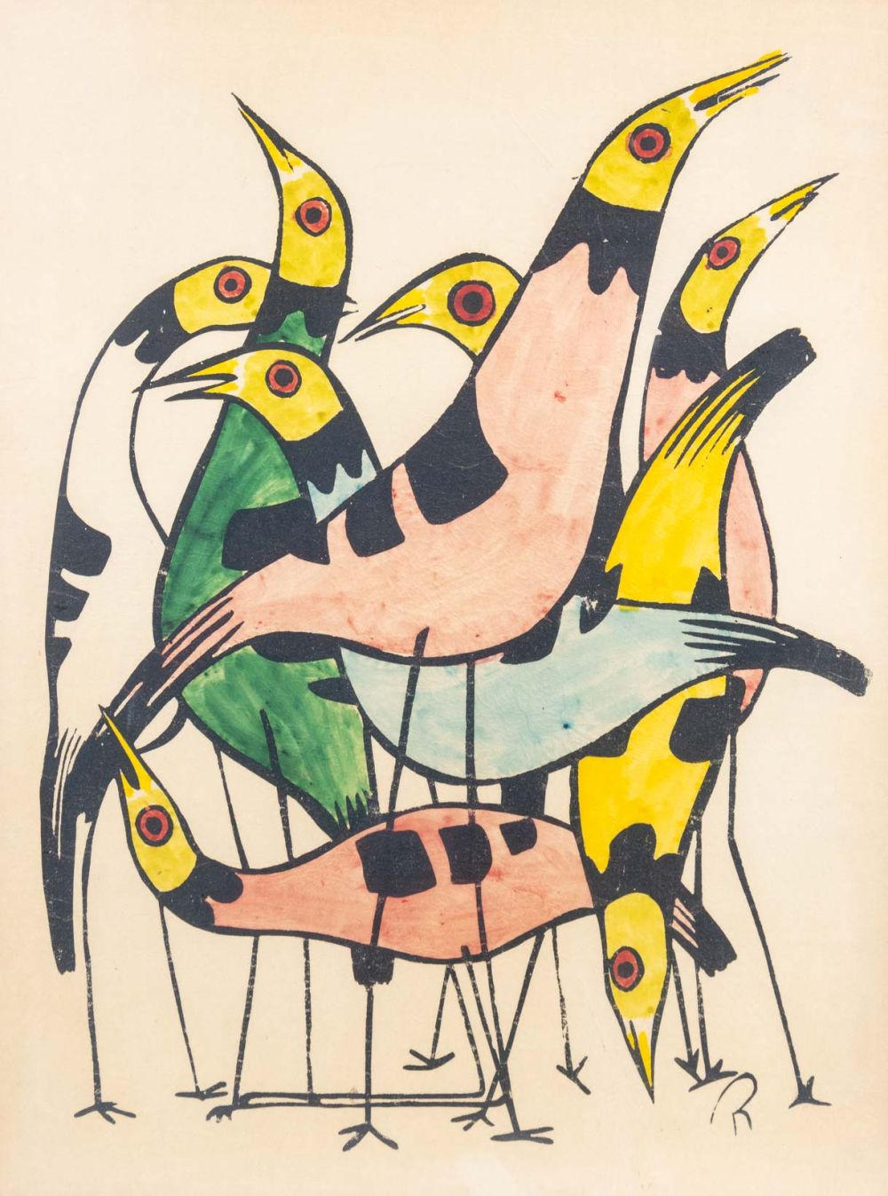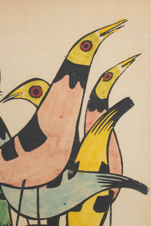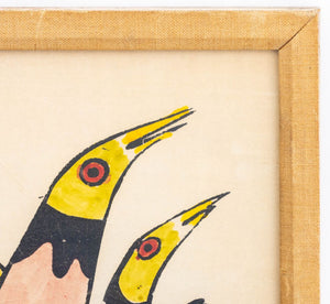 Contemporary School, Stylized Bids, Woodblock Print with Watercolor Embellishments, initialed "R" in print lower right, wood fame.