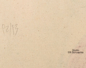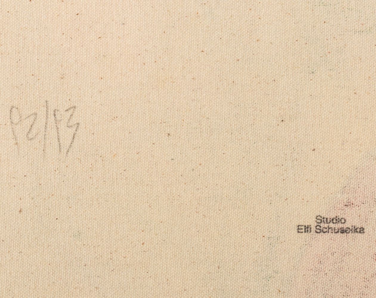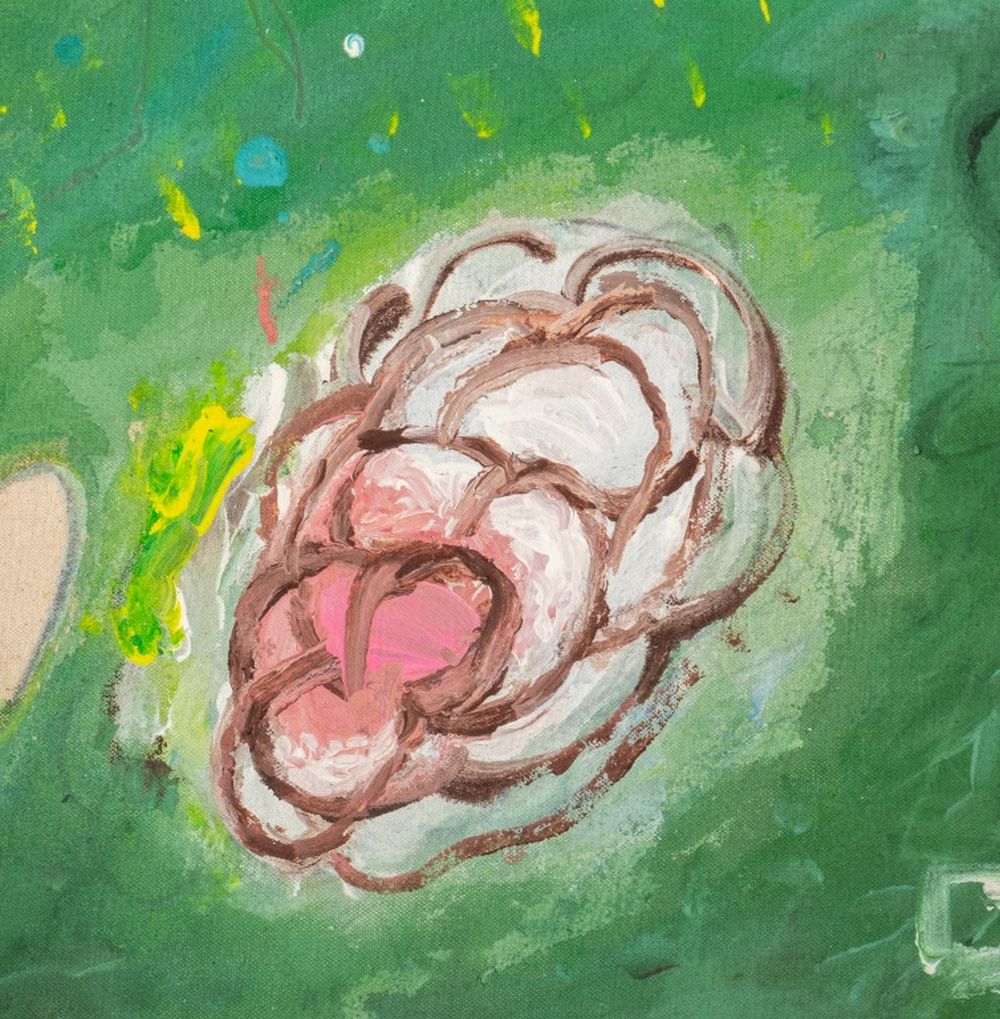 Elfi Schuselka (Austrian, b. 1940), Abstract Composition in Green, Oil on Canvas, stamped "Studio / Elfi Schuselka" to verso, unstretched, unframed. 21.5" H x 23" W. Provenance: From the collection of the artist. Note: Schuselka studied photography, art history, and theater at the University of Vienna. She moved to New York in 1964. Her work has been exhibited internationally in the United States, Italy, France, and Japan, as well as at the Cracovia Biennial, Yugoslavia, Ibiza Biennial, Spain, and the Sao Paulo Biennial. Her work is part of the permanent collections of the Museum of Modern Art (MoMA), New York, the Amon Carter Museum of American Art, Fort Worth, and the International Centre of Graphic Arts, Slovenia. Long a regular exhibitor at the famed 55 Mercer Gallery, Schuselka is well-known in New York art circles together with her husband, Domenick Capobianco (American, b. 1928). Keywords: Painting, Acrylic painting, Surrealism, Surrealist, Geometric, Oval, Shapes, Scribbles, Joan Miro manner, Second New York School, Women Artists, Contemporary Art