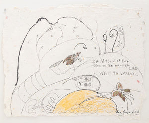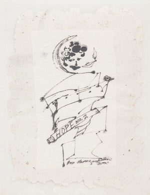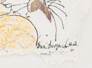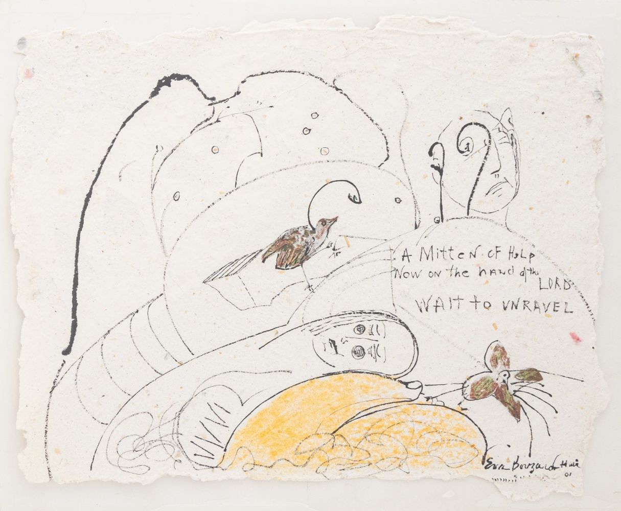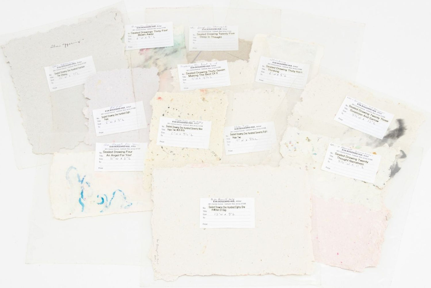 Eva Bouzard-Hui (American, 1936-2023), Twelve Surrealist Compositions, Mixed Media on Handmade Paper, each labeled with title verso, comprising: "Blown Away", 1999, signed and dated lower right; "Thought Narratives" signed 1998, signed and dated lower right; "Suspicion and Sorrow", 1998, signed and dated lower right; "The Offering" 1998, signed and dated lower right, marked with title to verso; "Deep in Thought", 1998, signed and dated lower right; "Thinking" 1998, signed and dated lower right; "Pepe", 1998, signed and dated lower right; "Making the Best of It", 1997, signed and dated lower right; "A Mitten of Help", 2001, signed and dated lower right and to verso, "An Angel For You!", 1998, signed and dated lower right; "Hope Two", signed and dated lower right; "Hope Two with Kitty", 2001, signed and dated lower right.