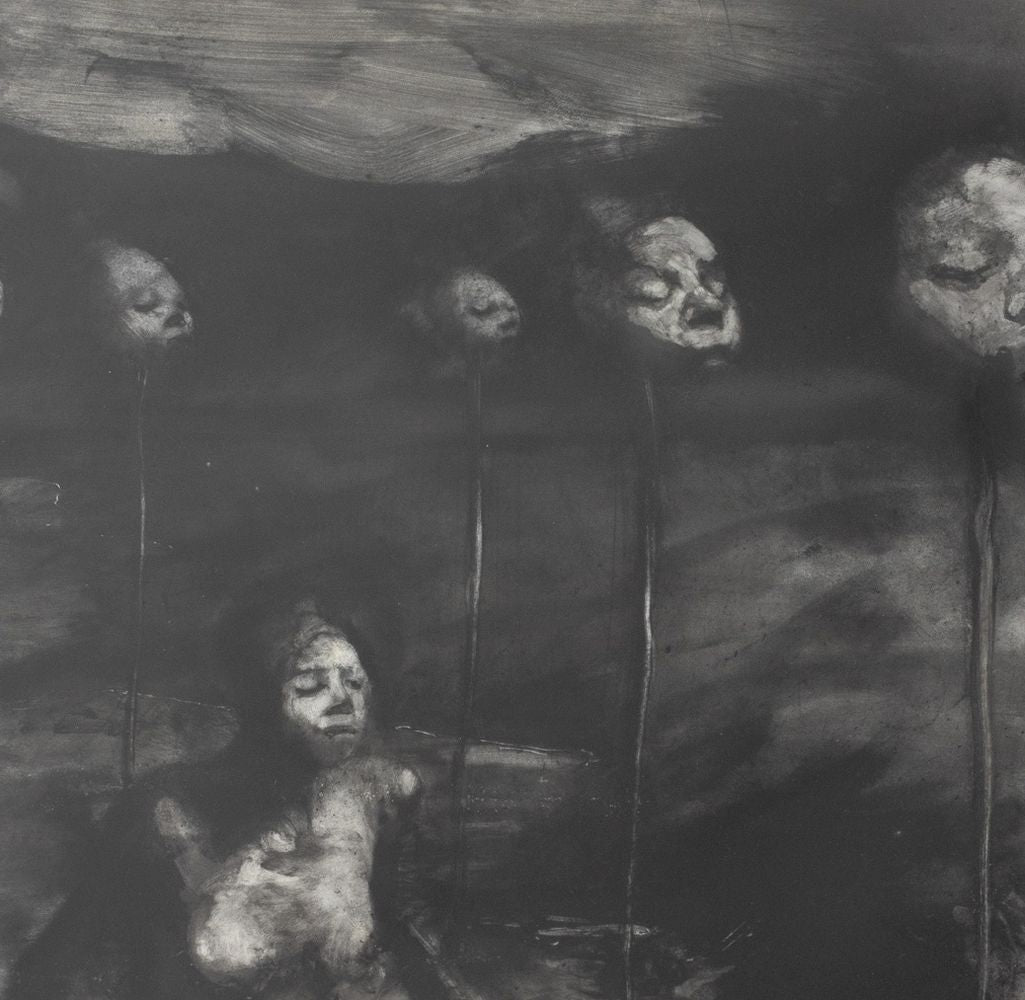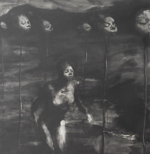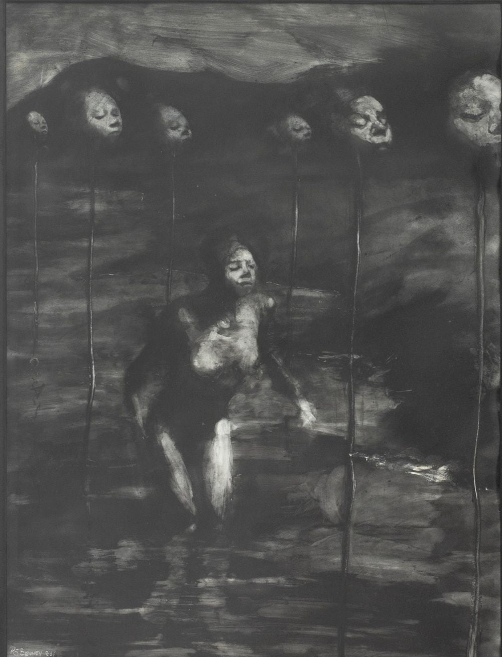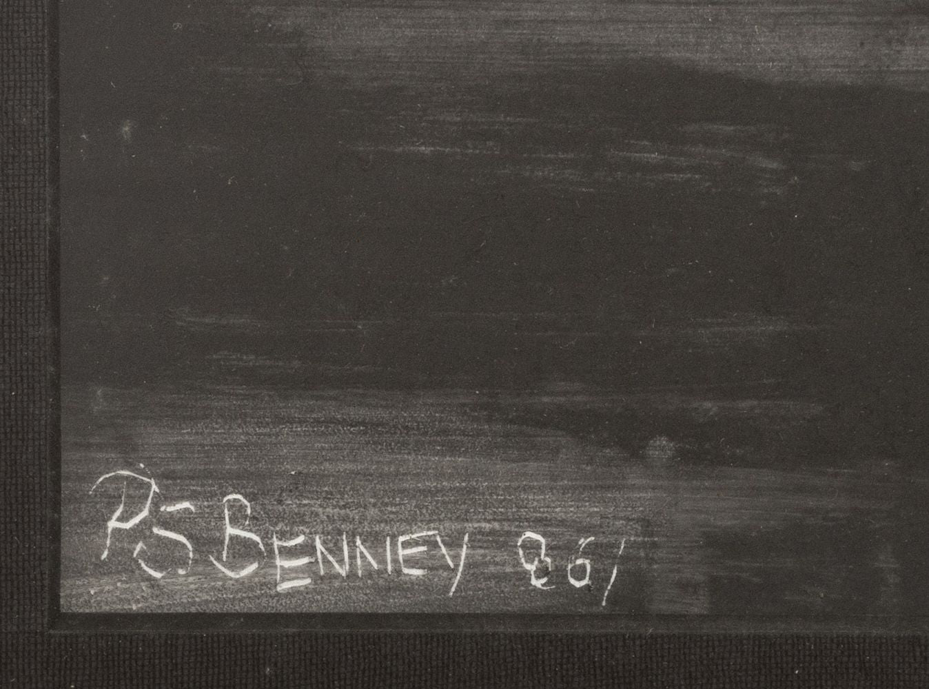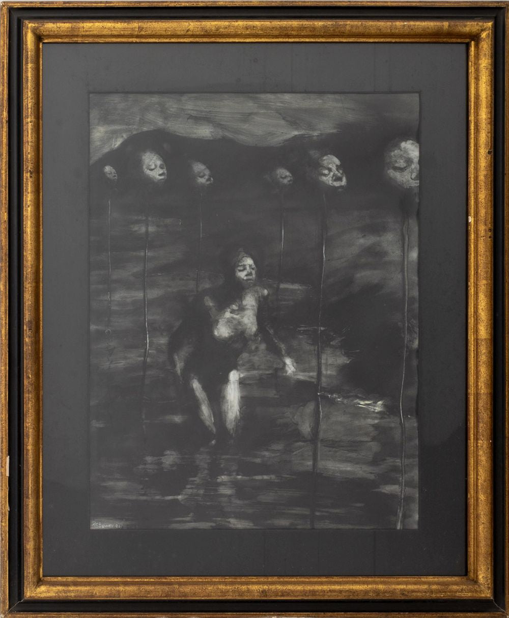 Paul S. Benney (British, b. 1959), The New American, Acrylic on Paper, 1986, signed and dated lower left, giltwood and ebonized frame. Image: 24.75" H x 18.75" W; frame: 35" H x 29.25" W x 1.25" D. Provenance: From an East Village and Hamptons Collection. Keywords: Painting, Oil painting, Works on Paper, Figural, Figurative, Nude, Female form, Abstraction, Abstract, Surrealism, Surrealist, Macabre, 20th Century Art, East Village Art Scene, Contemporary Art