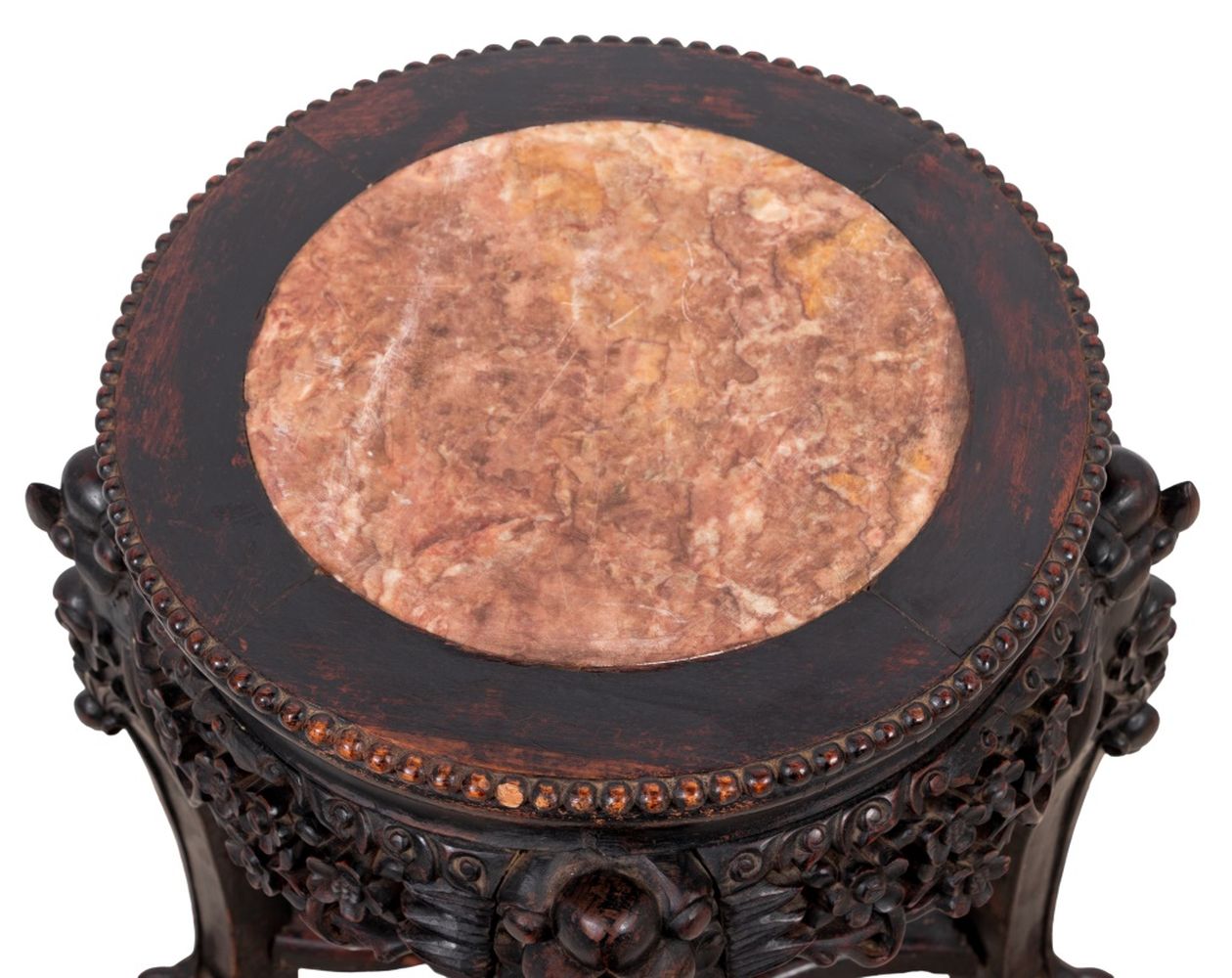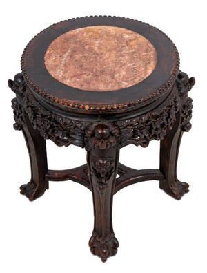 Chinese Carved Hardwood and Marble Circular Low Pedestal Table, late 19th century, the circular inset top above a carved frieze, on carved legs with claw and ball feet, joined by an X-stretcher. 8.5" H x 18" W x 18" D. Keywords: Asian Arts, Antique Furniture, Lamp table, Side table, Display stand, Sculpture gallery, Plant stand, Interior design, Decorative Arts