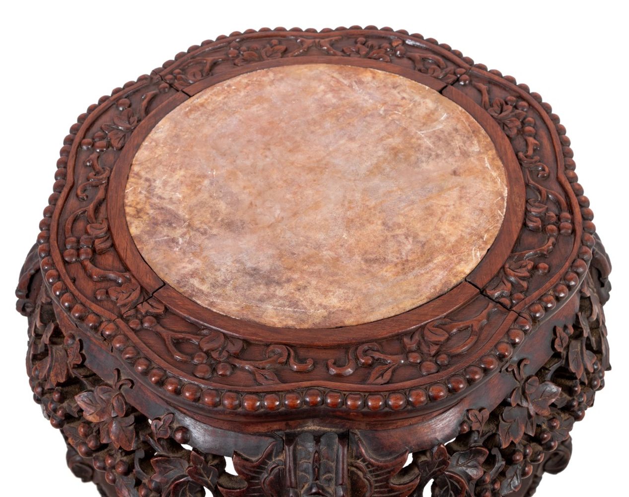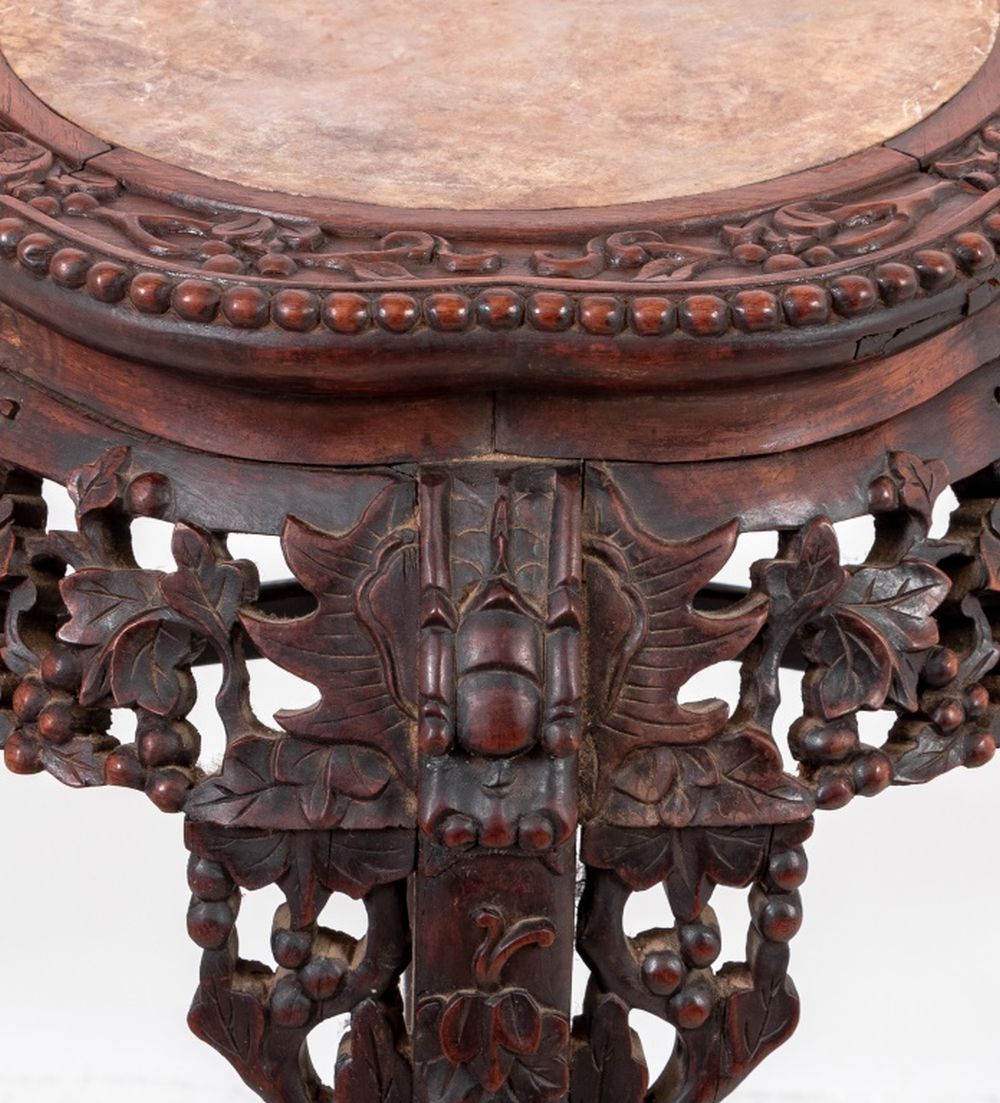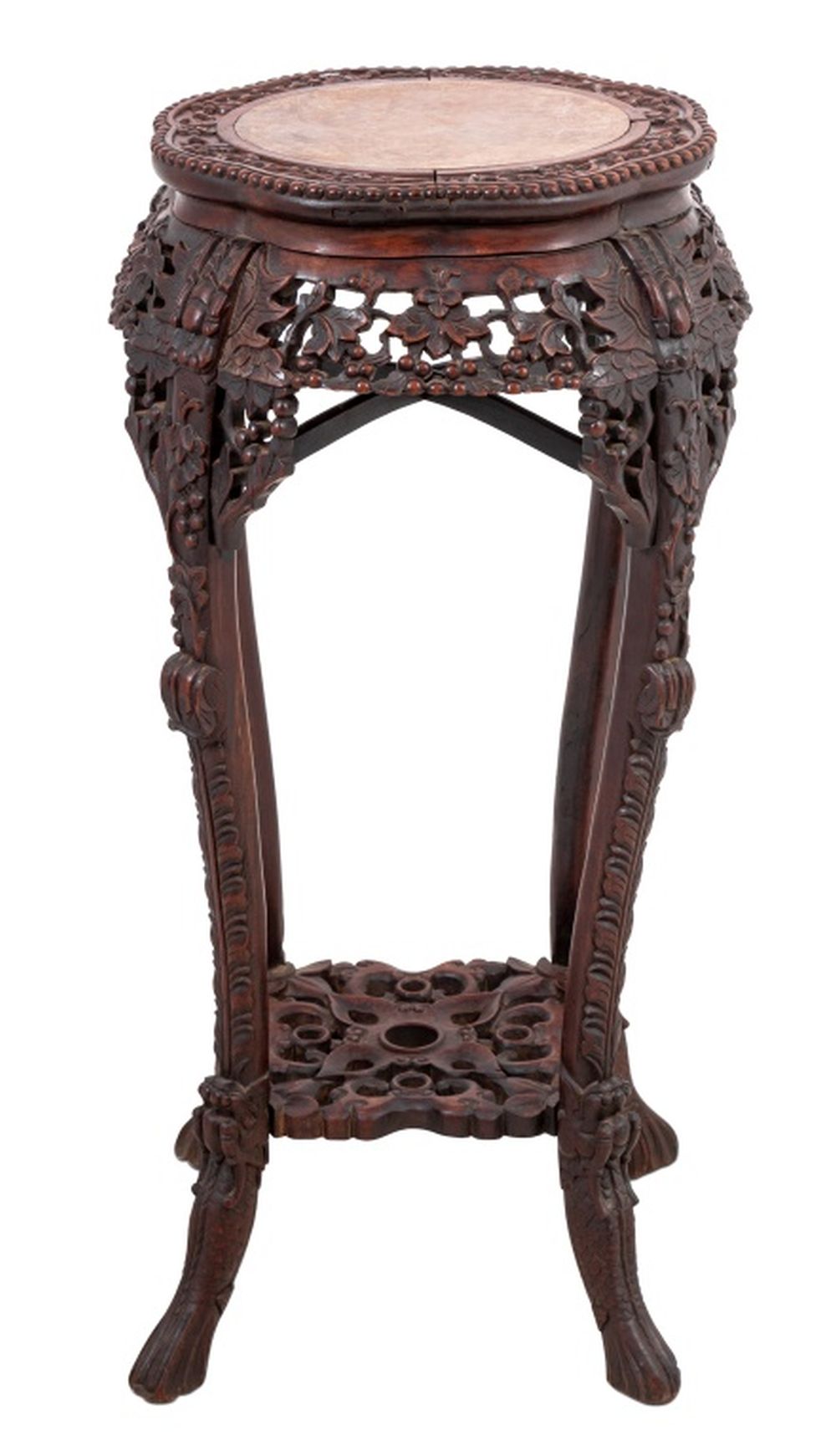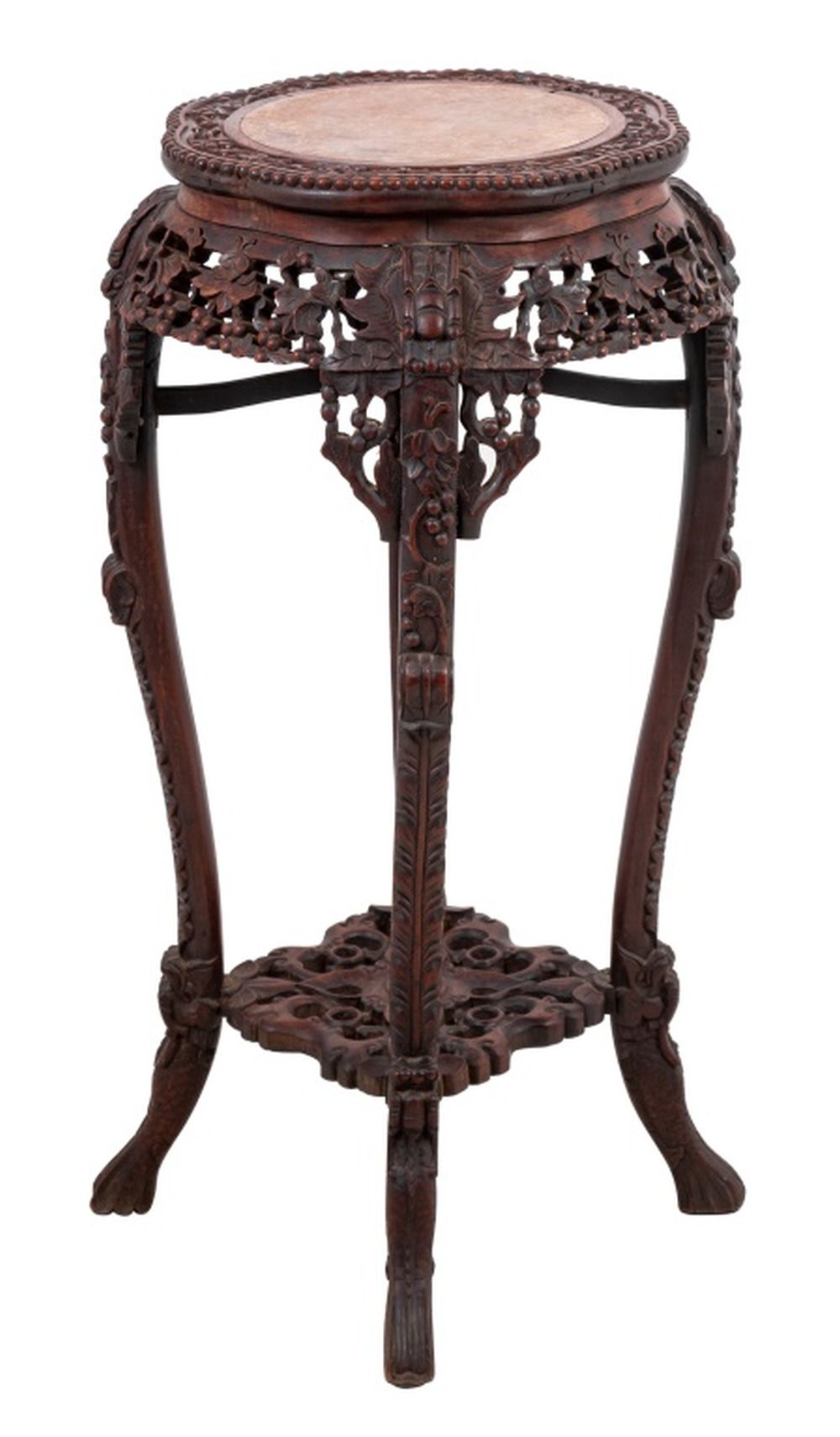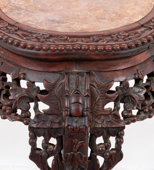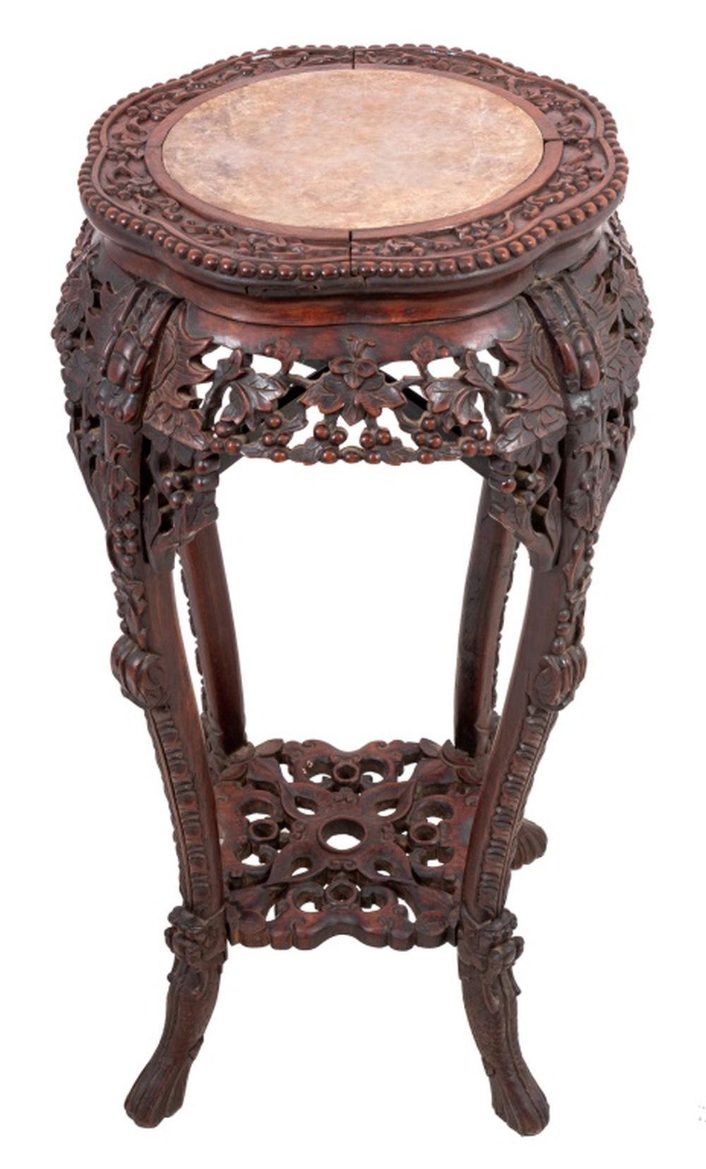 Chinese Carved Hardwood and Marble Pedestal Table, late 19th century, profusely carved, the lobed top inset with marble, on tall scrolled legs joined by an undertier. 37" H x 16" W x 16" D. Keywords: Asian Arts, Furniture, Antique, Lamp table, Side Table, Display stand, Sculpture gallery, Plant stand, Specimen Marble, Interior Design, Decorative Arts