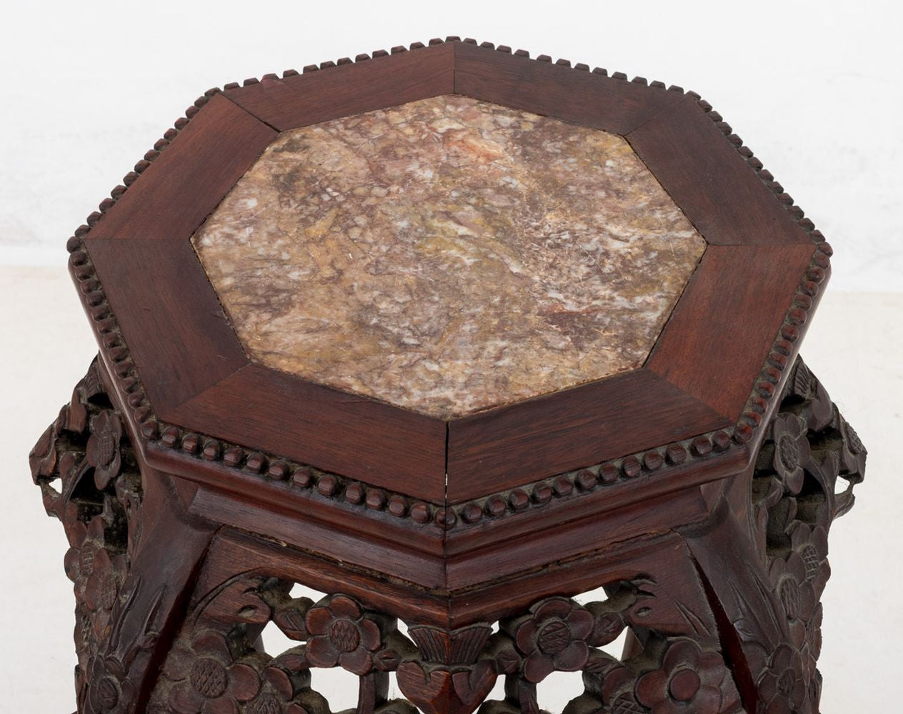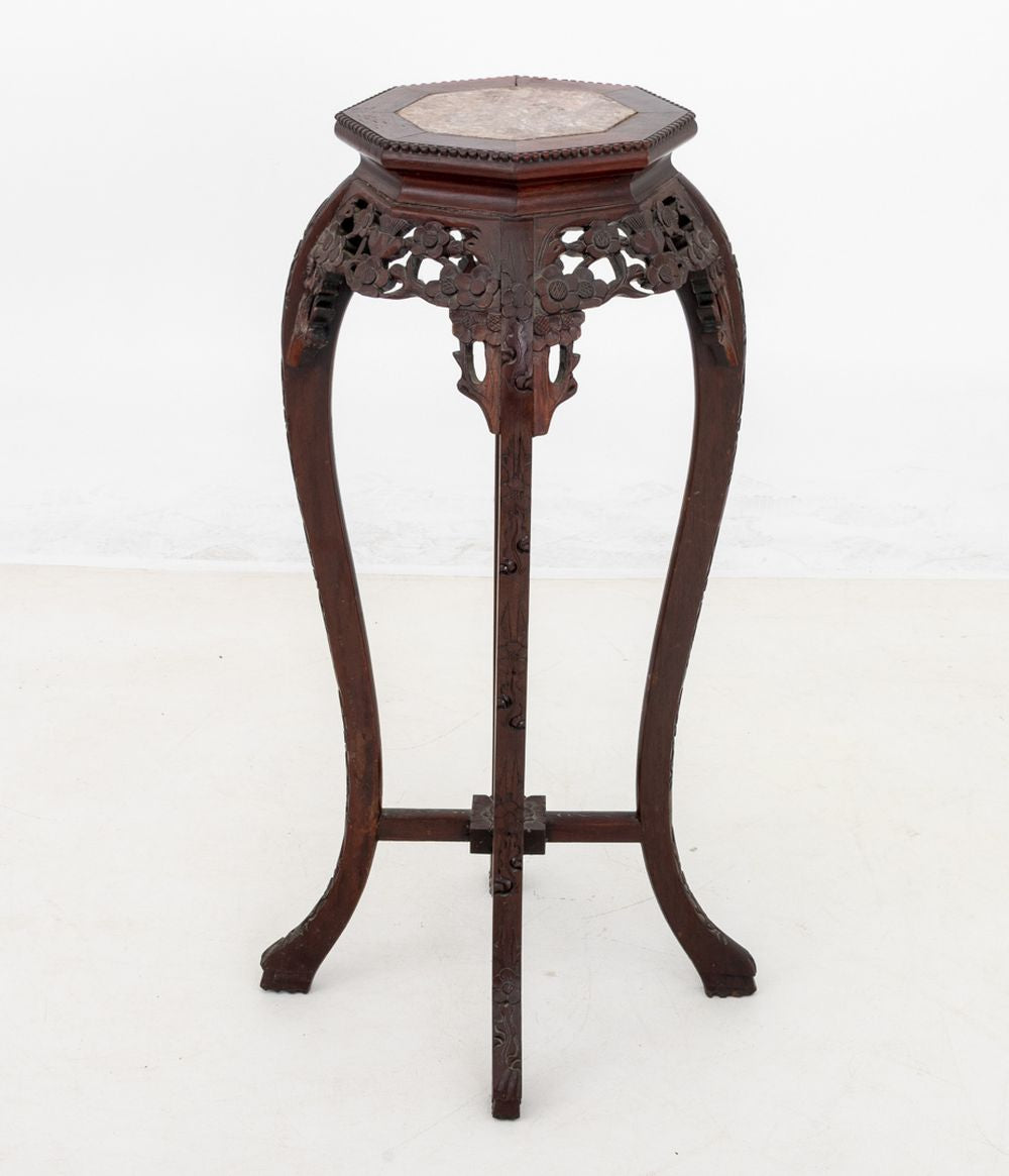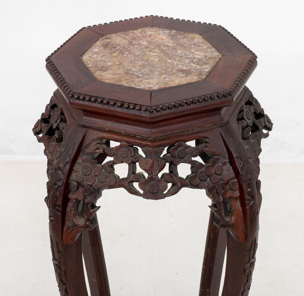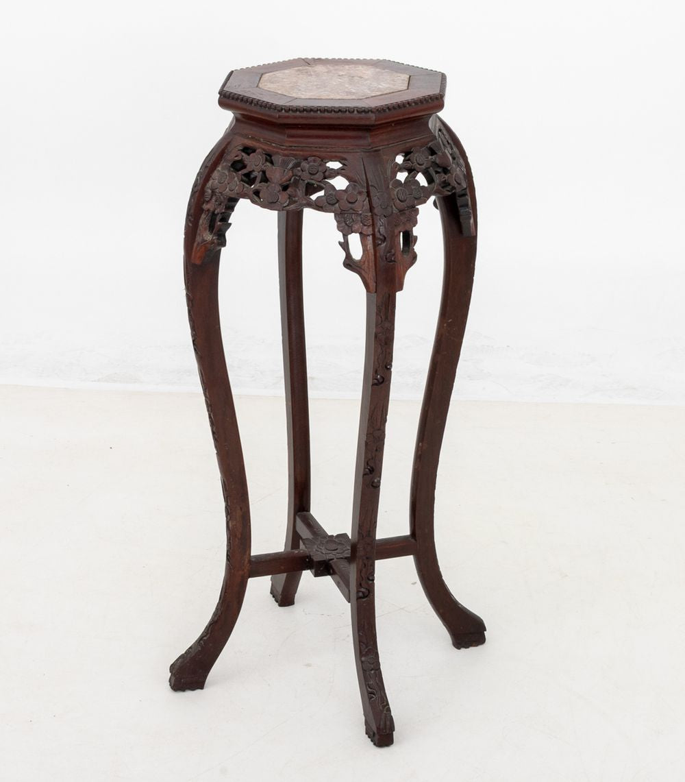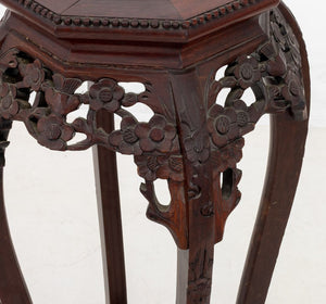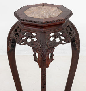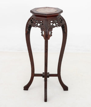 Chinese Carved Hardwood and Marble Pedestal Table, early 20th century, the octagonal inset top above a carved frieze on scrolled legs joined by an X stretcher. 36" H x 15" W x 15" D. Keywords: Asian Arts, Furniture, Antique, Lamp table, Side Table, Display stand, Sculpture gallery, Plant stand, Interior Design, Decorative Arts