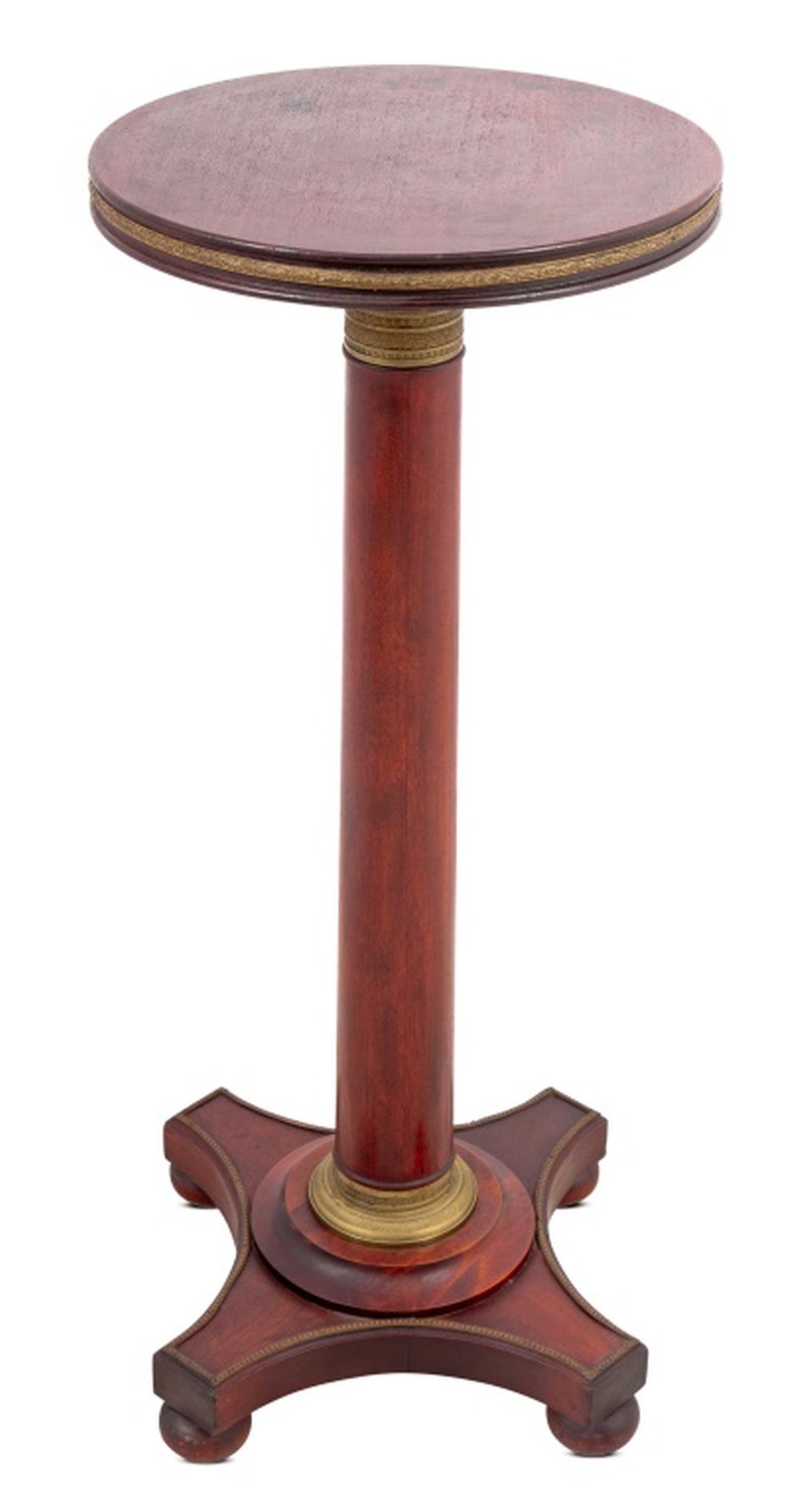 French Empire Style Gilt Metal Mounted Mahogany Pedestal, early 20th century,  the circular top on a tapering column on a quadripartite plinth and ball feet.