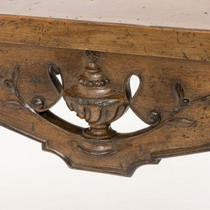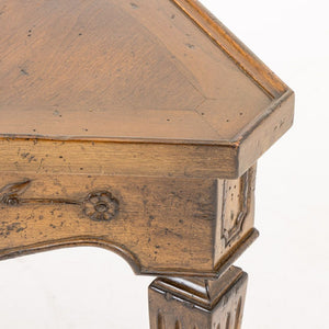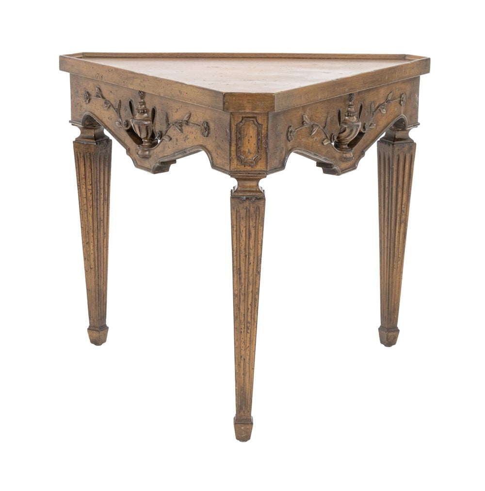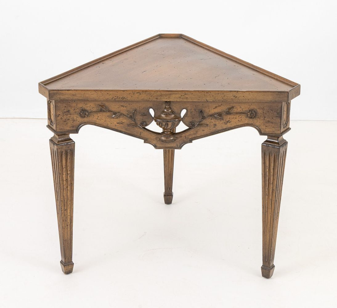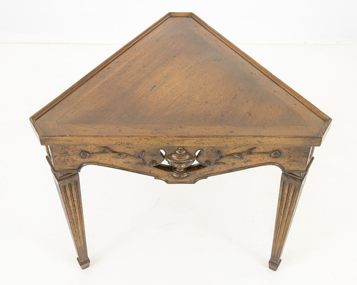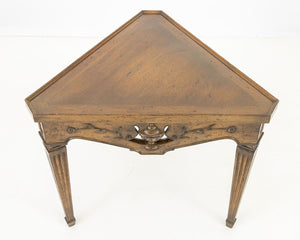 French Provincial Style Triangular Walnut Side Table, with pierced oil lamp motif apron atop three fluted legs. 24.5" H x 29.75" W x 26" D. Provenance: From an Upper East Side Estate. Keywords: Vintage Furniture, Louis XVI style, Corner table, Occasional table, End table, Lamp table, Triangle, Interior design, Decorative Arts