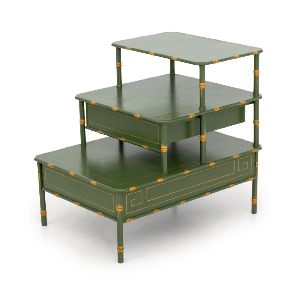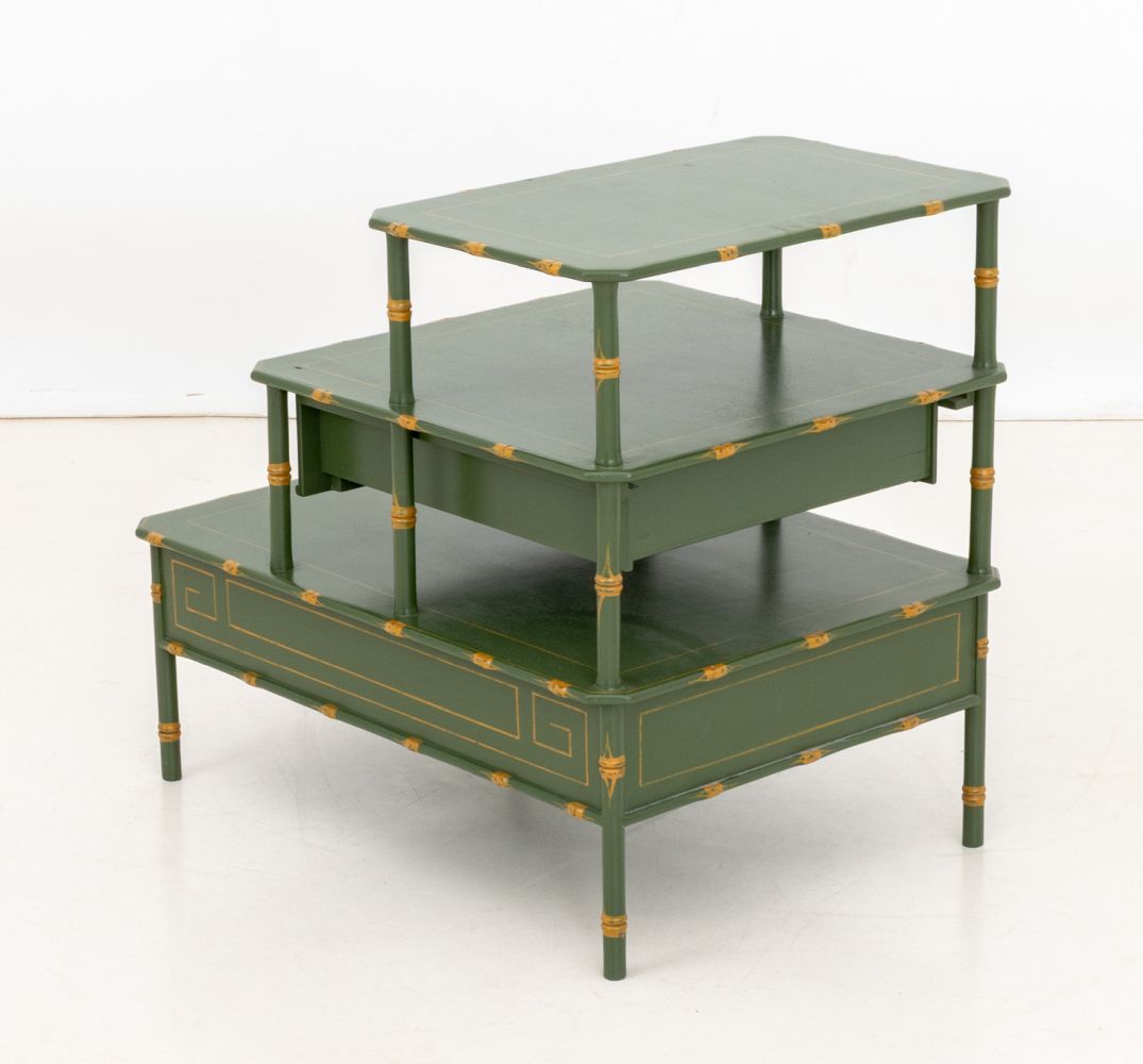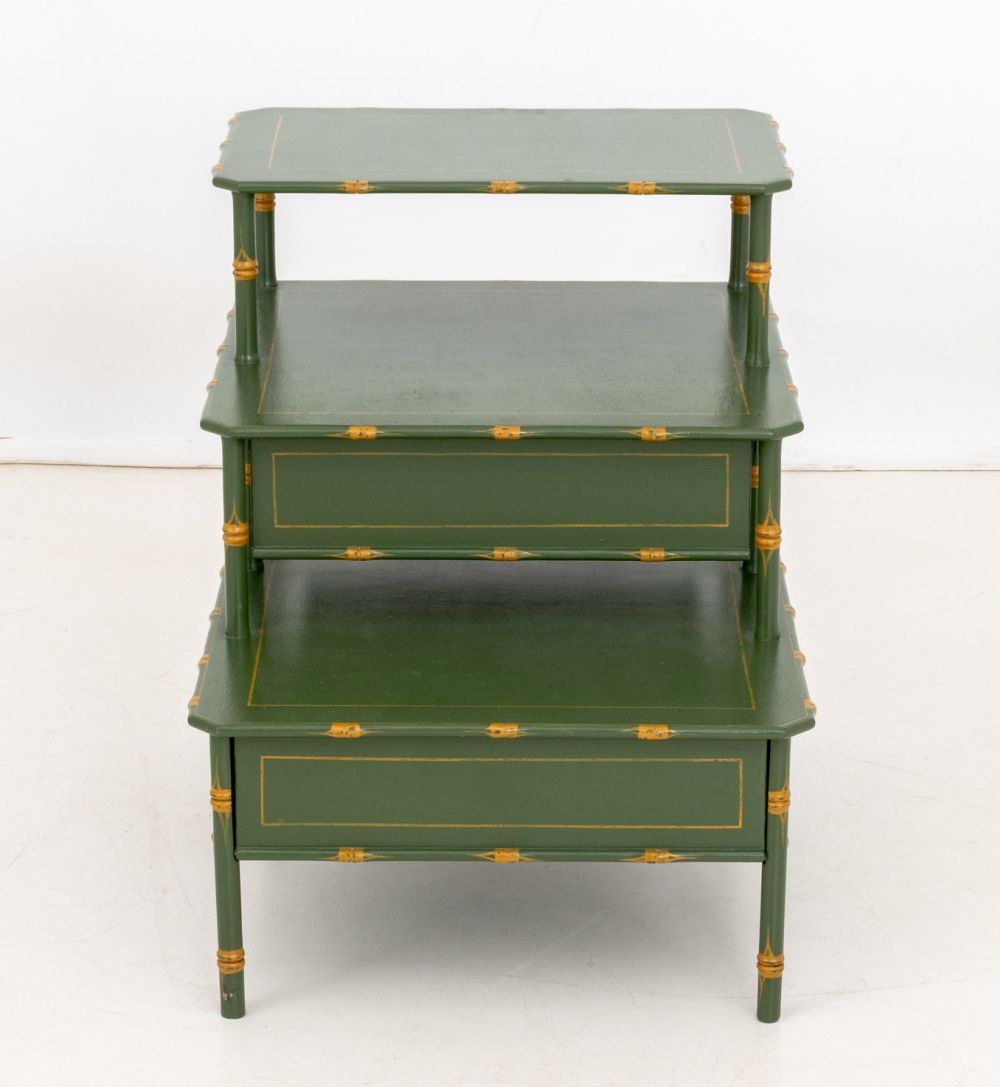 Green Lacquered and Yellow Painted Three-Tier Bedside Table, with two drawers. 26" H x 21.25" W x 28" D. Provenance: From a 955 Fifth Avenue Apartment. Keywords: Vintage Furniture, Side table, Shelving, Display shelf, Etagere, End table, Occasional table, Nightstand, Interior design, Decorative Arts