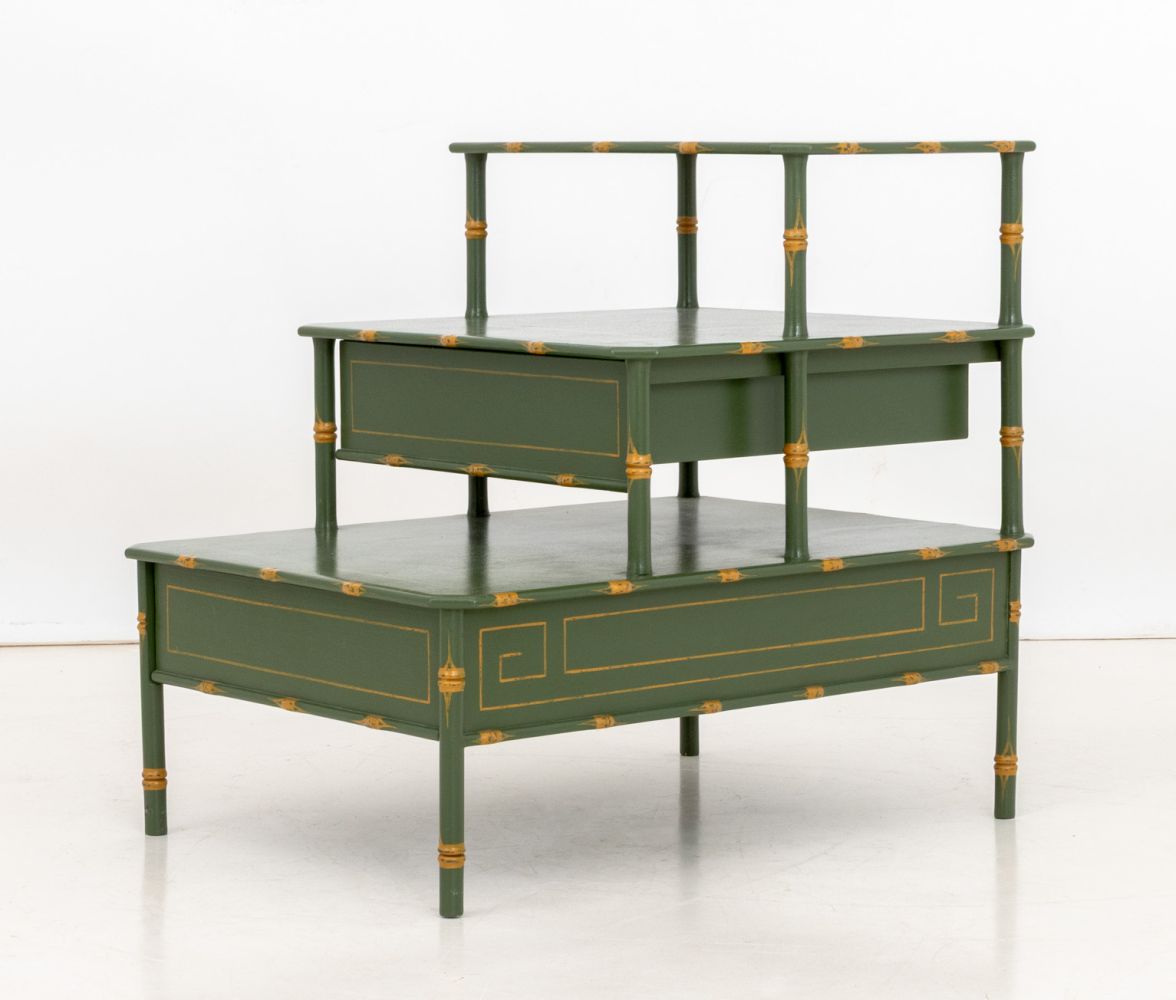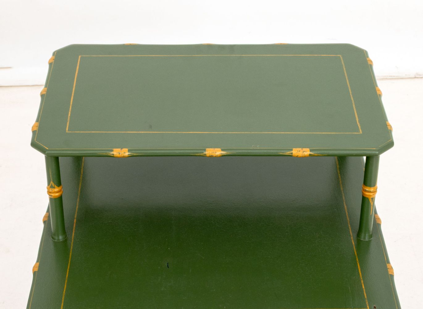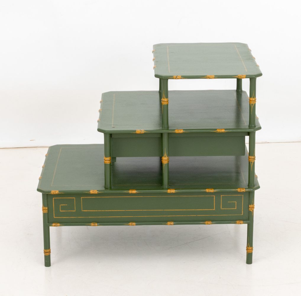 Green Lacquered and Yellow Painted Three-Tier Bedside Table, with two drawers. 26" H x 21.25" W x 28" D. Provenance: From a 955 Fifth Avenue Apartment. Keywords: Vintage Furniture, Side table, Shelving, Display shelf, Etagere, End table, Occasional table, Nightstand, Interior design, Decorative Arts