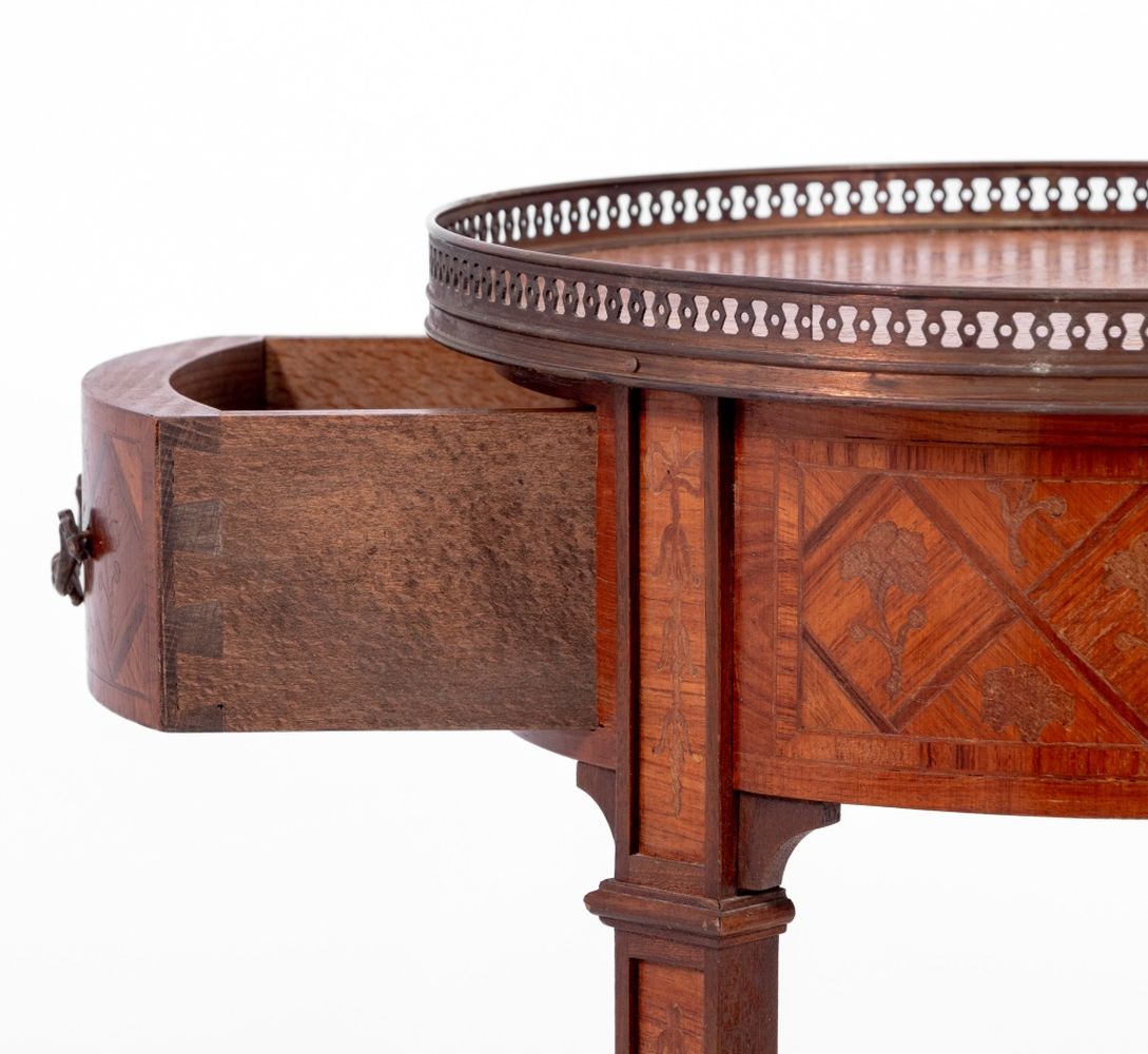 Louis XV Style Gilt Metal Mounted Kingwood Marquetry and Parquetry Inlaid Circular Side Table, 20th century, the pierced gallery top above a frieze drawer, on cabriole legs joined by an undertier.