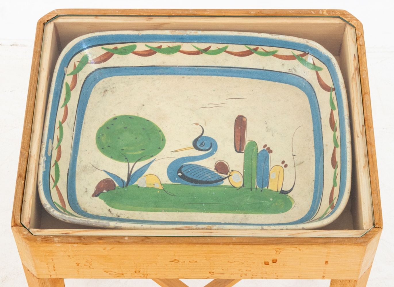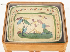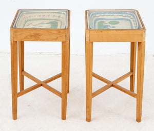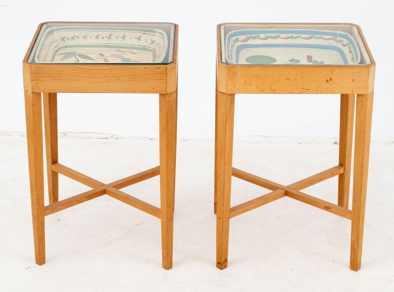 Pair of Mexican Ceramic Dish Inset Side Tables, wood with glass tops. 21.25" H x 14.5" W x 12.5" D. Provenance: From a 60 East End Avenue Estate. Keywords: Art Pottery, Folk Art, Vintage Furniture, End tables, Accent tables, Interior design, Decorative Arts