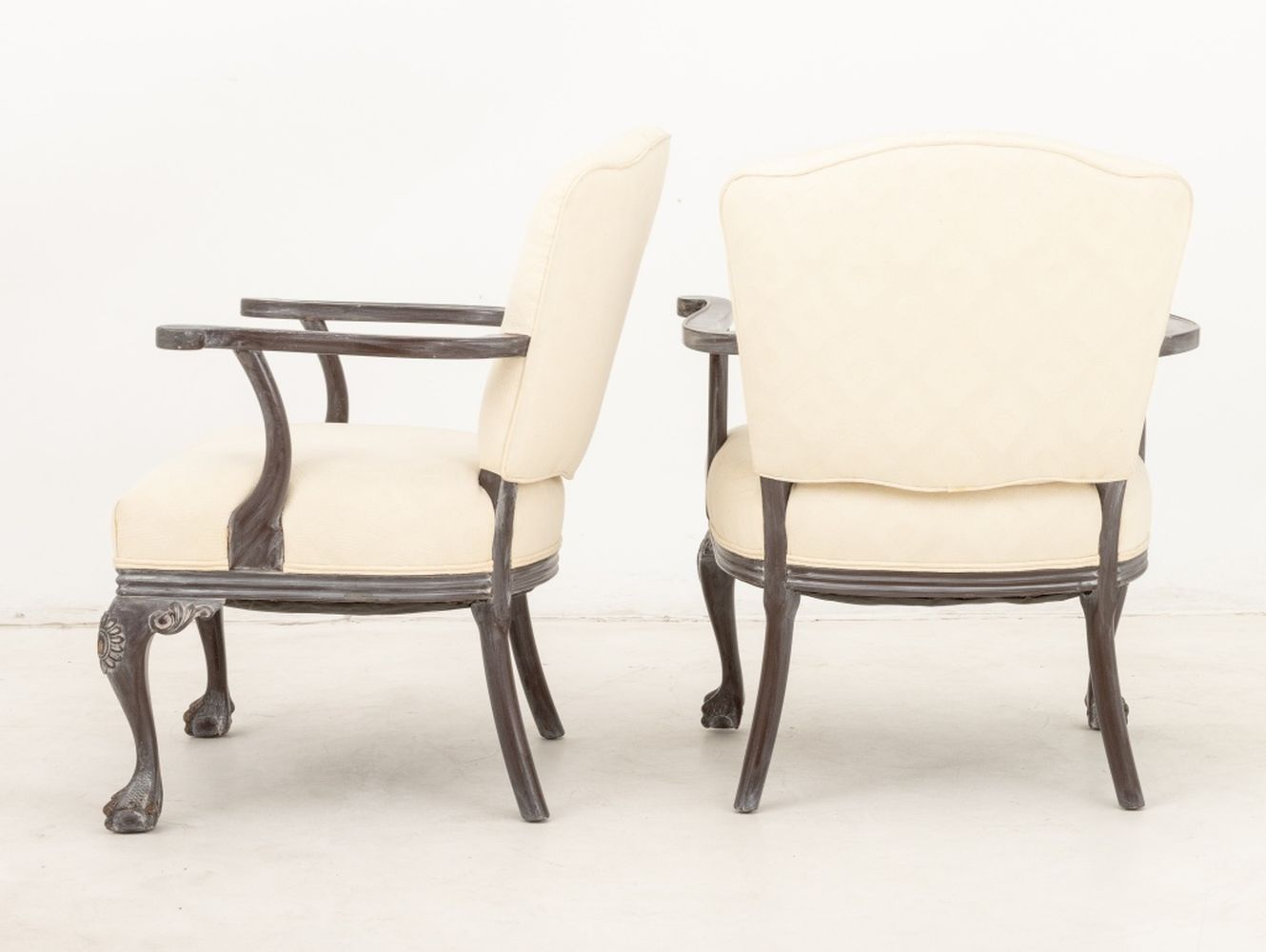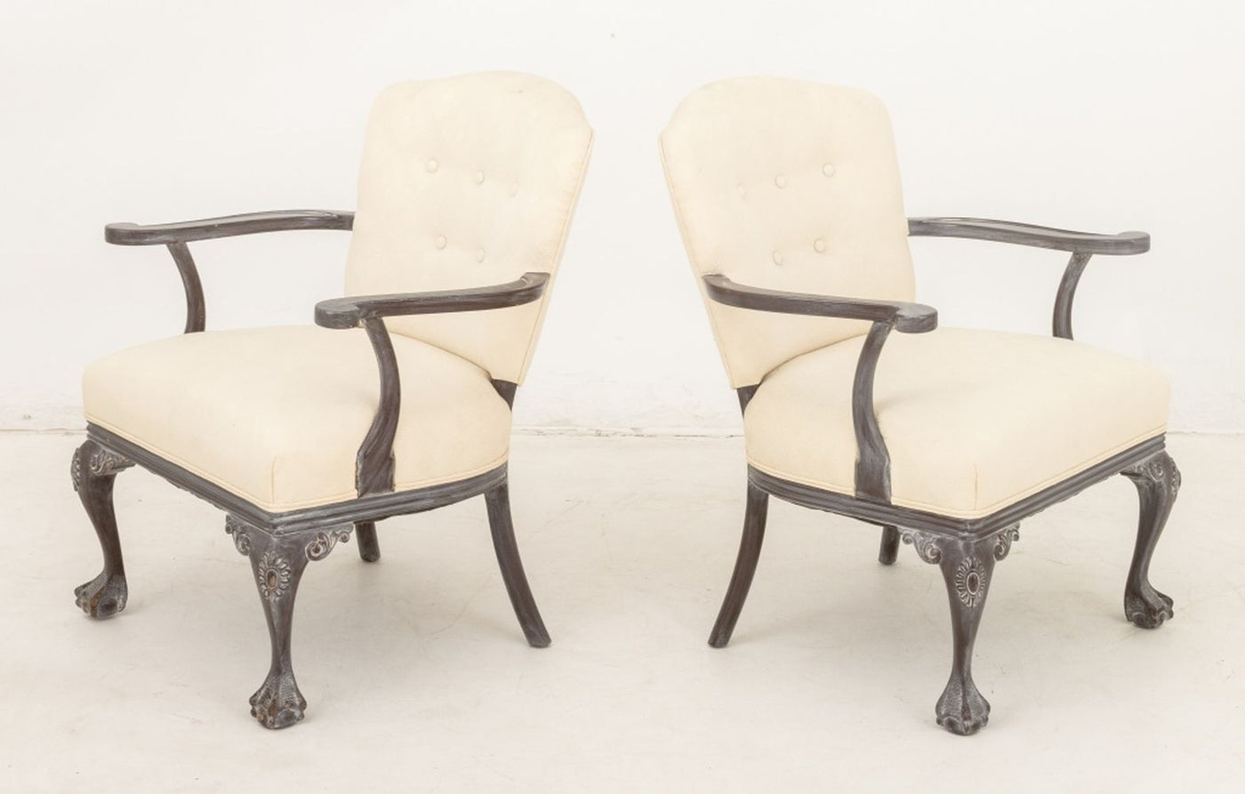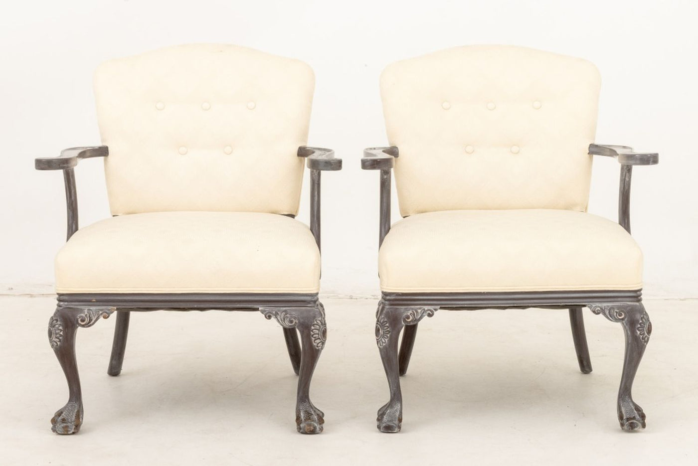Pair of Modern Painted Wood Arm Chairs, each with white cotton upholstered cushion and on two front claw and ball feet. 33.5" H x 36.5" W x 20" D; seat: 18" H. Provenance: From a Greenwich, Connecticut Collection. Keywords: Furniture, Seating, English style, Fauteuil, Easy chair, Interior design, Decorative Arts