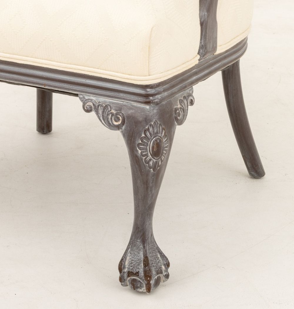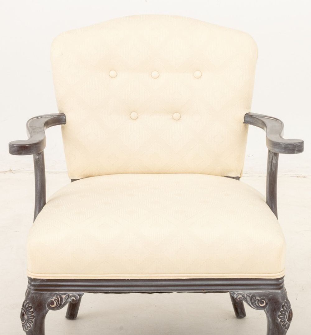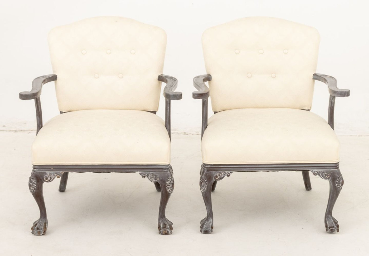 Pair of Modern Painted Wood Arm Chairs, each with white cotton upholstered cushion and on two front claw and ball feet. 33.5" H x 36.5" W x 20" D; seat: 18" H. Provenance: From a Greenwich, Connecticut Collection. Keywords: Furniture, Seating, English style, Fauteuil, Easy chair, Interior design, Decorative Arts