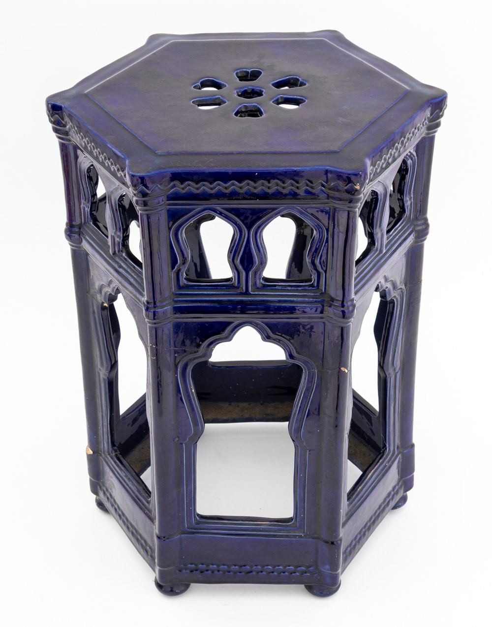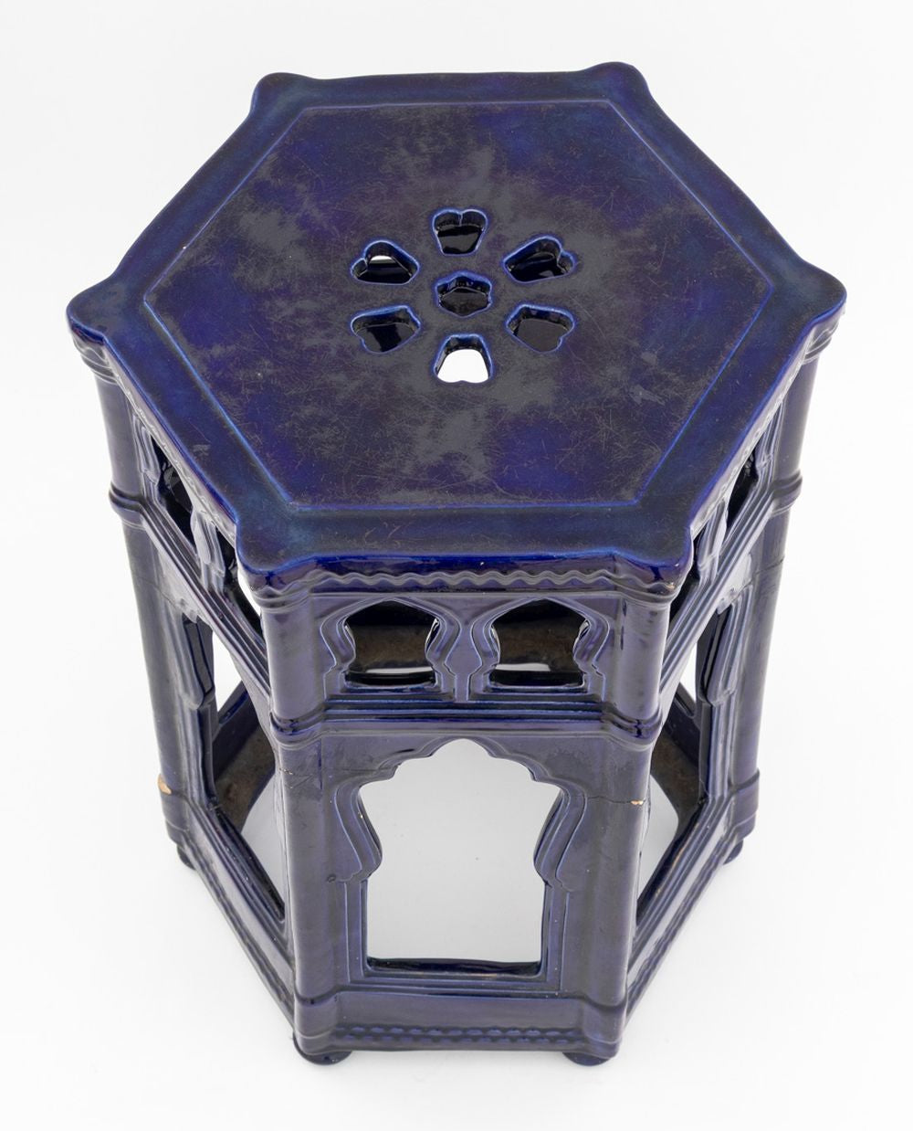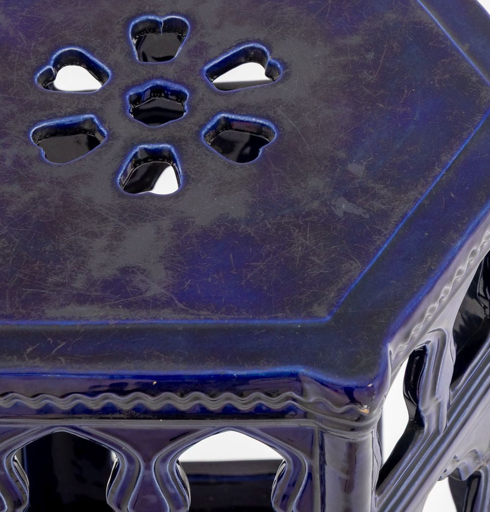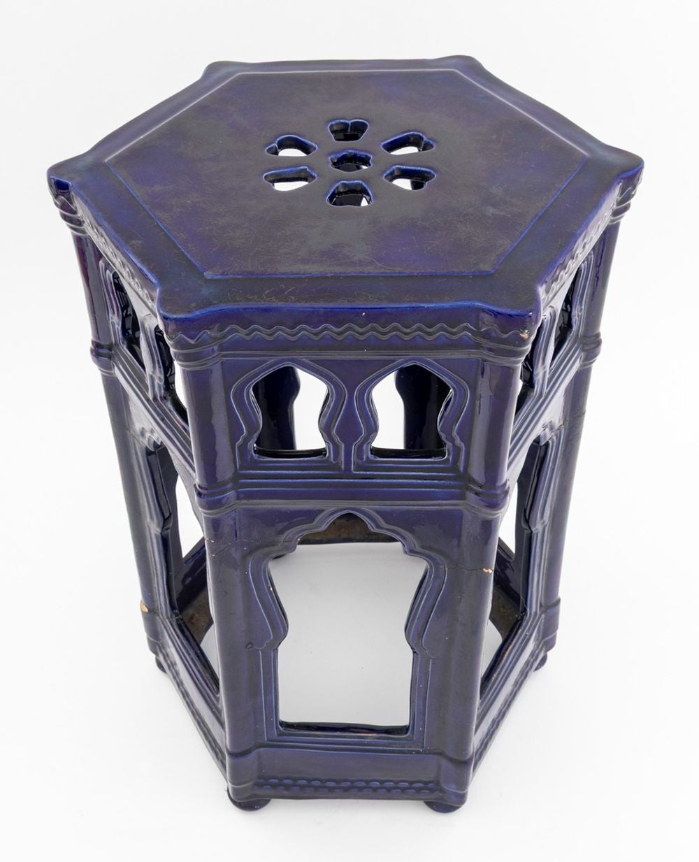 Moroccan Style Cobalt Blue Glazed Ceramic Garden Stool, with hexagonal top of pierced archways with hexagonal base on 12 bun feet. 17.5" H x 11" W x 13.25" D. Provenance: From an Upper East Side, New York City Collection. Keywords: Vintage Furniture, Side table, Seating, Low stool, Plant stand, Arches, Pierced, Reticulated, Landscape design, Decorative Arts