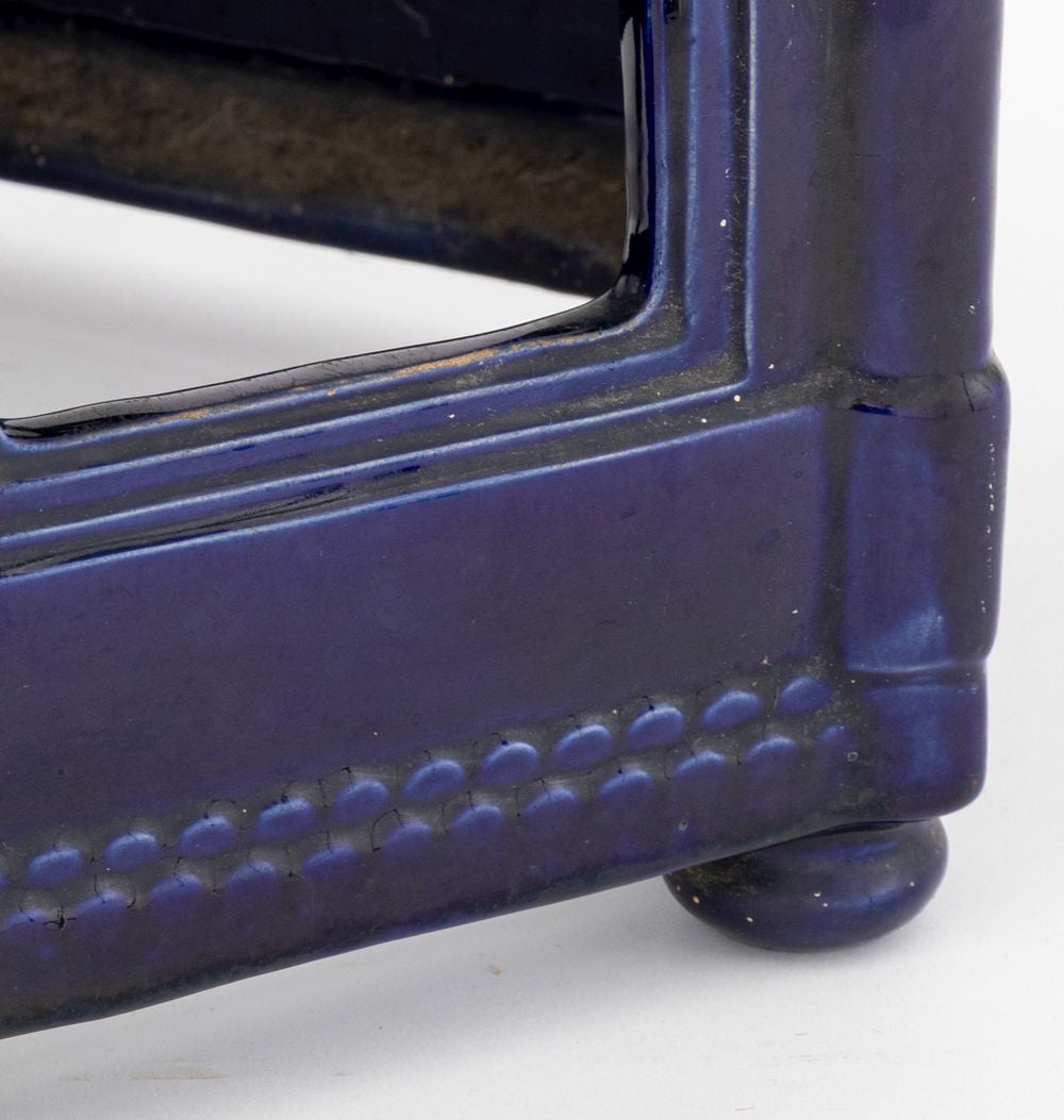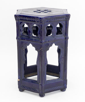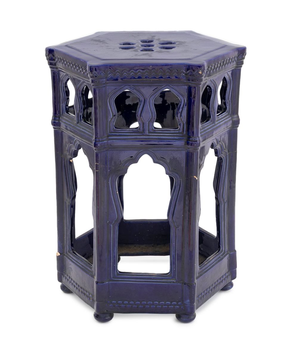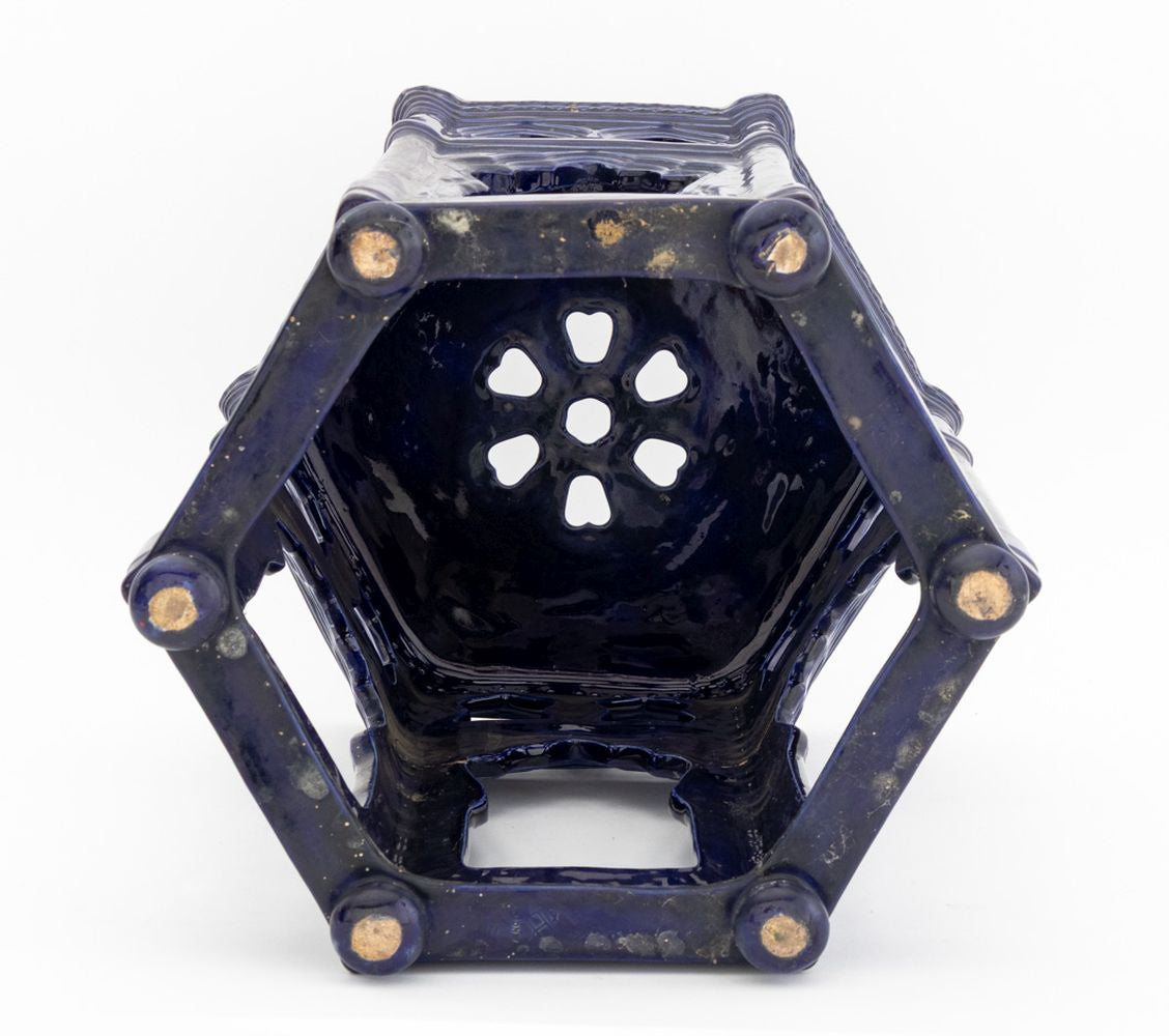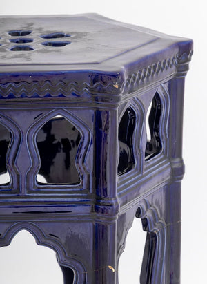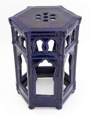 Moroccan Style Cobalt Blue Glazed Ceramic Garden Stool, with hexagonal top of pierced archways with hexagonal base on 12 bun feet. 17.5" H x 11" W x 13.25" D. Provenance: From an Upper East Side, New York City Collection. Keywords: Vintage Furniture, Side table, Seating, Low stool, Plant stand, Arches, Pierced, Reticulated, Landscape design, Decorative Arts