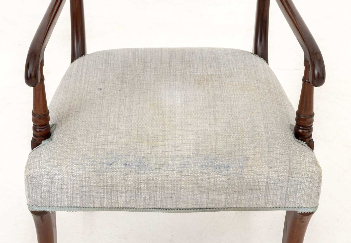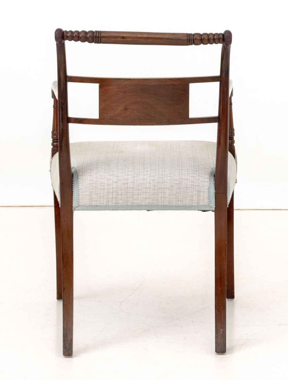 Regency Style Mahogany Armchair, turned wood top rail, grey upholstery. 32.5" H x 20" W x 21" D; arm: 26.25" H; seat: 18.5" H. Provenance: From a 955 Fifth Avenue Apartment. Keywords: Furniture, Seating, English Style, British, Antique, Openwork, Interior design