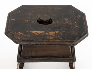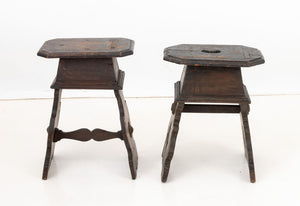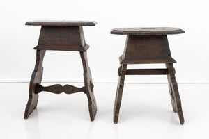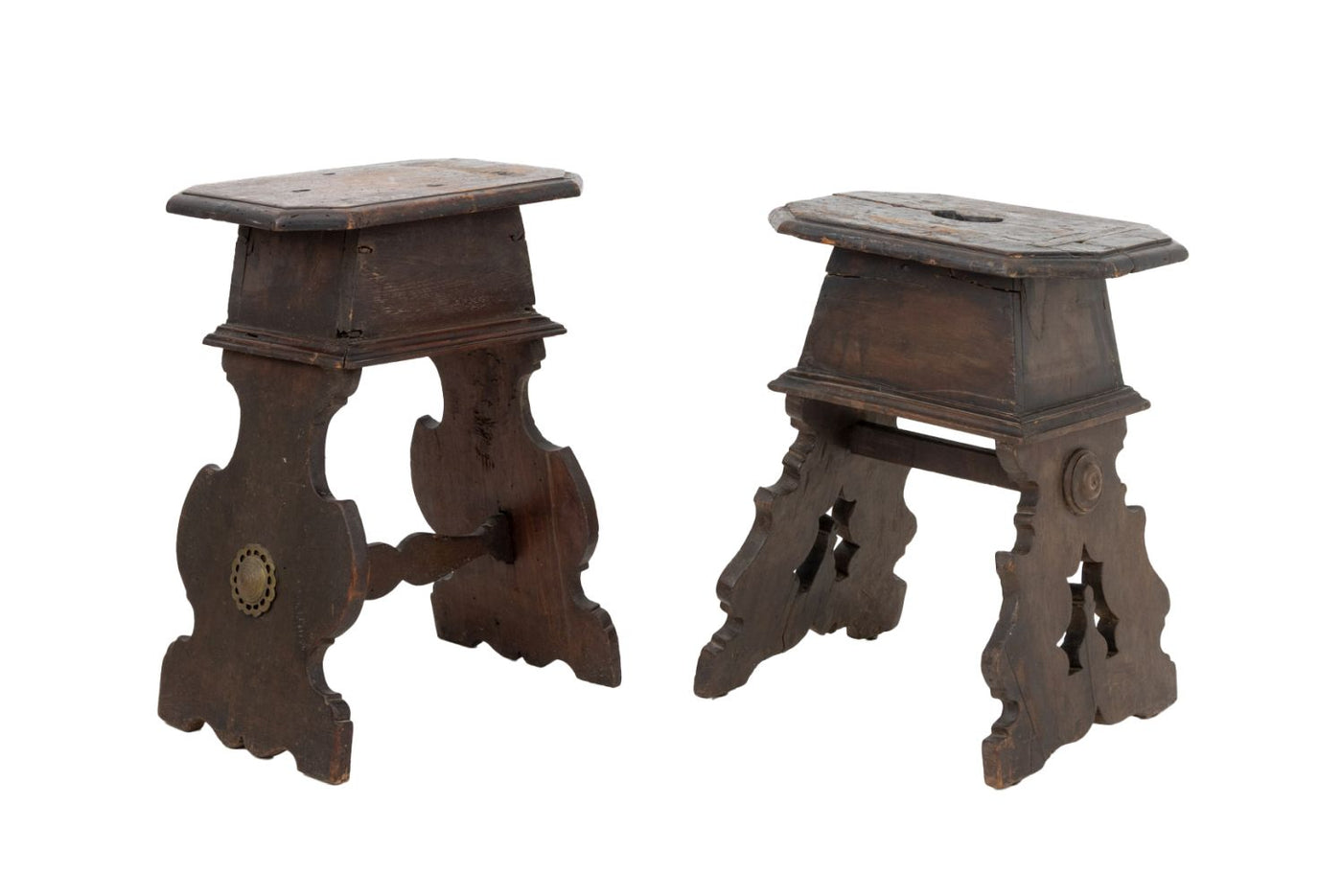 Assembled Pair of Renaissance Revival Carved Walnut Stools, each with rectangular canted corner tops above apron box with sgabello form supports on each, one with brass mounts attachments and each with H-stretcher. Larger: 22.75" H x 15" W x 11.25" D. Provenance: From a New York City Collection. Keywords: Antique Furniture, Seating, Chairs, Furnishings, Interior design, Decorative Arts