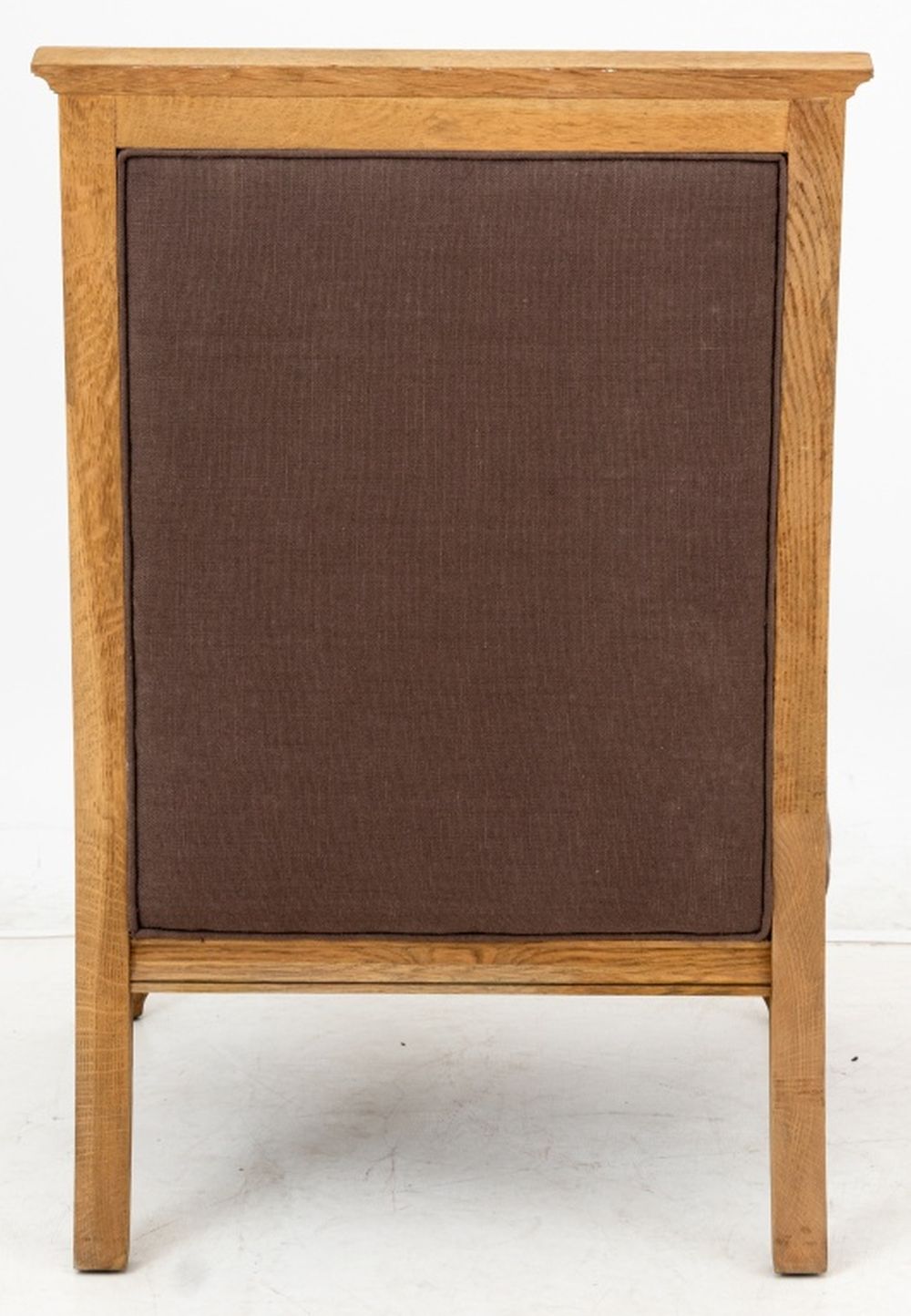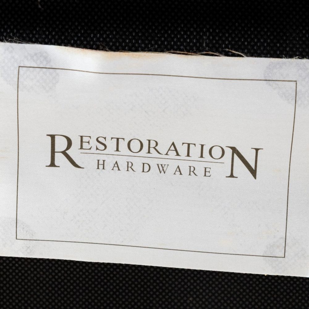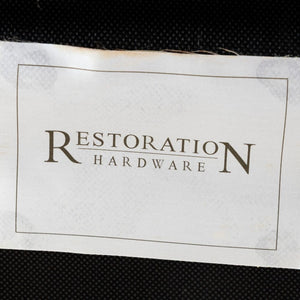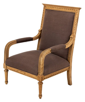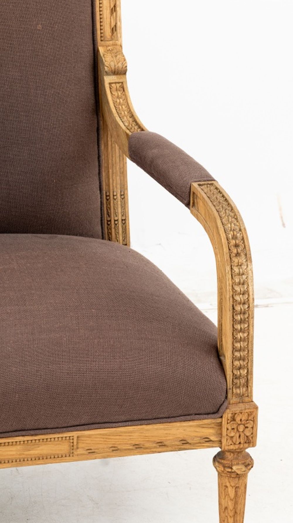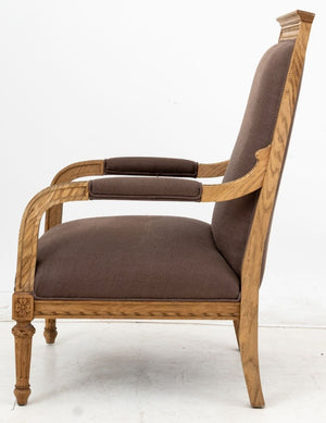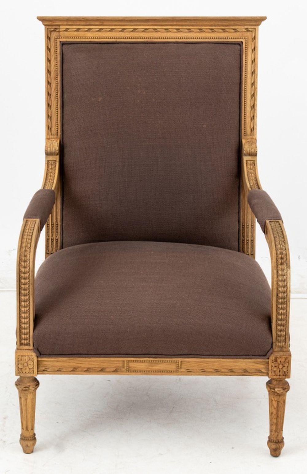 Restoration Hardware Louis XVI Style Giltwood Armchair, upholstered in grey linen to seat and arms, labeled "Made for Restoration Hardware" to underside. 40.5" H x 26.25" W x 25" D; seat: 16" H. Provenance: From an Upper East Side Collection. Keywords: French Style, Furniture, Seating, Contemporary, Bergere, Fauteuil, Interior design, Decorative Arts