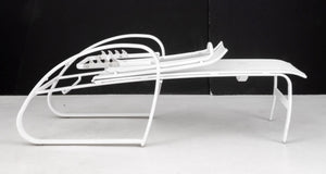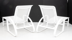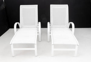 Set of Four Telescope Casual Furniture Outdoor Chaise Longues, white patinated with arms and adjustable backs. Back up: 41" H x 65" W x 29.5" D; seat: 16.5" H. Provenance: From a Long Island Estate. Keywords: Designer, American Furniture, Patio Furniture, Sun lounger, Daybed, Decorative Arts