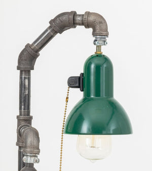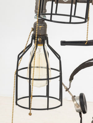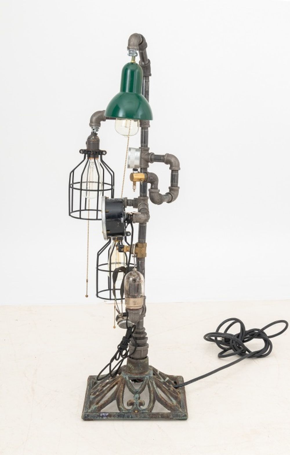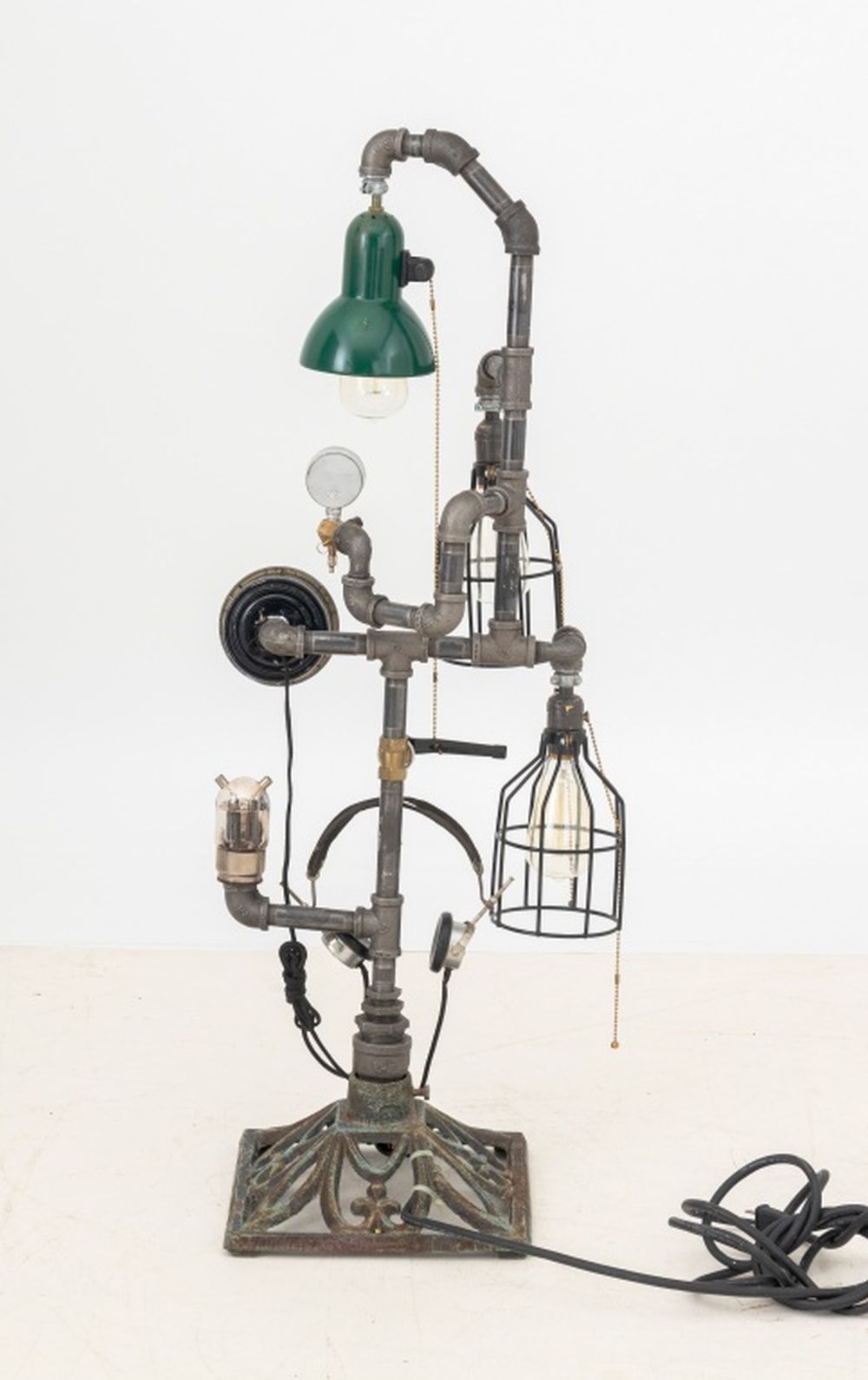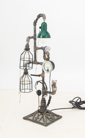 Steam Punk Table Lamp, with three light bulb fixtures, plumbing tubing, RCA tube, and gauges. 40.25" H x 15" W x 11" D. Provenance: From an East 63rd Street, New York City Collection. Keywords: Lighting, Found Object, Sculptural, Accent lamp, Outsider Art, Decorative Arts