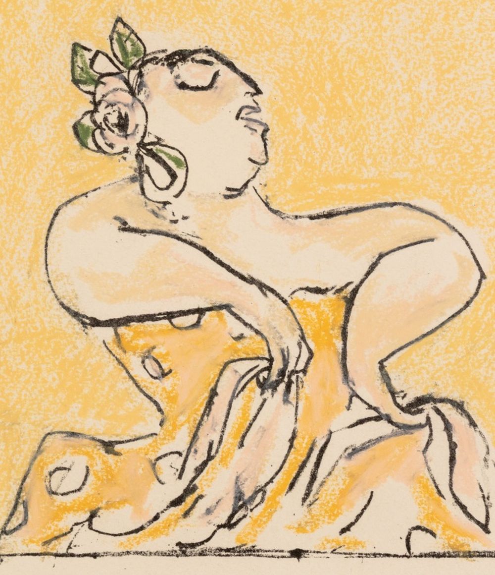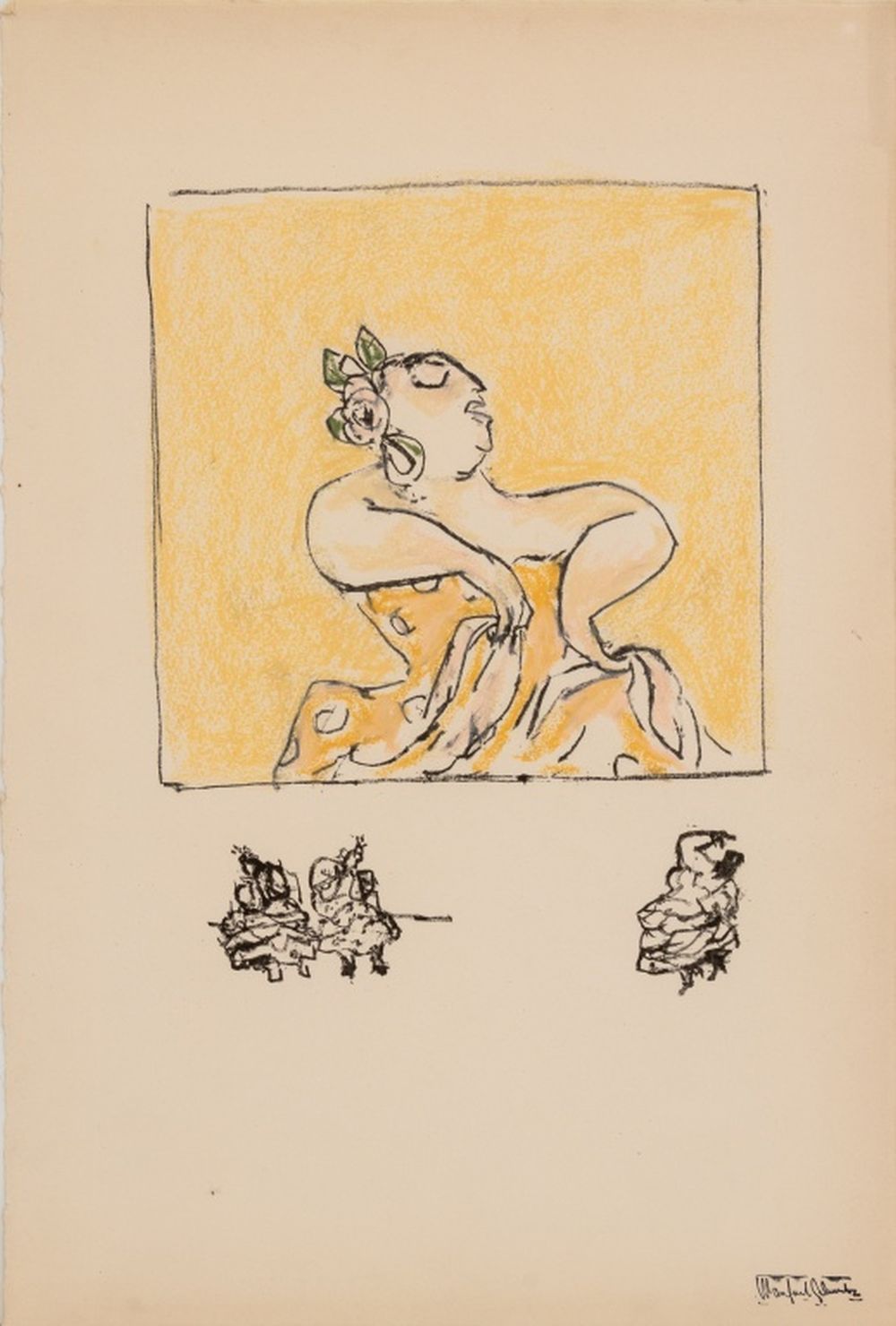 Manfred Schwartz (American, b. Poland, 1909-1970), Flamenco Dancer, Lithograph and Pastels on Paper, three dancing figures underneath, with the artist's signature stamped lower right, unframed. Image: 13.5" H x 10.25" W; sheet: 22.25" H x 15" W. Provenance: From a 35 East 75th Street Estate. Keywords: Prints, Multiples, Color Study, Abstraction, Performer, Bailaora, Figural, Figurative, Rose, Whimsical, Colorful, Polychrome, Provincetown, P-town Artist, Post-War Art