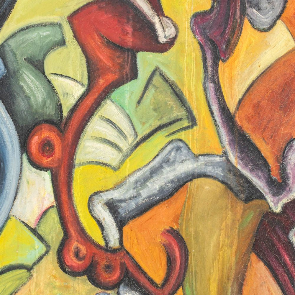 Marilla Palmer (American, b. 1955), "Modern World", Oil on Canvas, 1985, signed "M. Palmer" and dated lower left, signed, titled, and dated to verso, wood frame. Image: 71.75" H x 49.75" W; frame: 73.25" H x 51.25" W. Provenance: From an East Village and Hamptons Collection. Keywords: Painting, Oil painting, Works on Canvas, Abstraction, Figural, Figurative, Polychrome, Modernist, Modernism, Women Artists, 20th Century Art, Contemporary Art