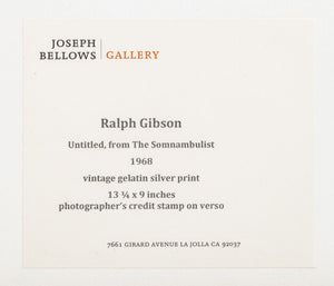 Ralph Gibson (American, b. 1939), "Untitled" from the Somnambulist, Vintage Gelatin Silver Print, 1968, artist stamp to the verso, with Joseph Bellows Gallery label to the reverse, ebonized wood frame. Image: 12.5" H x 8.5" W; frame: 20.75" H x 16.75" W x 1.5" D. Provenance: Joseph Bellows Gallery, San Diego. From a New York City Area Collection. Keywords: Photography, Photographer, Print, Fountain pen, Landscape, Beach, Monochrome, Black and White, Film, SLR, Vintage