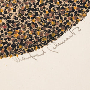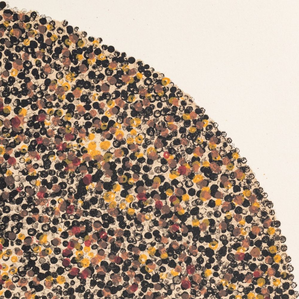 Manfred Schwartz (American, b. Poland, 1909-1970), Tondo Etretat, Lithograph on Paper, mid 20th century, numbered edition "10/75" lower left, signed in pencil and with the artist's signature stamped lower right, unframed. Image: 16.25" H x 16.25" W; sheet: 26.25" H x 19.25" W. Provenance: From a 35 East 75th Street Estate. Keywords: Prints, Multiples, Abstract Composition, Abstraction, Circular, Circle, Galaxy, Stars, Celestial, Constellations, Universe, Sands, Beach, Whimsical, Colorful, Polychrome, Pointilist, Pointilism, Provincetown, P-town Artist, Post-War Art