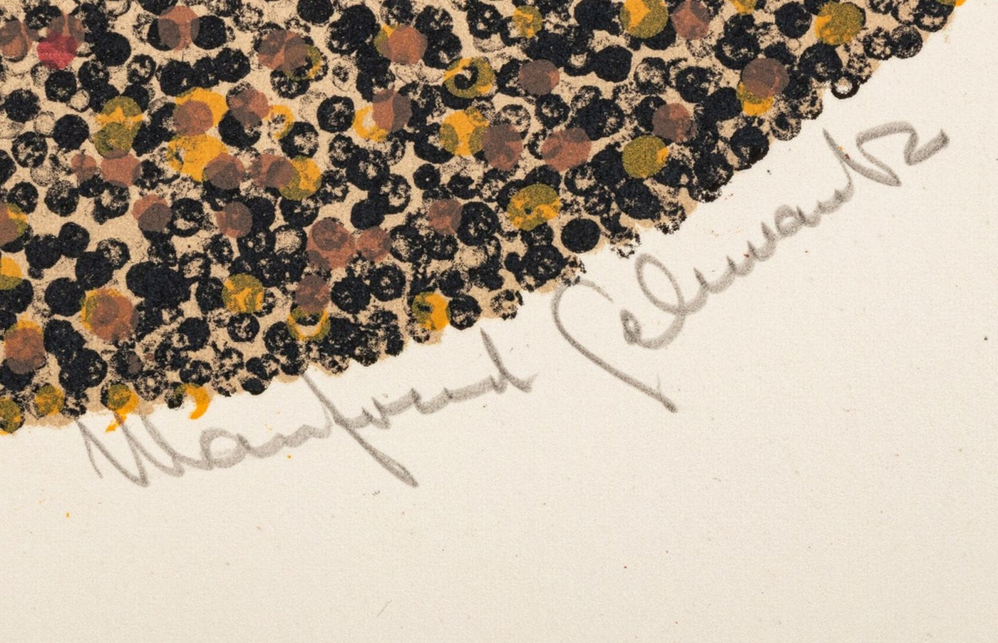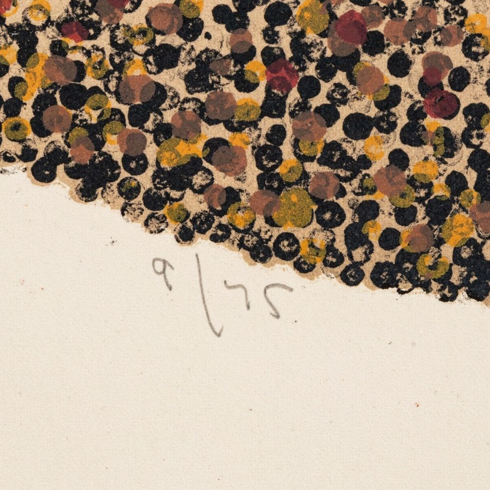Manfred Schwartz (American, b. Poland, 1909-1970), Tondo Etretat, Lithograph on Paper, mid 20th century, numbered edition "9/75" lower left, signed in pencil and with the artist's signature stamped lower right, unframed. Image: 16.25" H x 16.25" W; sheet: 26.25" H x 19.25" W. Provenance: From a 35 East 75th Street Estate. Keywords: Prints, Multiples, Abstract Composition, Abstraction, Circular, Circle, Galaxy, Stars, Celestial, Constellations, Universe, Sands, Beach, Whimsical, Colorful, Polychrome, Pointilist, Pointilism, Provincetown, P-town Artist, Post-War Art