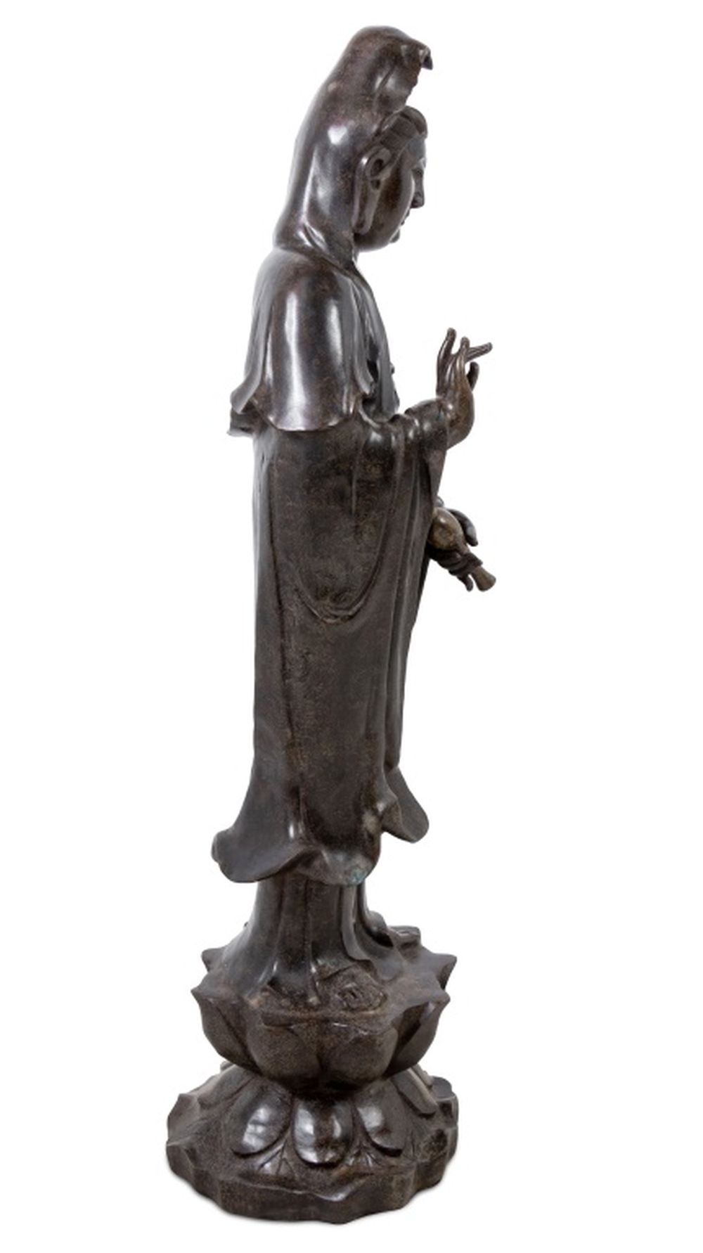 Chinese Standing Guanyin Patinated Bronze Sculpture, the bodhisattva donning floral pattern robes and holding an articulated vase, atop a double lotus base. 47" H x 14" W x 13" D. Keywords: Asian Art, China, Sculpture, Bronzier, Antique, Religious Art, Buddhism, Buddhist, Deity, Figural, Figurative, Decorative Arts