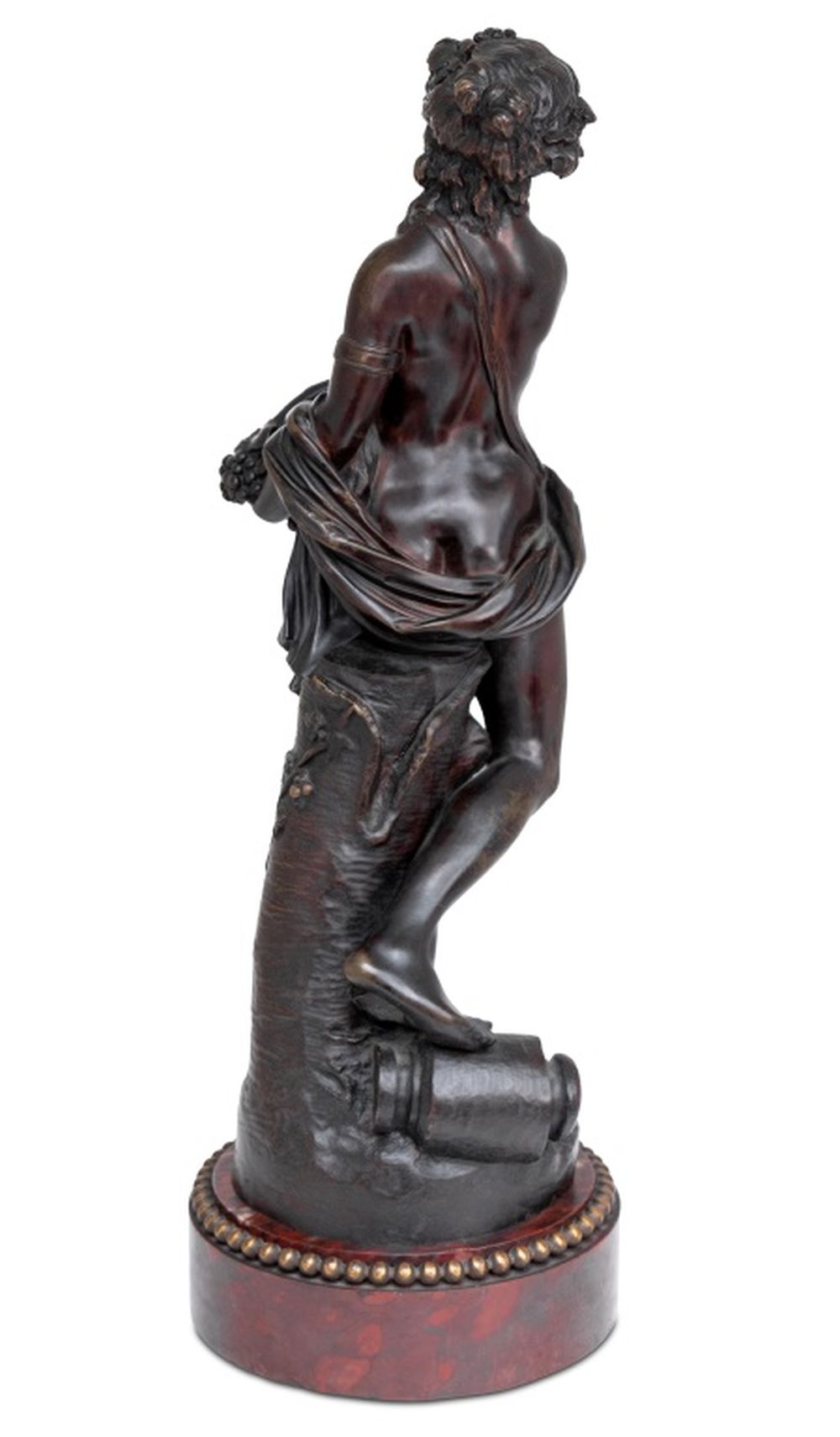 Clodion (Claude Michel, French, 1738-1814) "Bacchante" Patinated Bronze Sculpture, 19th century, on a rouge griotte circular plinth, unsigned. 16.5" H x 6.5" Diameter. Keywords: French Art, Bronzier, Statue, , Wine Festival, Bacchanalia, Nymph, Maened, Interior Design, Decorative Arts