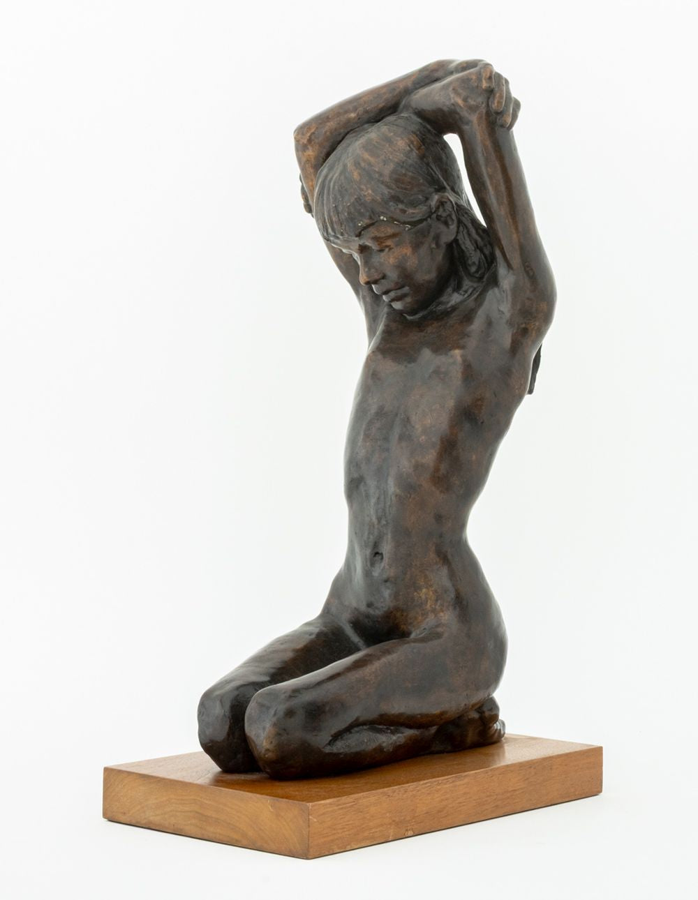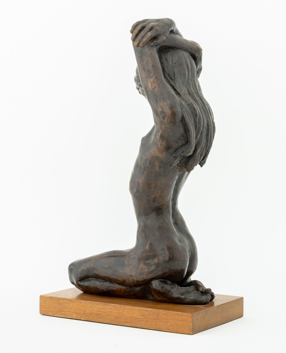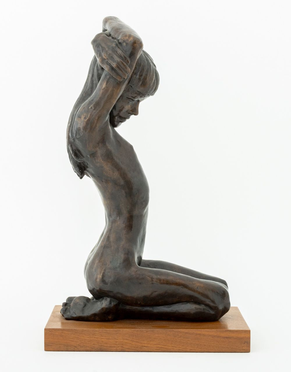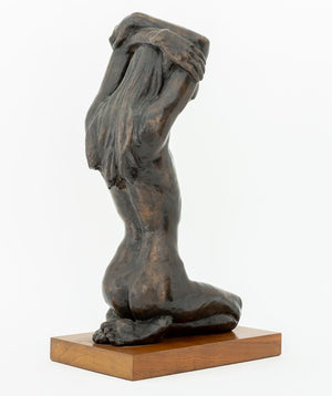 Desmond Hale Fountain (Bermudian, b. 1946) Kneeling Nude Female Figure Patinated Bronze Sculpture, signed, numbered edition "4/4", with London foundry mark to leg, mounted atop a wooden plinth. Overall: 23" H x 13.5" W x 8" W. Provenance: From a Chelsea, New York City Estate. Keywords: Statue, Bronzier, Figural, Figurative, Nude girl, Youth, Female figure, Caribbean Artists, Contemporary Art