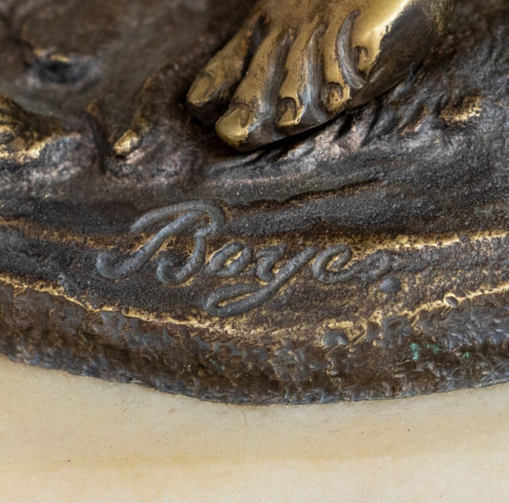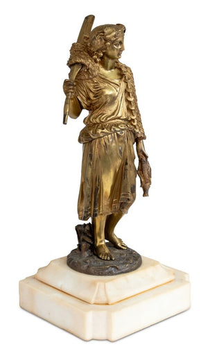 Emile Boyer (French, 1877-1948) "Fisherwoman" Gilt Bronze Sculpture, late 19th century, the standing figure draped in a net, carrying an oar and fish, on a circular base, signed, and with square stepped white marble plinth, initialed "B+J" to underside. 14.5" H x 7" W x 6" D. Keywords: French, Statue, Bronzier, Figural, Female Figure, Commoner, Fisherman, Baye, Classical, French Romanticism, Decorative Arts