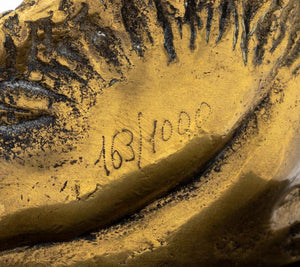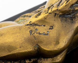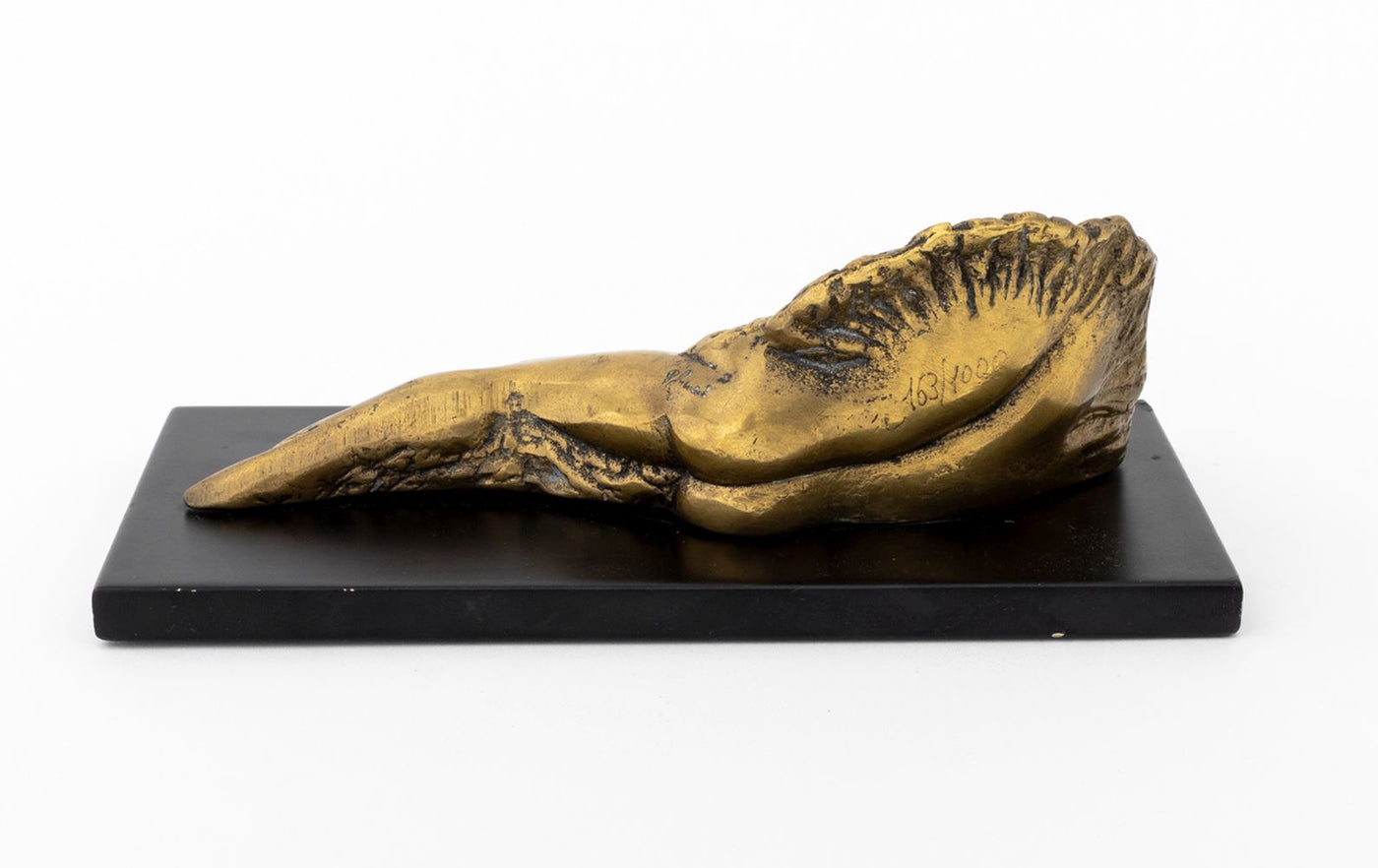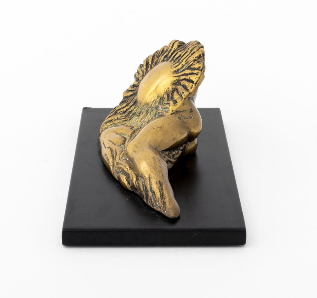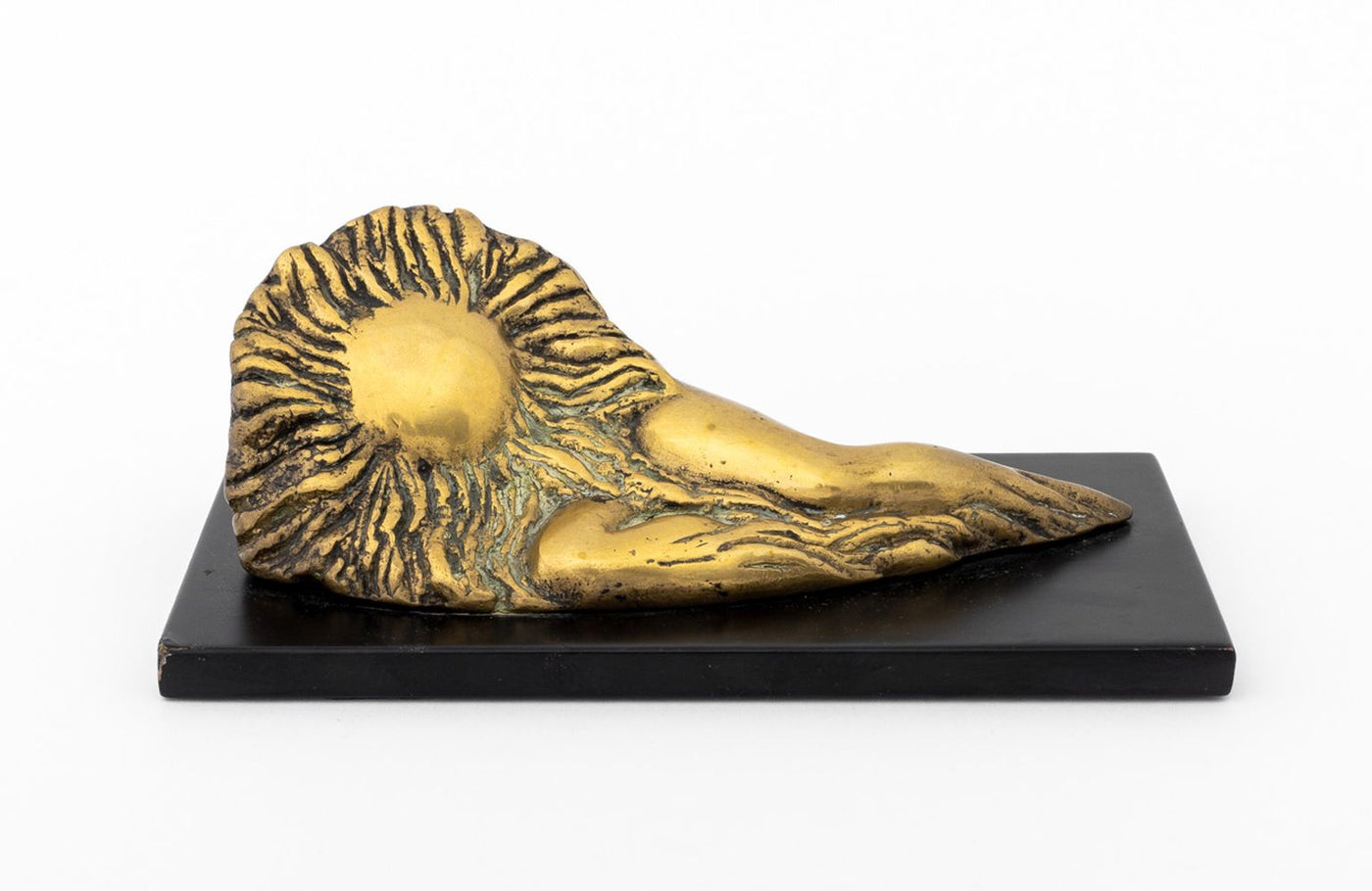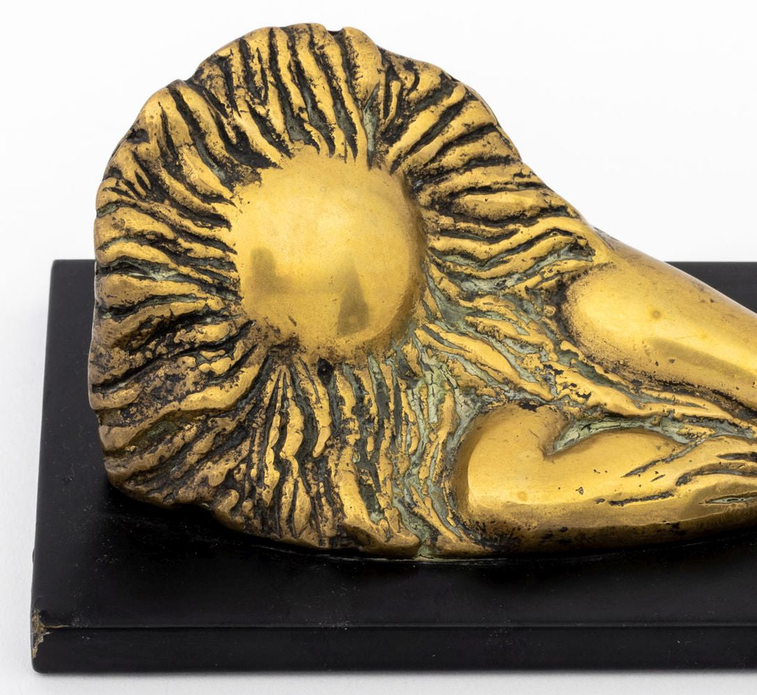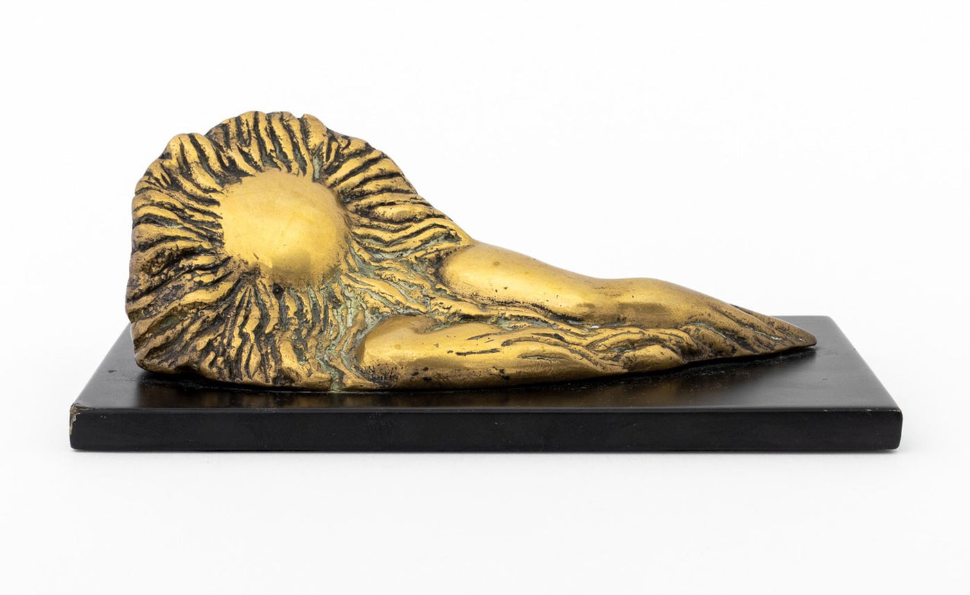 Patrizia Guerresi (Italian, b. 1951) "Donnasole" [Sun Woman] Gilt Bronze Sculpture, 1986, signed and numbered edition "163/1000" to reverse, mounted on an ebonized rectangular base. Overall: 3" H x 8" W x 4" D. Provenance: From an East 78th Street, New York Estate. Keywords: Statue, Bronzier, Figural, Figurative, Figurine, Female figure, Abstract, Contemporary Art, Women Artists, Decorative Arts