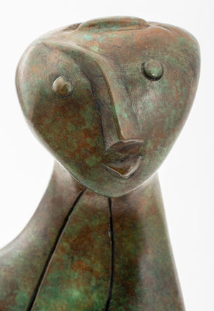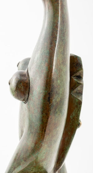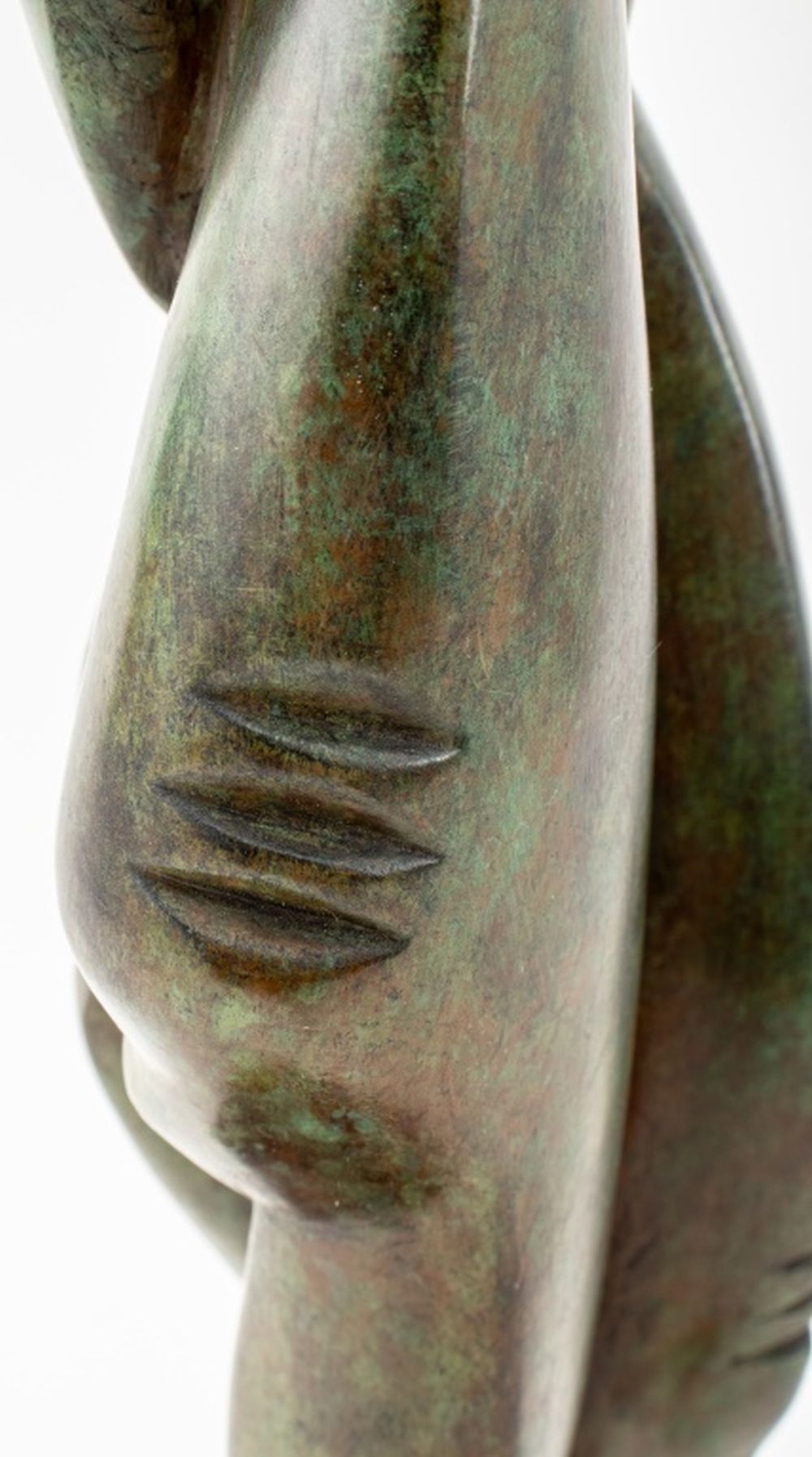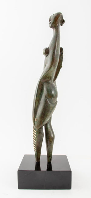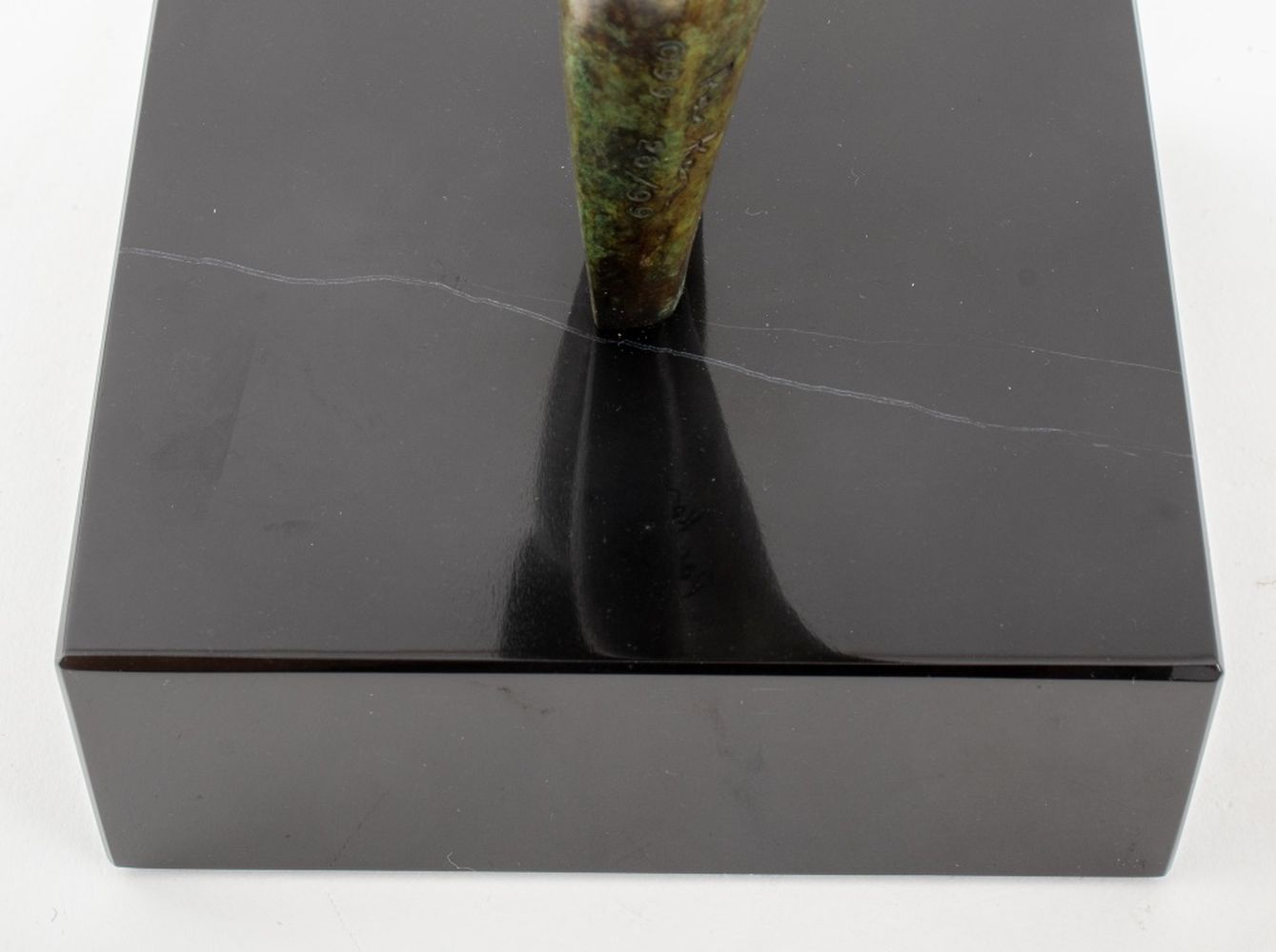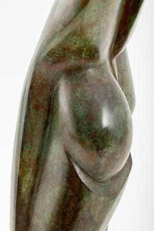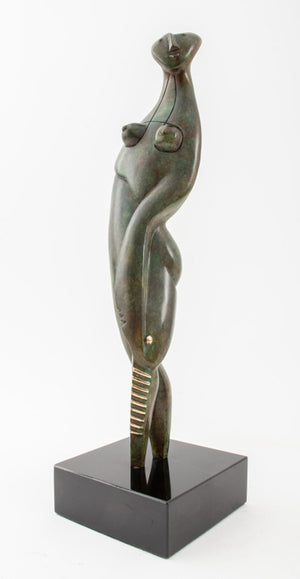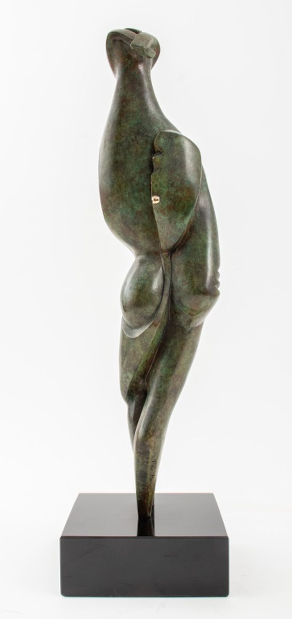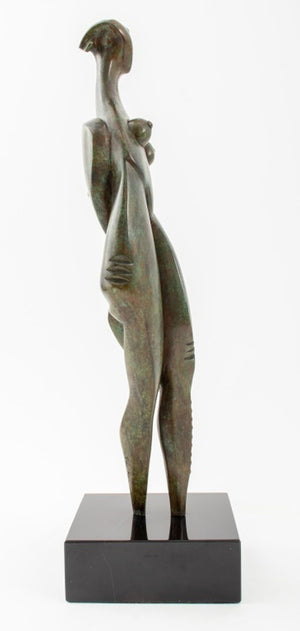 Ronald K. Parker (American, b. 1939) "Life", Verdigris Patinated Bronze Sculpture, 1999, signed "Parker" and marked "c 99 26/99" to leg. 18" H x 5.25" W x 5.25" D. Provenance: From the collection of the publisher. Keywords: Statue, Modern, Abstract, Abstraction, Female figure, Figural, Woman, Tabletop sculpture, Contemporary Art, Decorative Arts