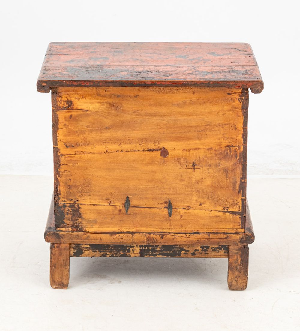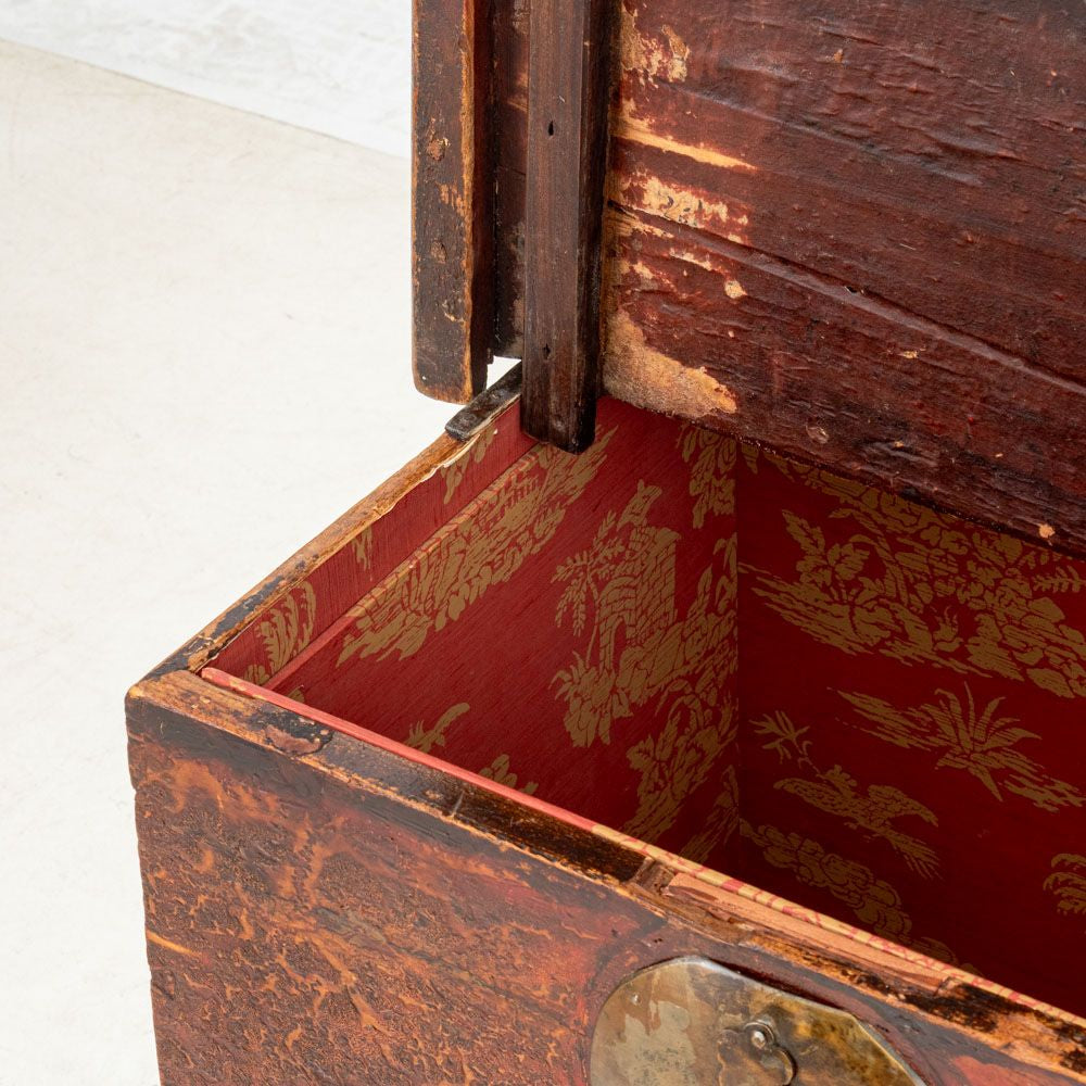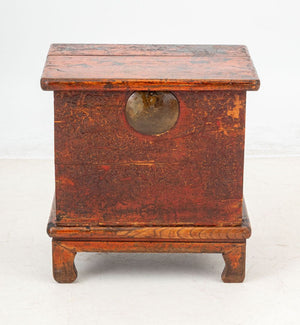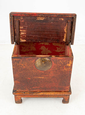 Chinese Red Painted Elm Chest, the removable top opening to storage compartment.