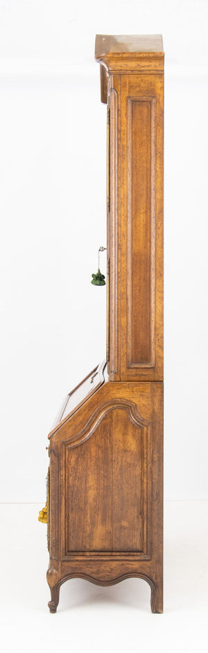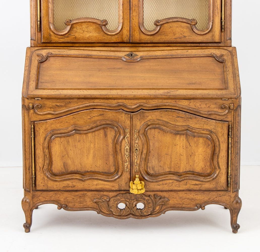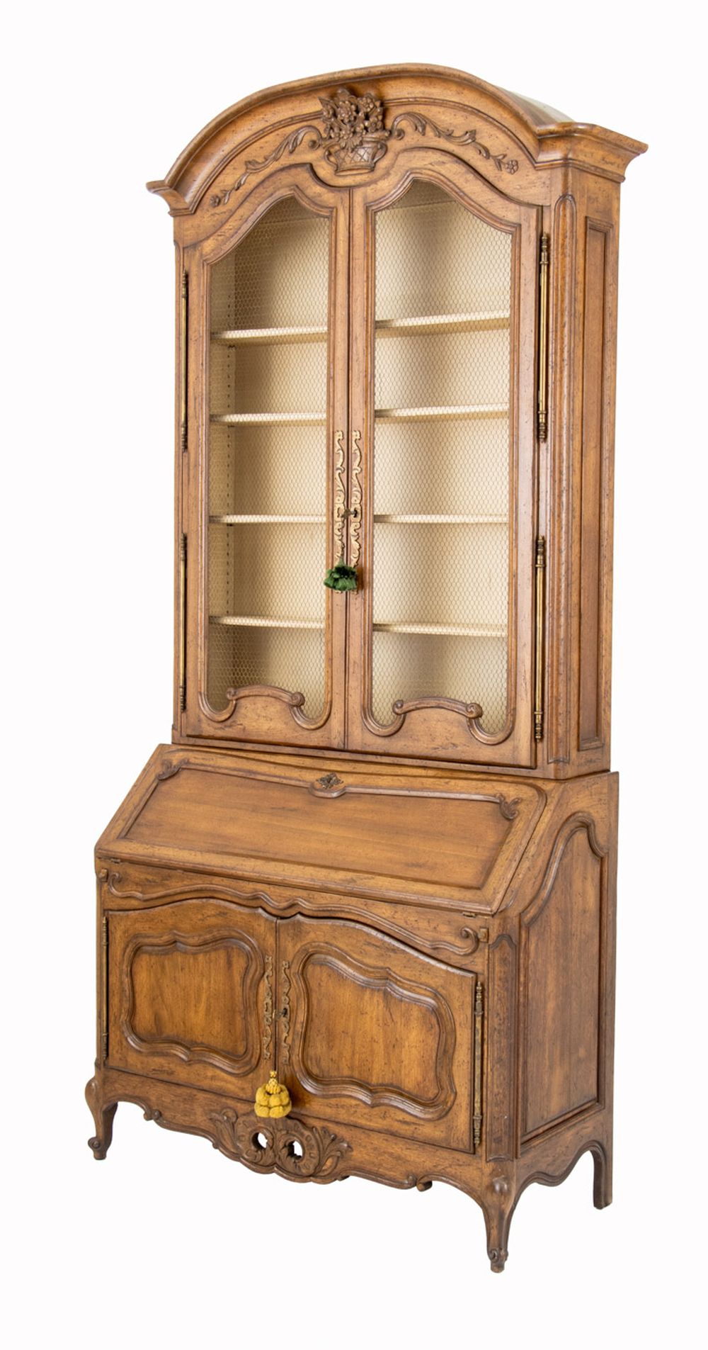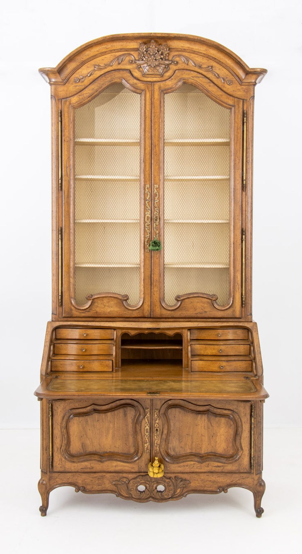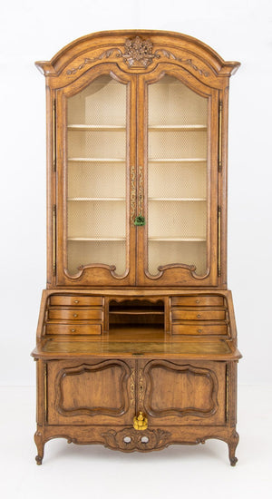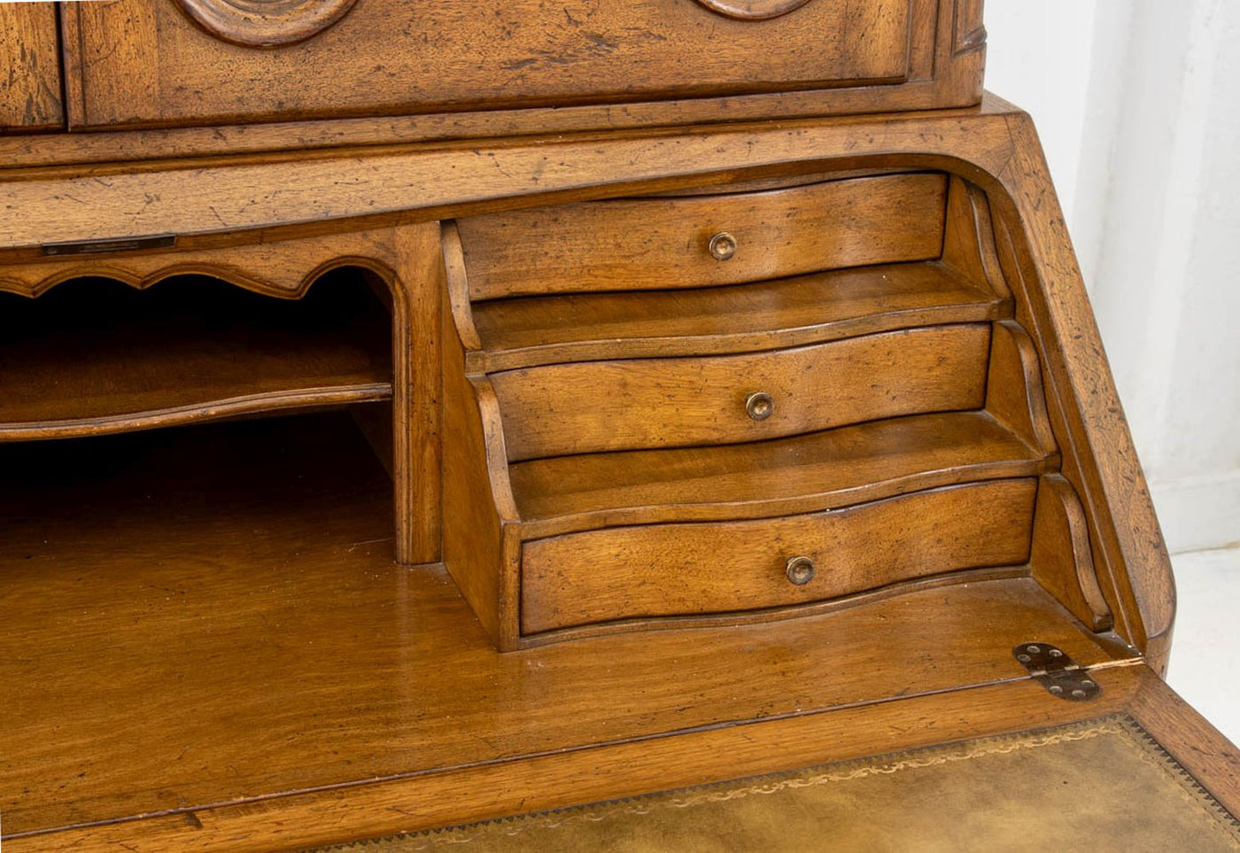 French Provincial Walnut Bureau Bookcase, in two pieces, the top portion with doors opening to five shelves, the bottom piece with slant door opening to gilt-tooled leather writing surface and drawers above a two-door cabinet, with "Fine French Furniture / Auffray & Co. / Inc. / 921 3rd Ave., N.Y.C." plaque label inside top drawer. 101" H x 49" W x 20" D. Provenance: From an Upper East Side Estate. Keywords: French Furniture, European Furniture, Storage, Bookshelf, Cupboard, Secretaire, Secretary, Interior design, Decorative Arts
