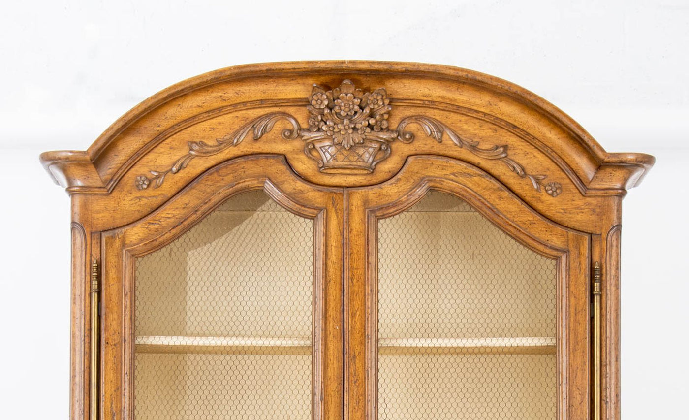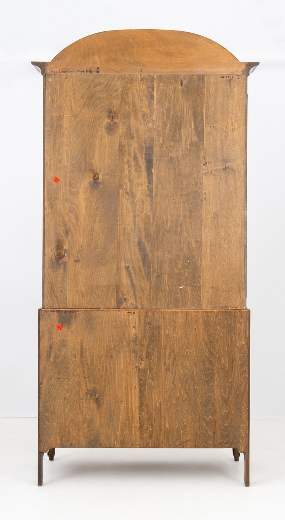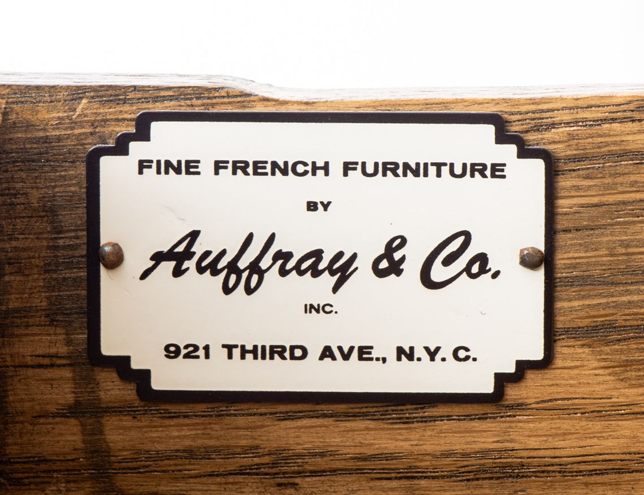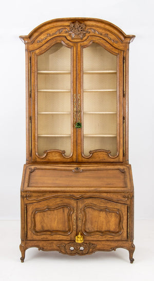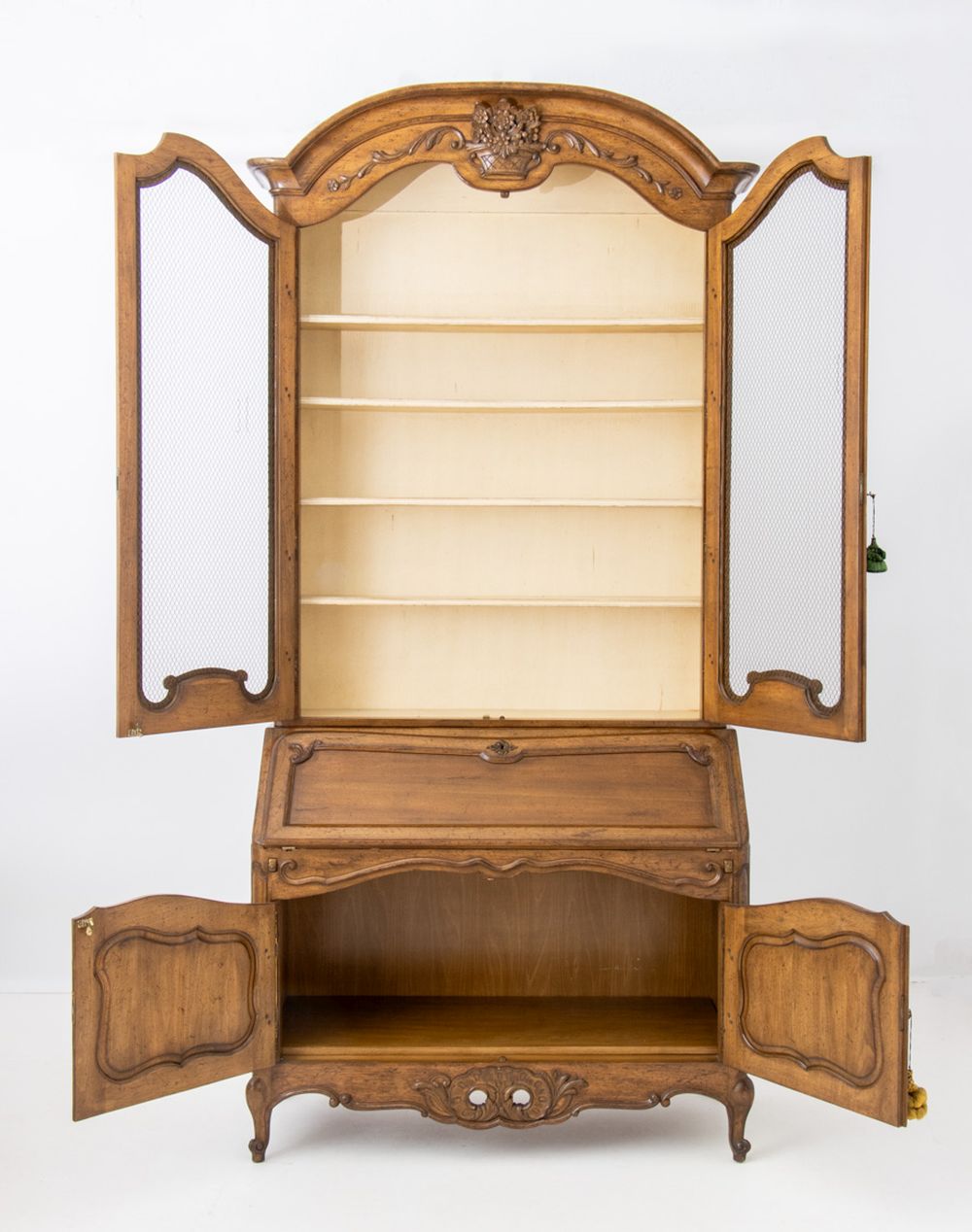 French Provincial Walnut Bureau Bookcase, in two pieces, the top portion with doors opening to five shelves, the bottom piece with slant door opening to gilt-tooled leather writing surface and drawers above a two-door cabinet, with "Fine French Furniture / Auffray & Co. / Inc. / 921 3rd Ave., N.Y.C." plaque label inside top drawer. 101" H x 49" W x 20" D. Provenance: From an Upper East Side Estate. Keywords: French Furniture, European Furniture, Storage, Bookshelf, Cupboard, Secretaire, Secretary, Interior design, Decorative Arts