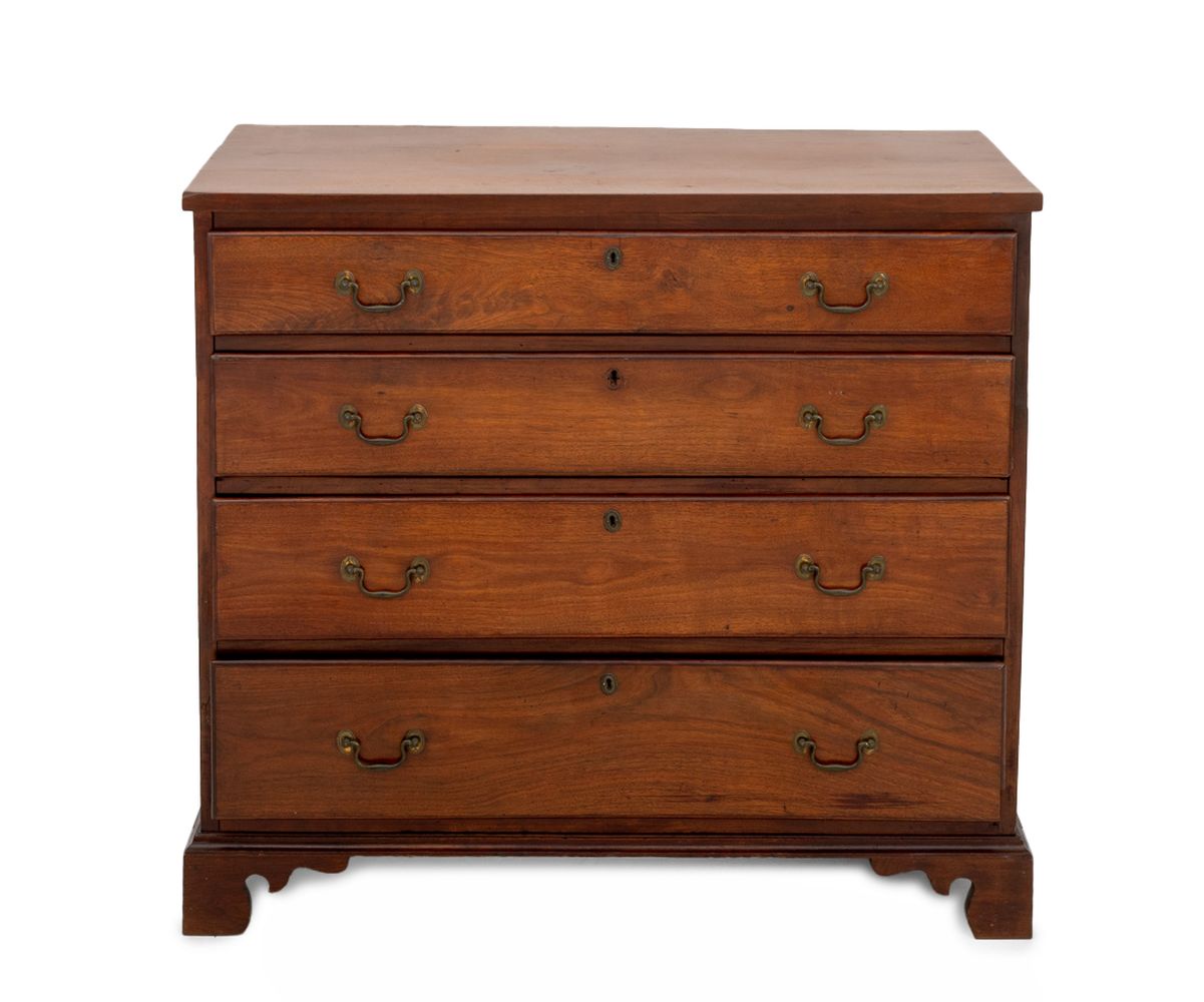 George III Style Mahogany Chest of Drawers, late 19th century, having four graduated drawers with brass handles on four bracket feet. 35.25" H x 39" W x 19.25" D. Provenance: From a Park Avenue Collection. Keyword: Antique Furniture, Commode, Dresser, Bureau, Storage, Georgian, English, British, Interior design, Decorative Arts